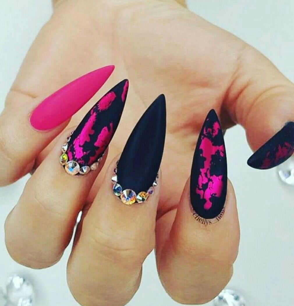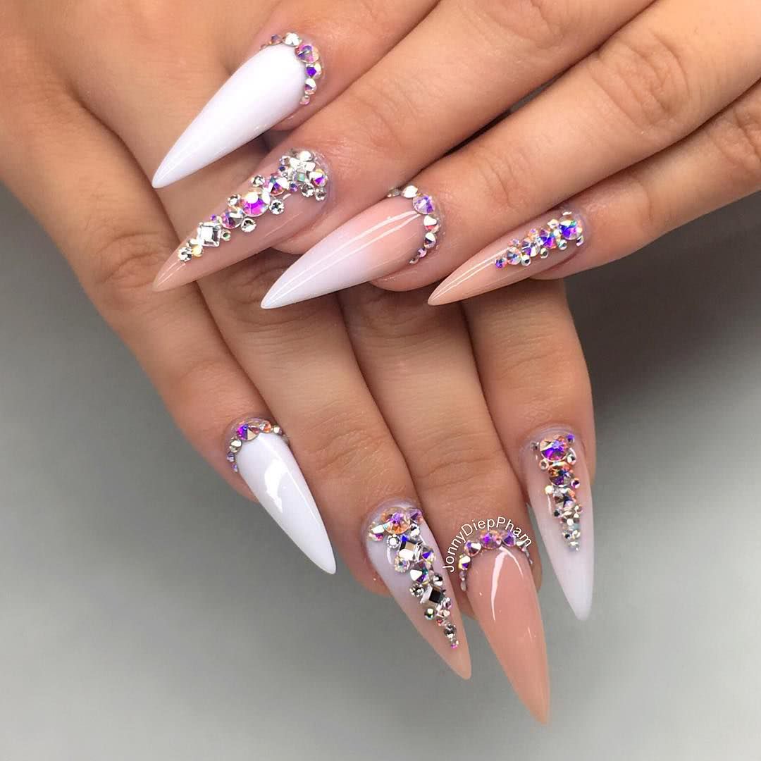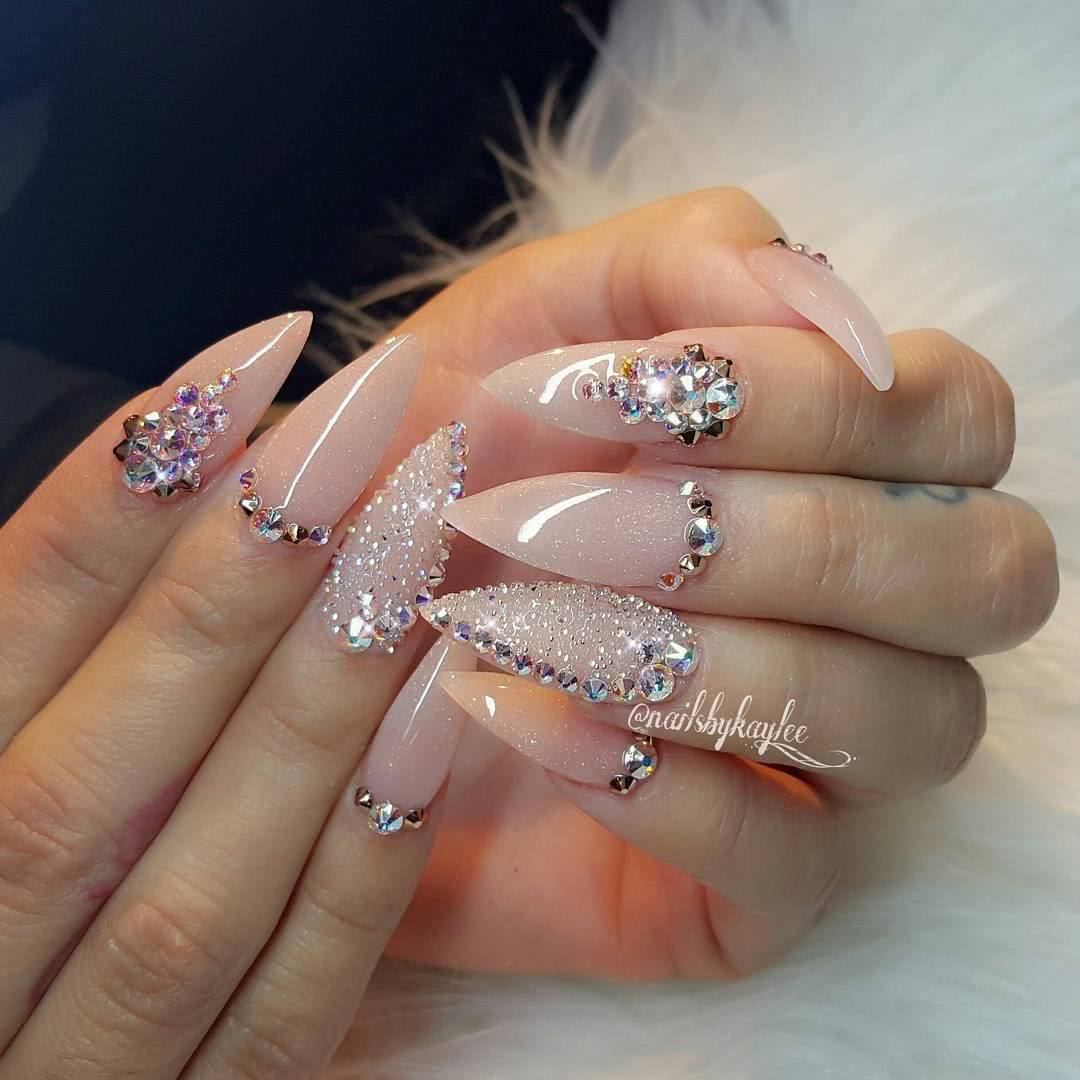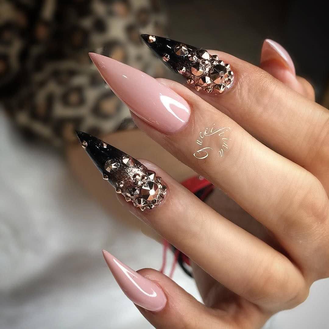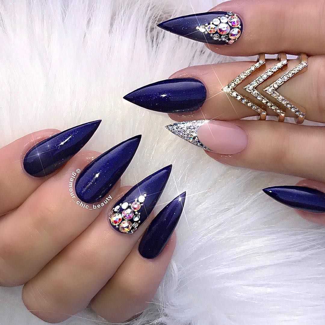 Острые ногти – выбор далеко не каждой женщины. Форма ногтей смотрится очень выразительно и заметно, к тому же часто нуждается в коррекции. Если вы счастливая обладательница острых ногтей, то не бойтесь экспериментировать с декором. Предлагаем вам большую фото-подборку шикарных идей острого маникюр со стразами. Выбирайте и создавайте подобные нейл-арты на своих ноготках.