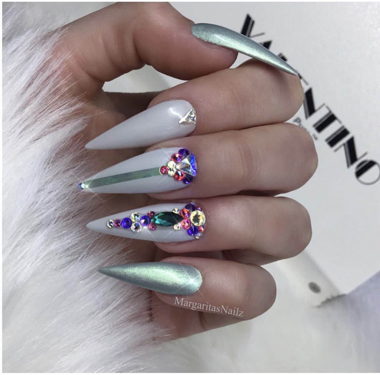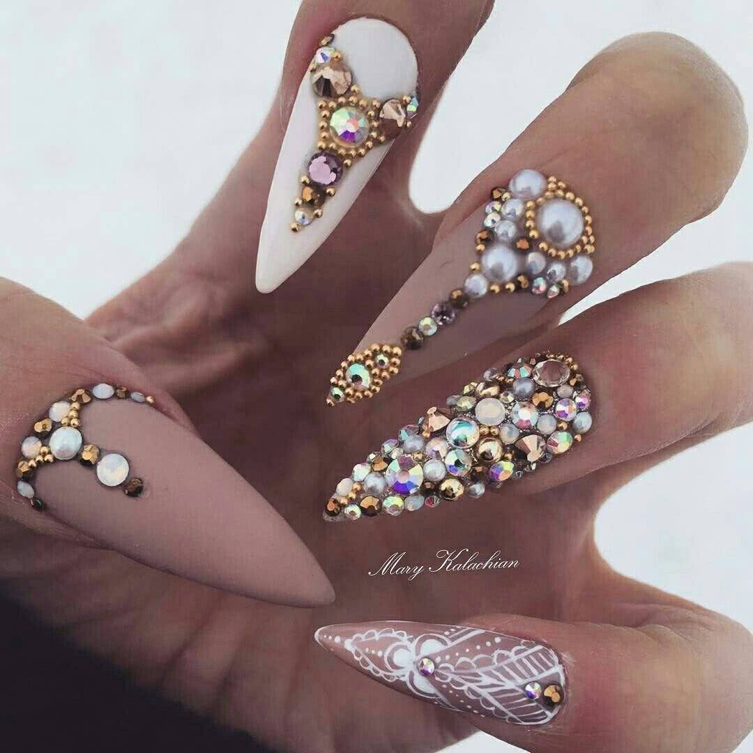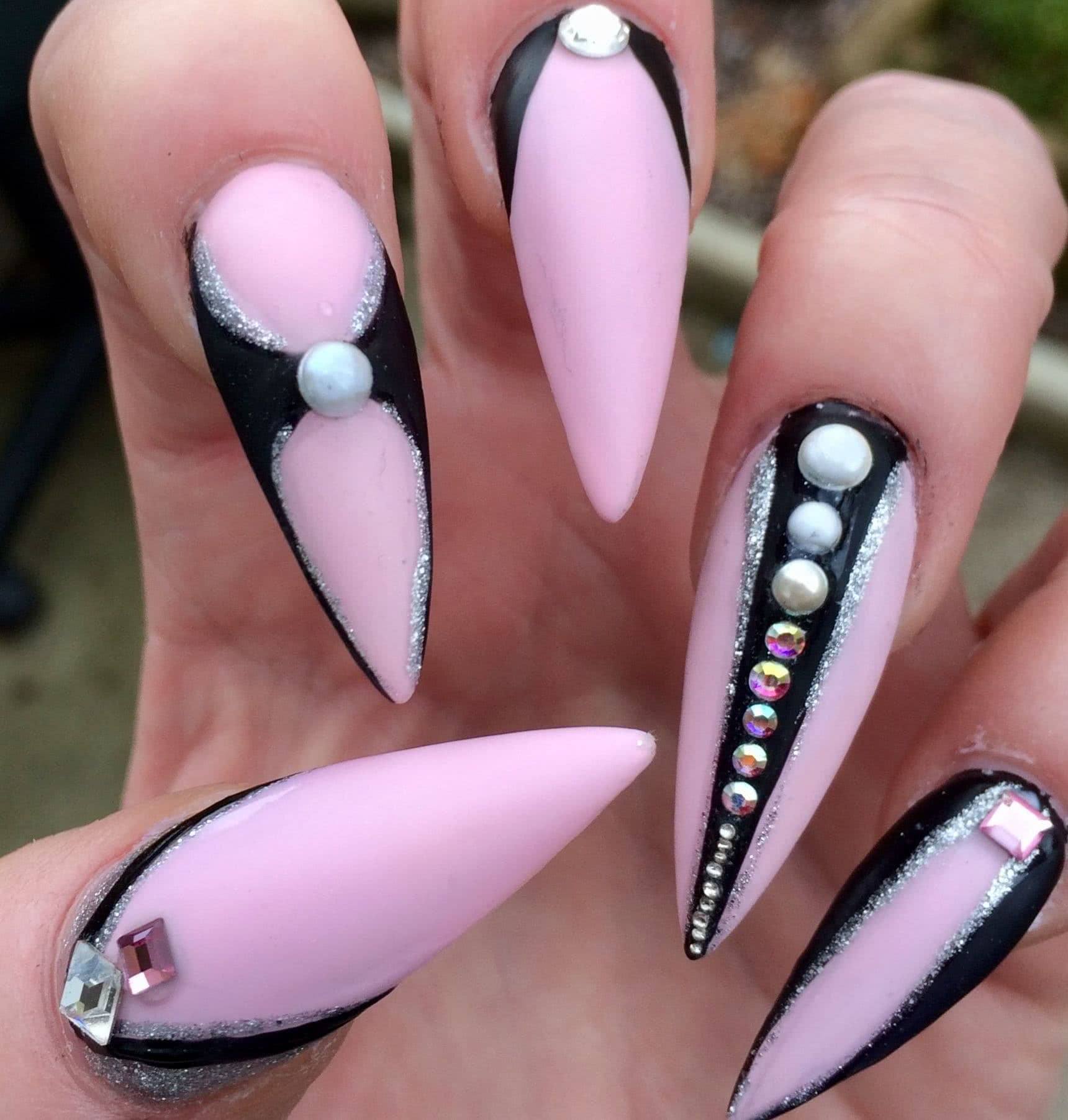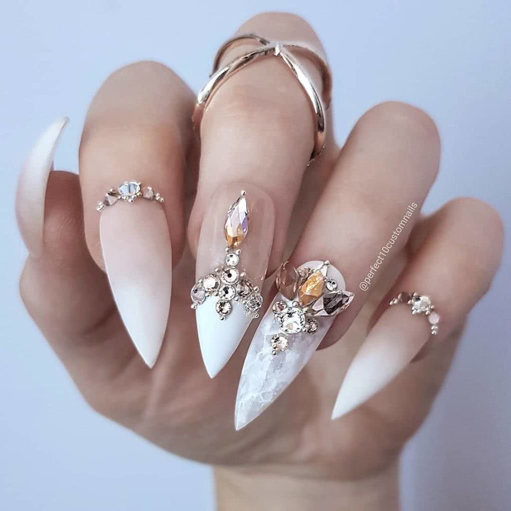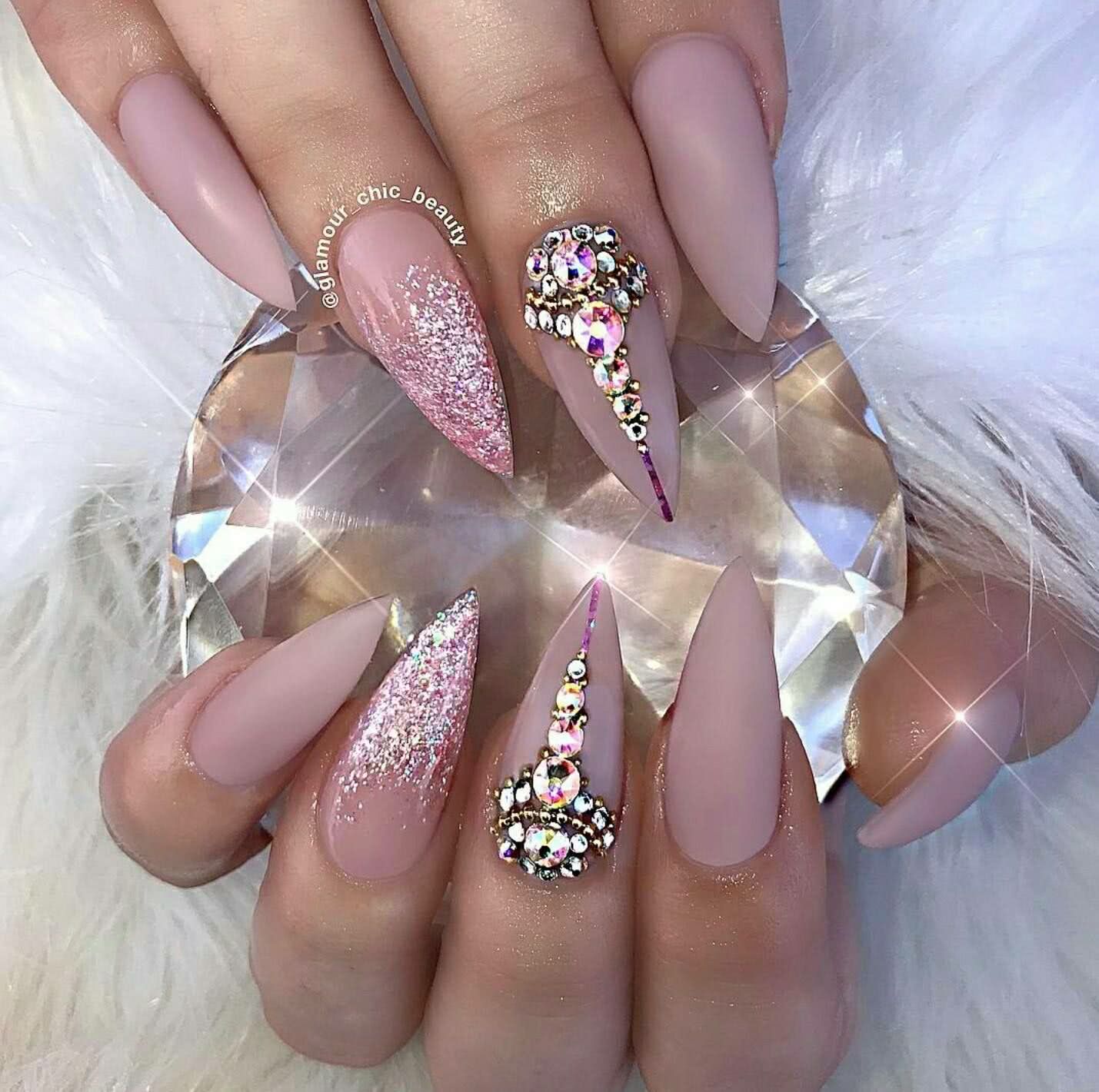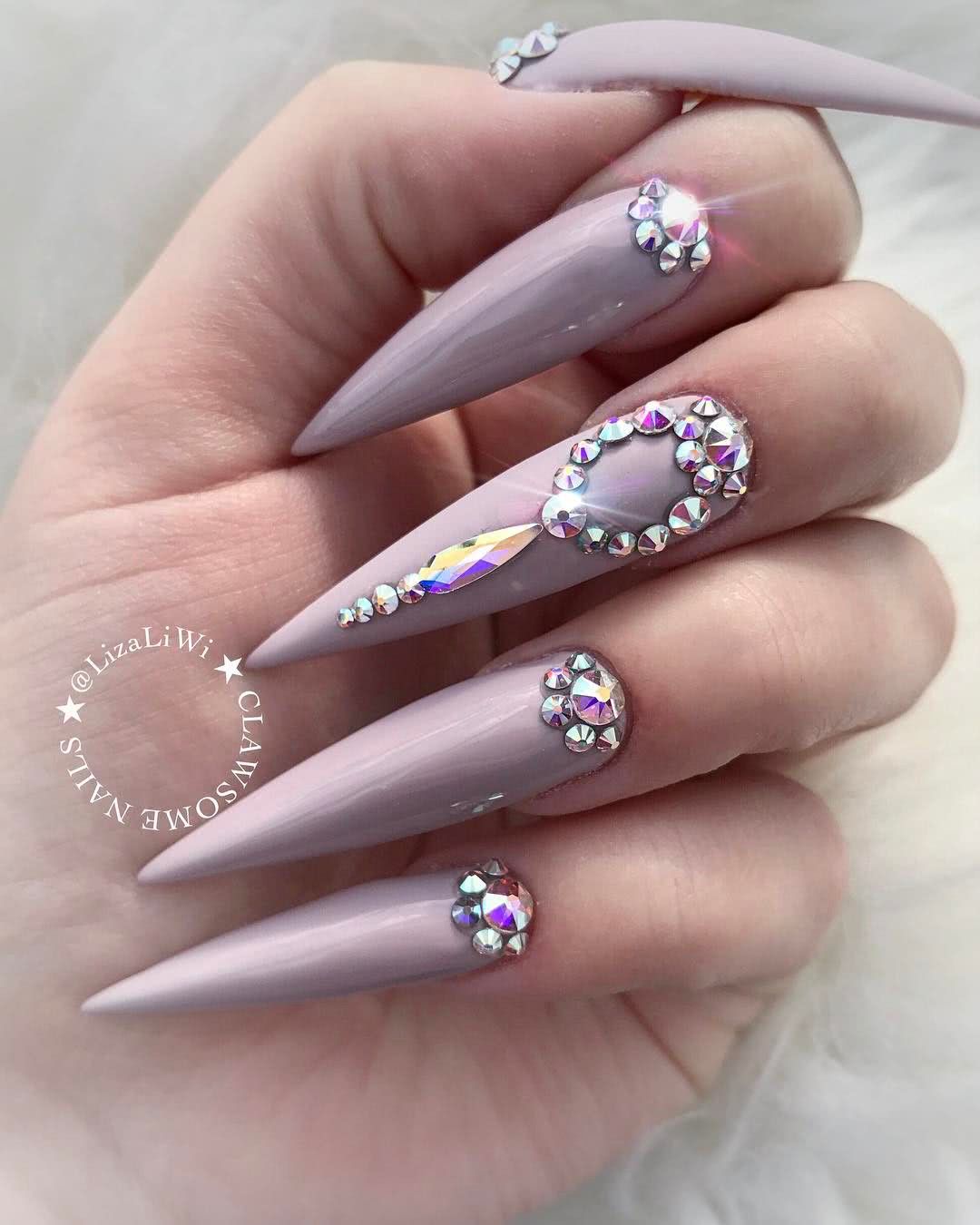 Острые ногти – выбор далеко не каждой женщины. Форма ногтей смотрится очень выразительно и заметно, к тому же часто нуждается в коррекции. Если вы счастливая обладательница острых ногтей, то не бойтесь экспериментировать с декором. Предлагаем вам большую фото-подборку шикарных идей острого маникюр со стразами. Выбирайте и создавайте подобные нейл-арты на своих ноготках.