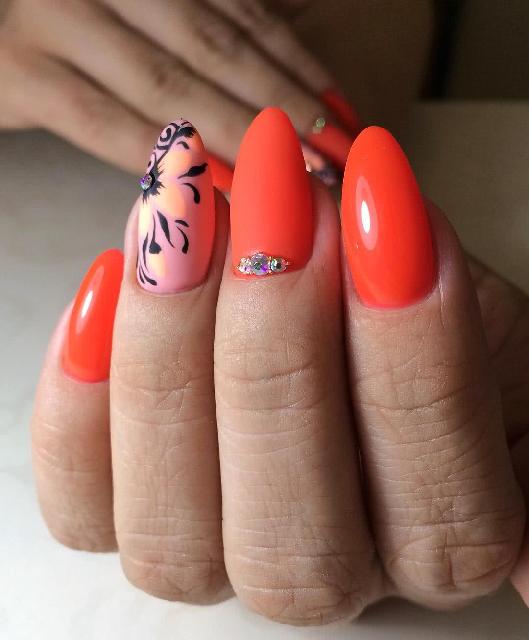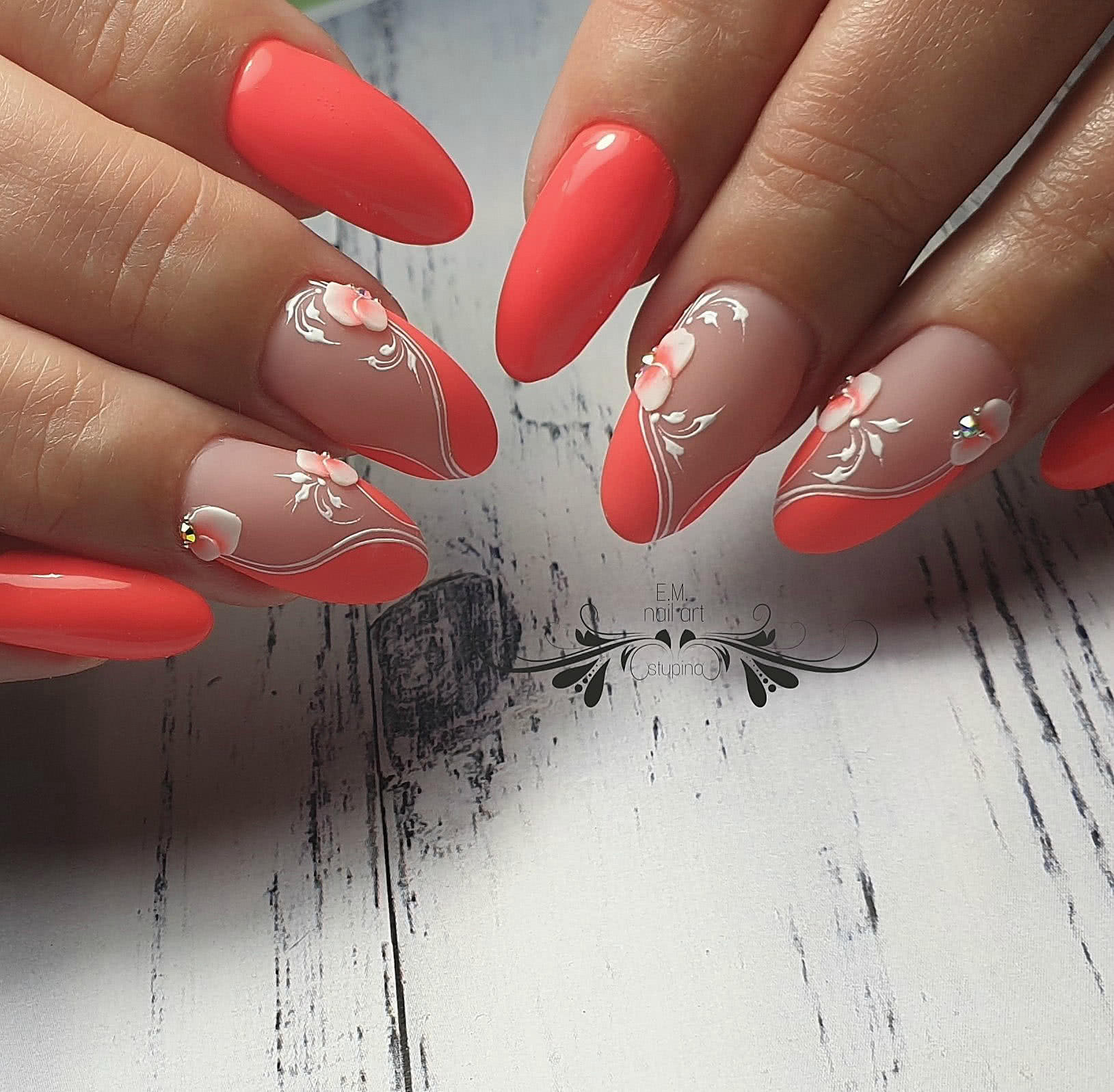 Присмотритесь к французскому маникюру в коралловом и белом цветах. Также отлично смотрится дизайн с кружевом. Узор, также как и в черном цвете, лучше располагать на 1-2 ноготках. При желании дополните коралловый и белый цвет черным оттенком. Используйте темный цвет для выделения геометрического декора.