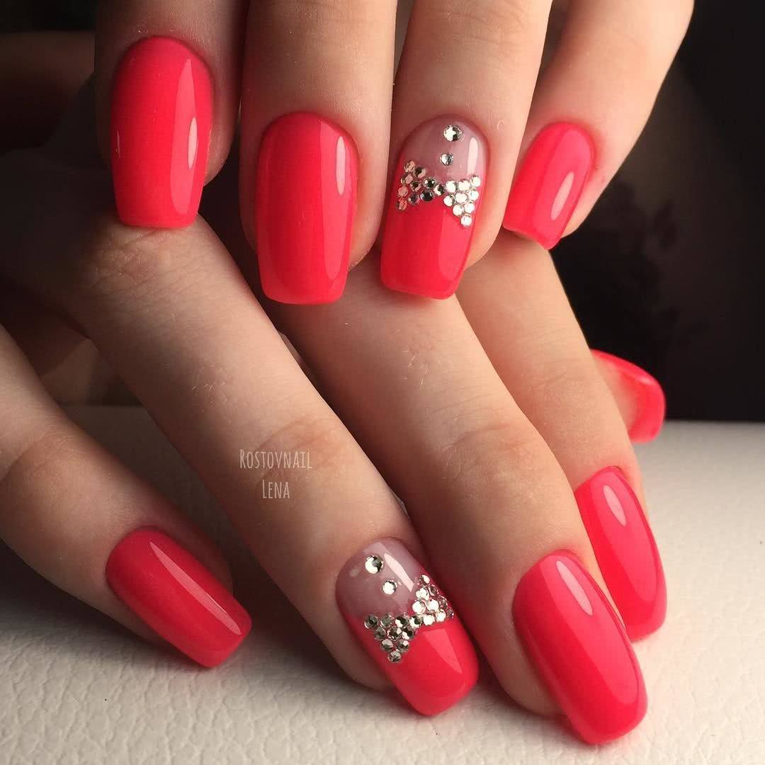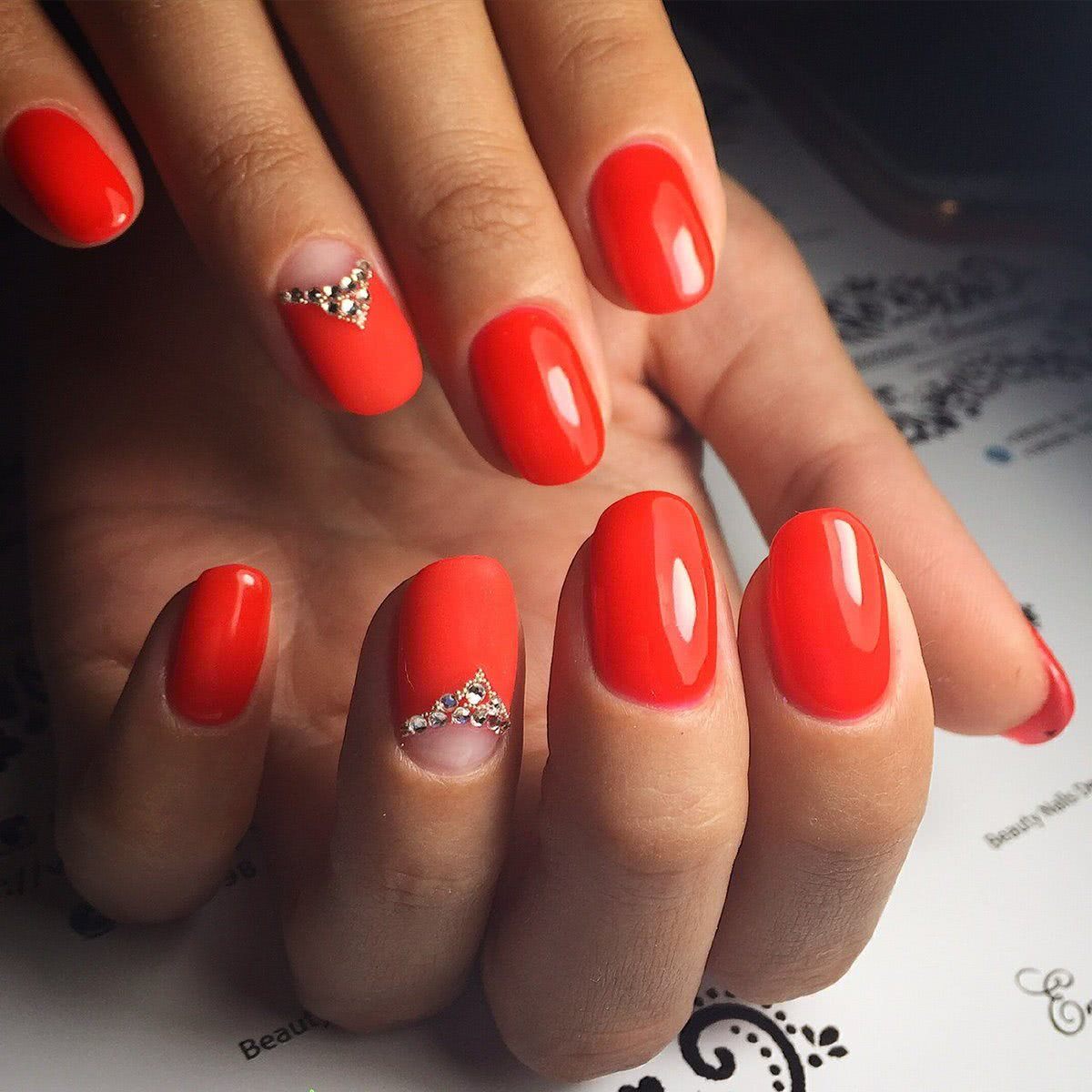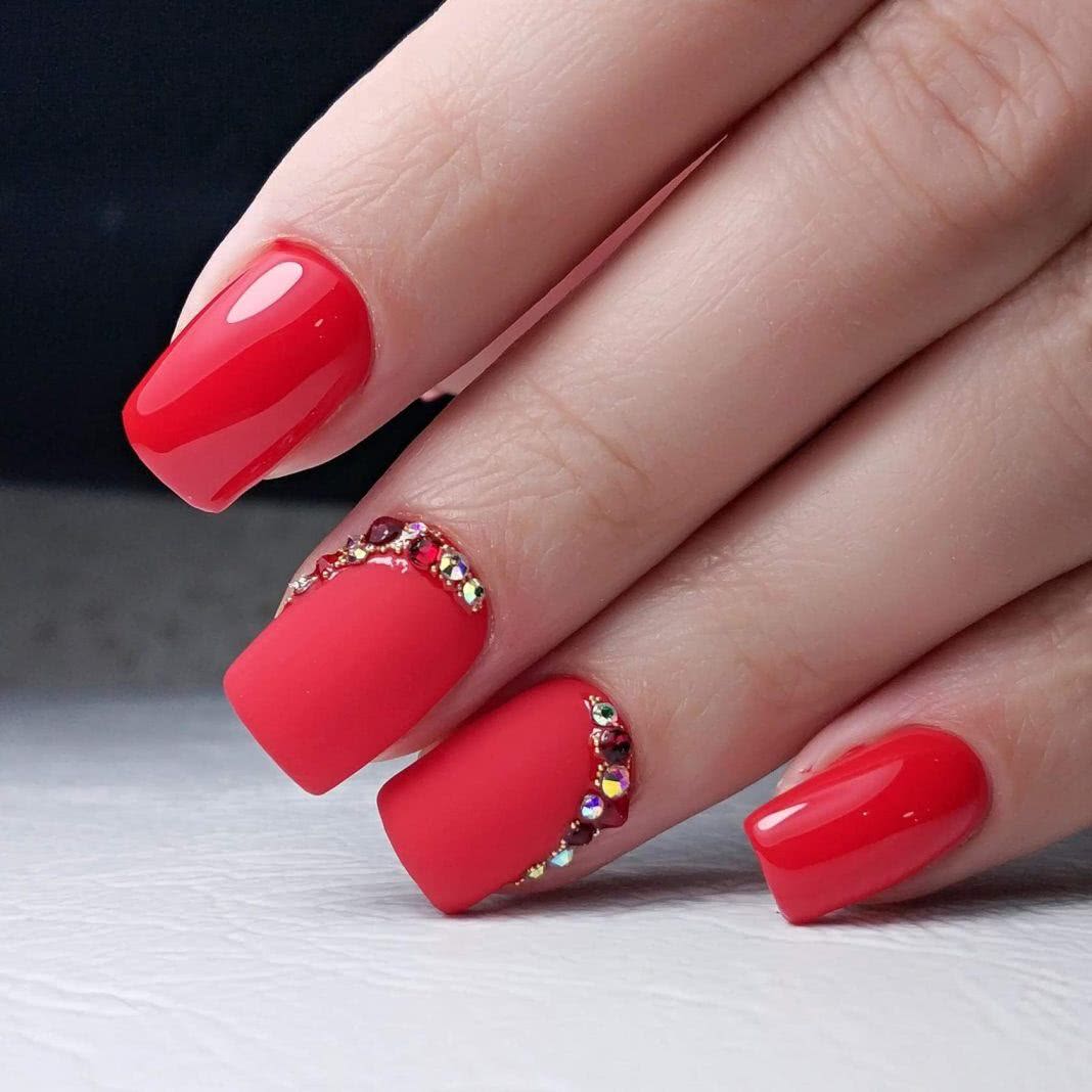Яркий алый цвет – выбор уверенных в себе женщин. Прекрасно дополнят образ стразы на красных ногтях, выложенные определенным узором. Точечно можно расположить украшения другого подходящего цвета, например, черные или золотые, которые будут гармонировать с основным оттенком.