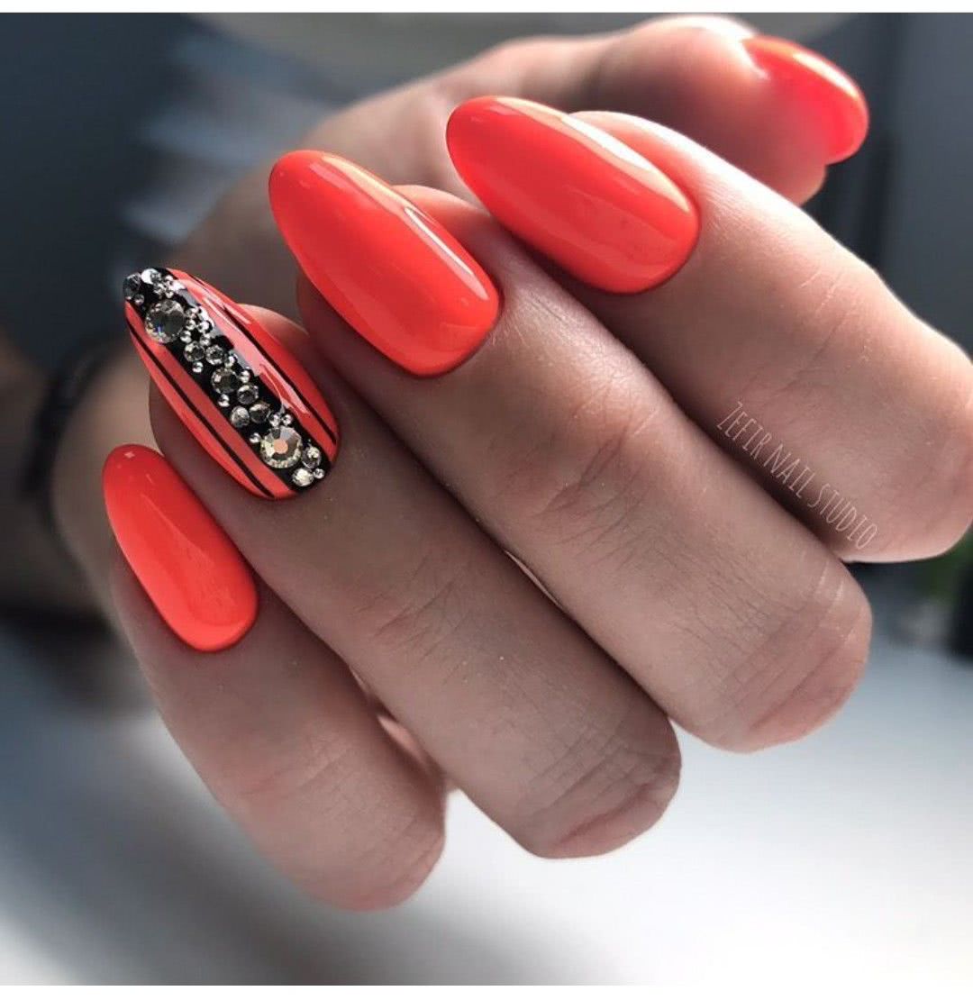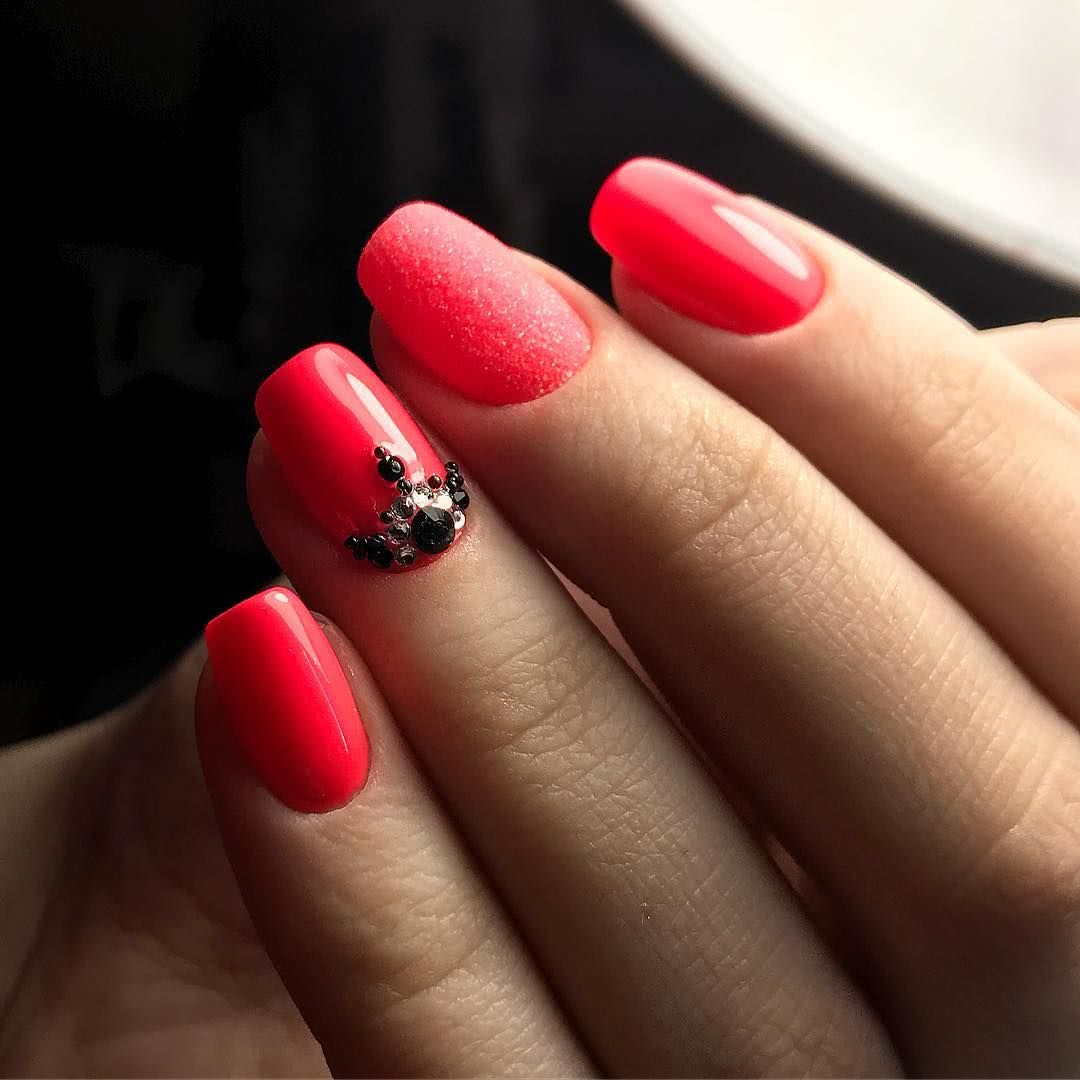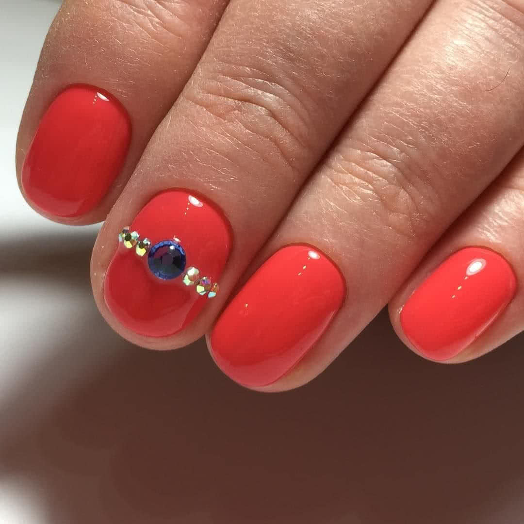 Яркий алый цвет – выбор уверенных в себе женщин. Прекрасно дополнят образ стразы на красных ногтях, выложенные определенным узором. Точечно можно расположить украшения другого подходящего цвета, например, черные или золотые, которые будут гармонировать с основным оттенком.