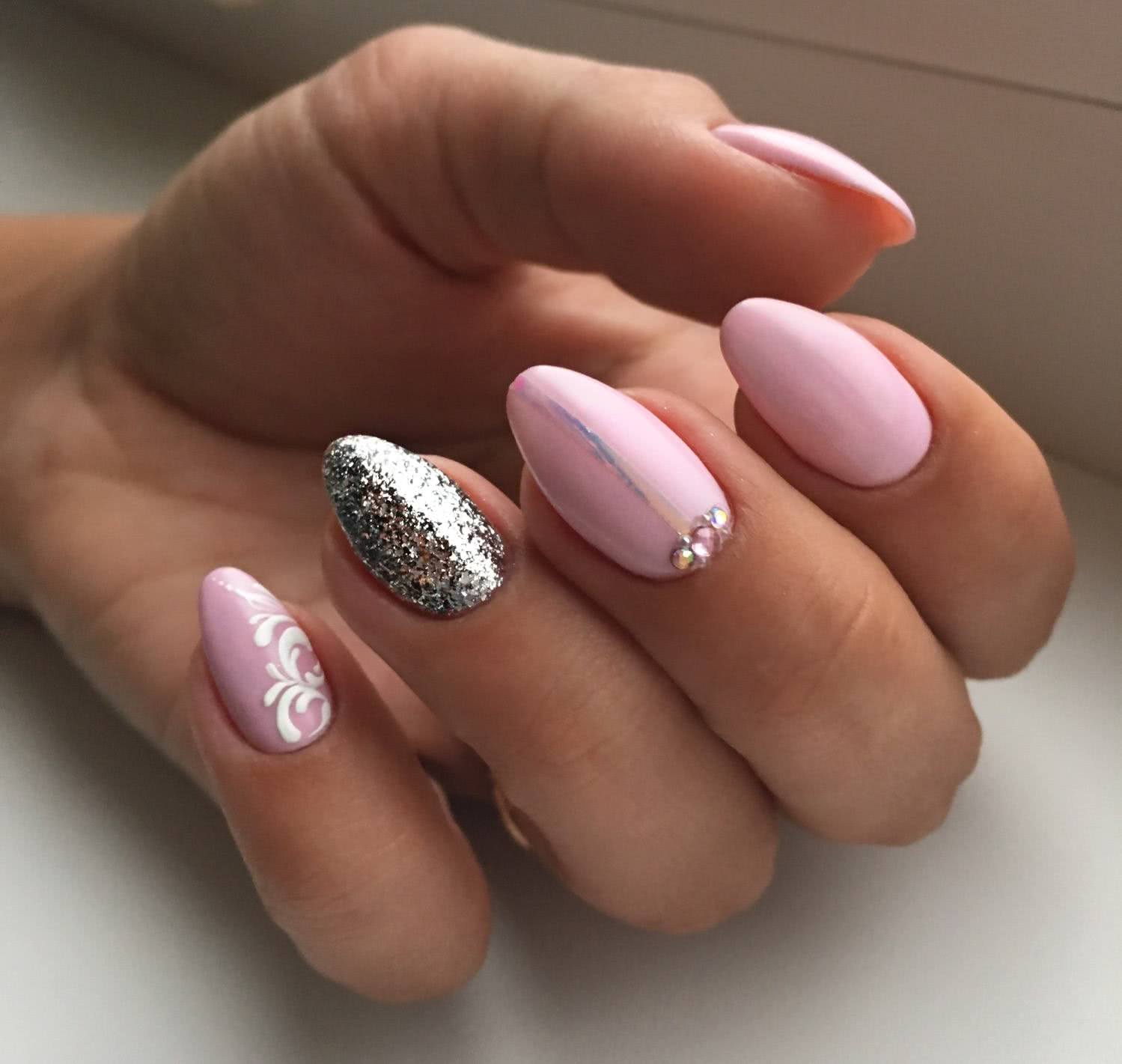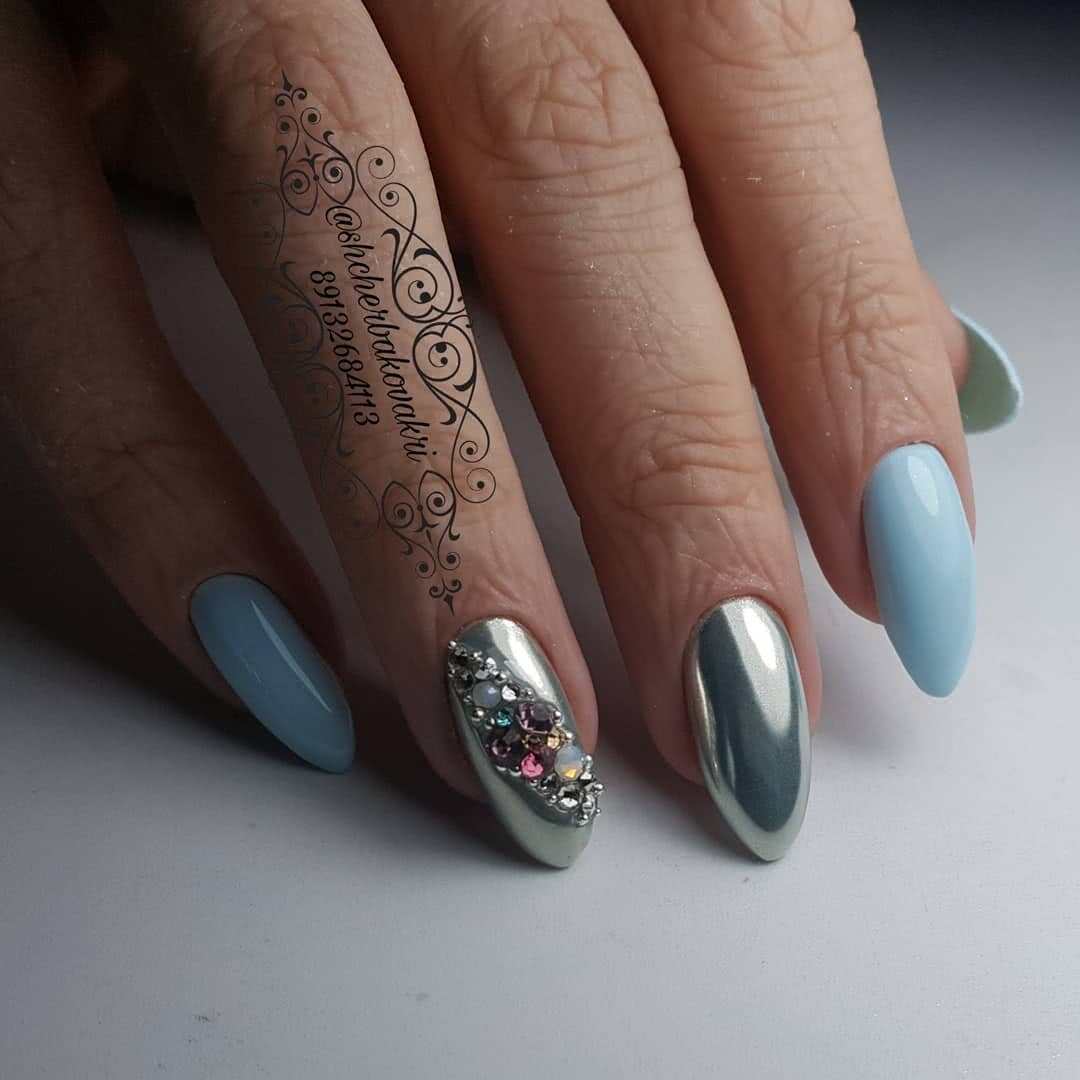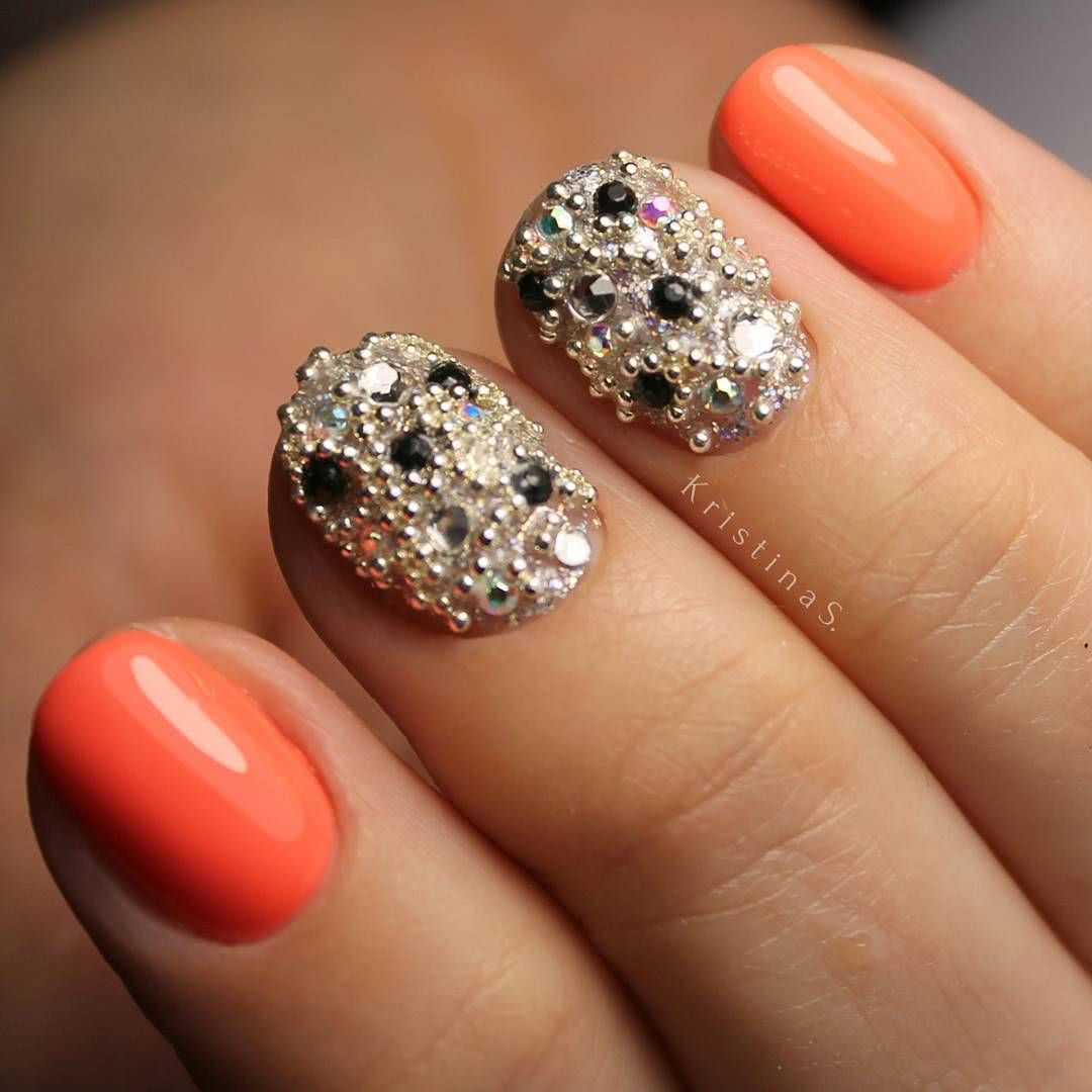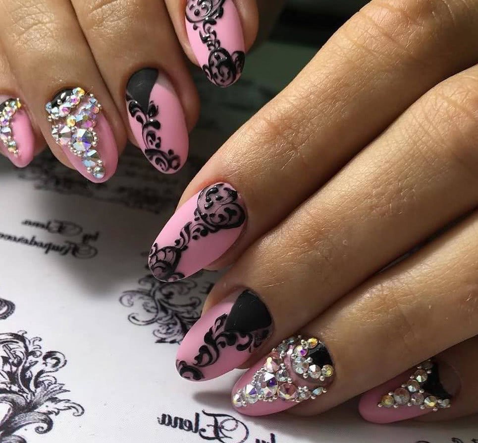 Имена подобная манера исполнения будет уместна для любой длины и формы ногтей. Для украшения подойдут камни, бусины, стразы.