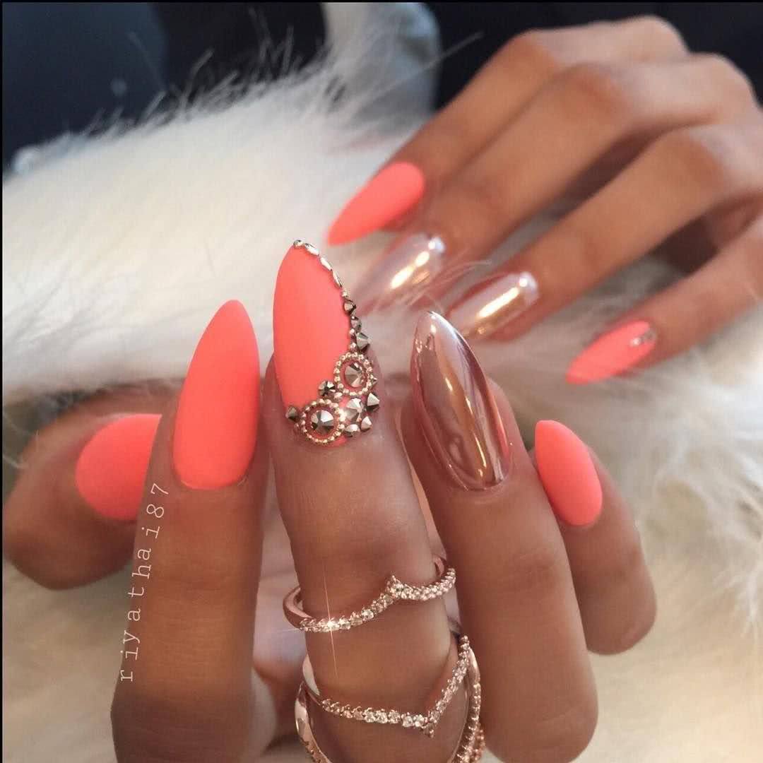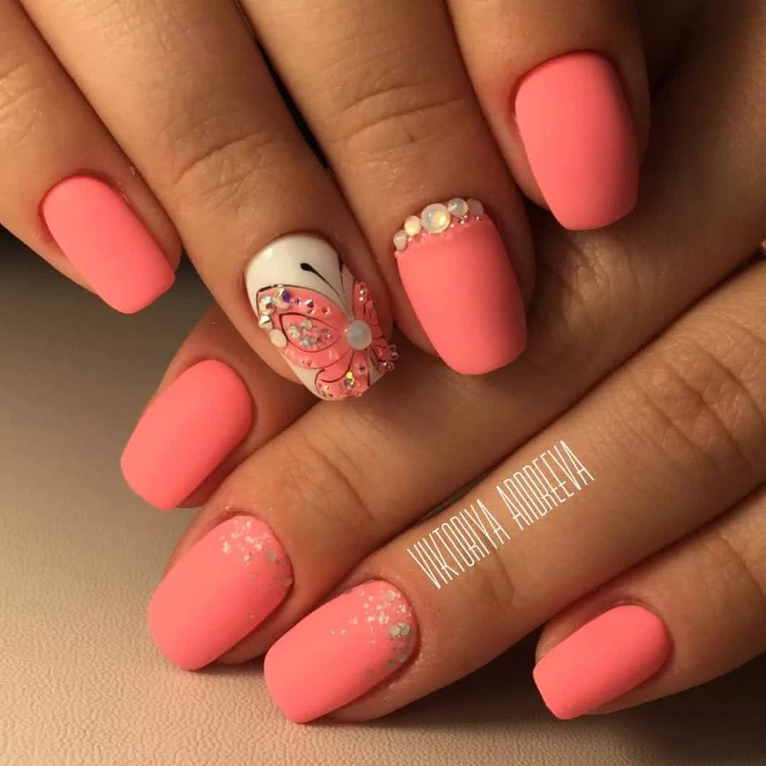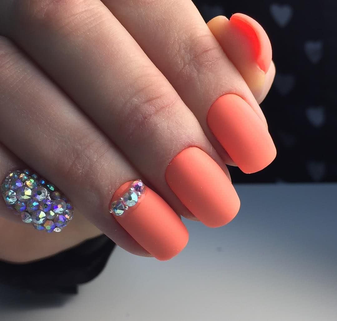 Независимо от выбранного цвета, матовость придает ноготкам шероховатости. Матовый коралловый смотрится благородно и дорого. Он гармонично вольется в вечерний праздничный образ.