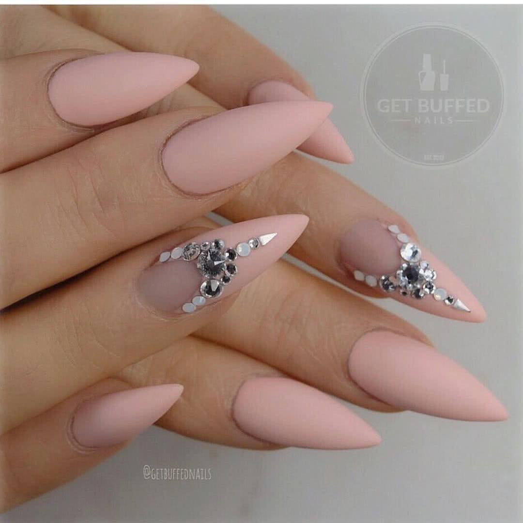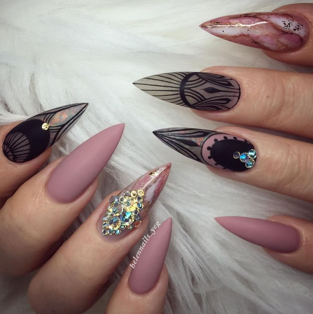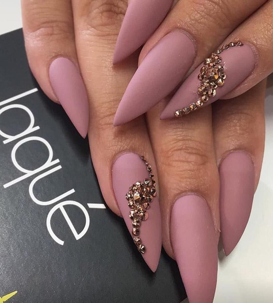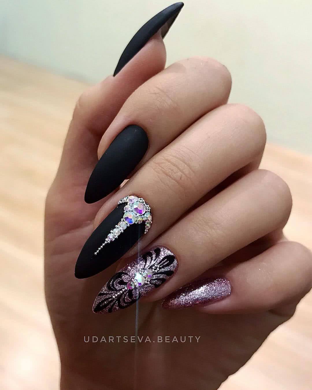 Обладательницы длинных ногтей хорошо знают как облагородить и смягчить свои нейл-арты. Для этого они используют матовую текстуру, меланж, “сахарок” и другой материал, придающий ноготкам бархатистую нежность. Матовый маникюр на острых ногтях может быть выполнен в темных насыщенных оттенках. Чаще всего для дизайна используют бордовый и черный цвета. Стразы располагают классическим способом: в прикорневой зоне, посередине ногтя полоской, поперек ногтя, в виде волны.