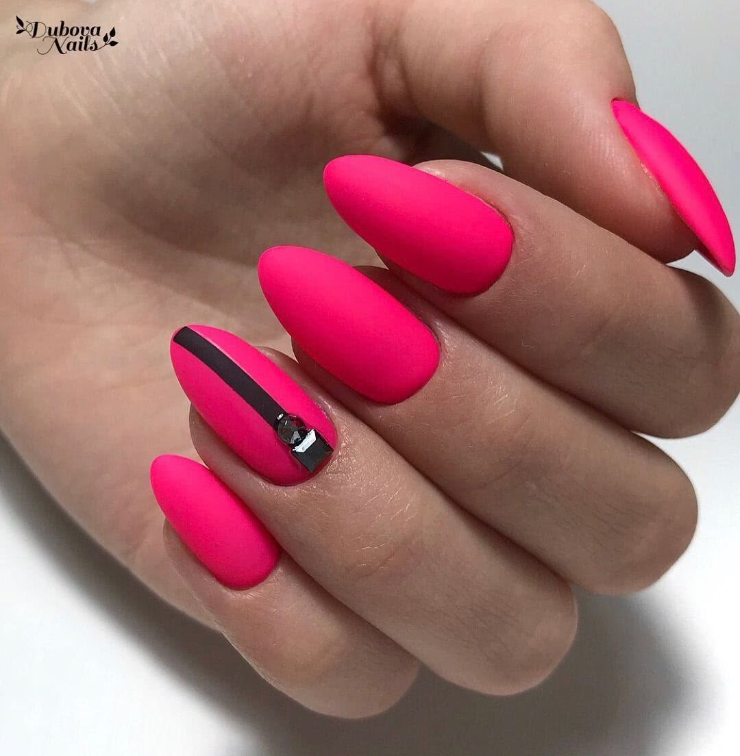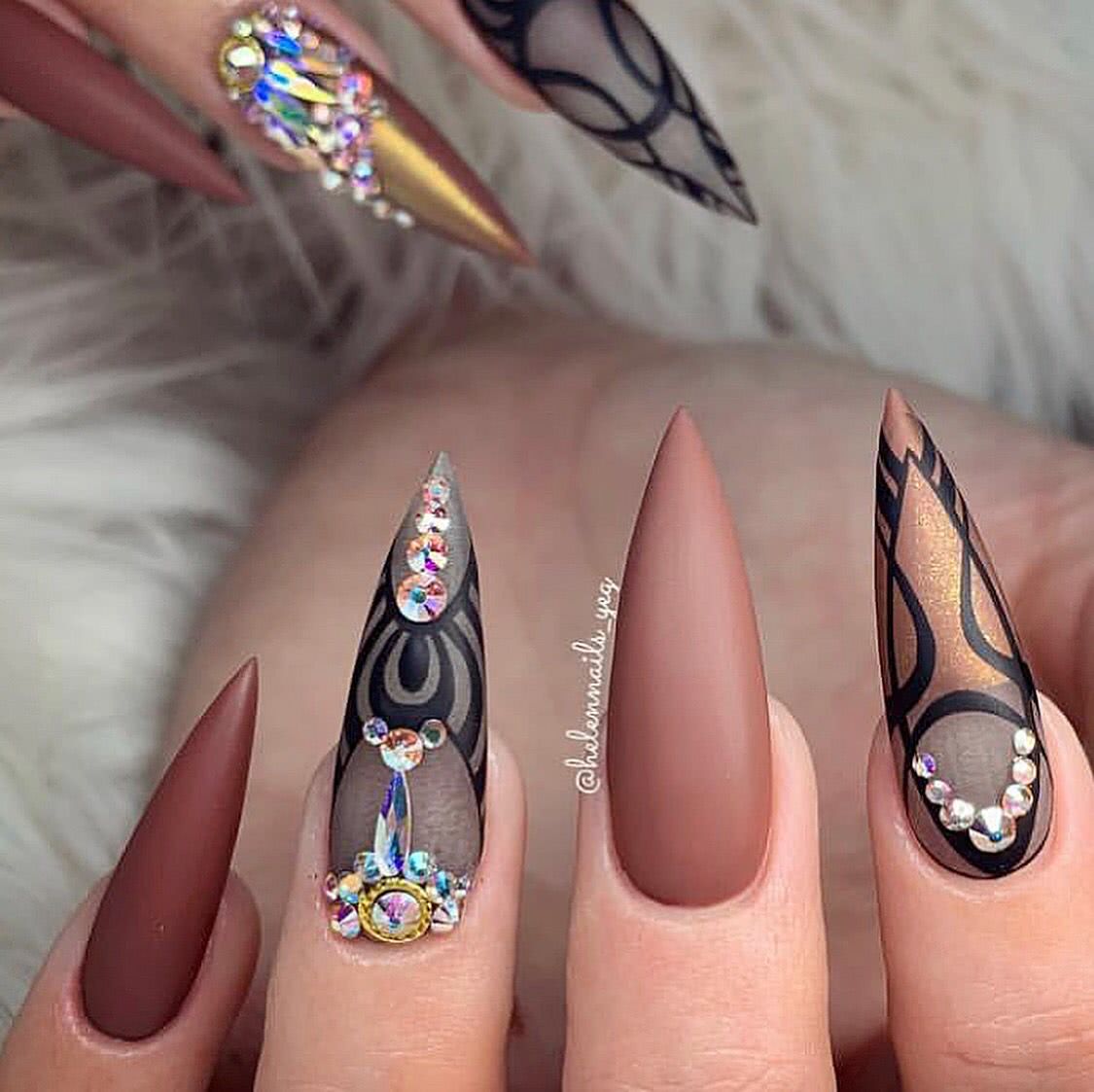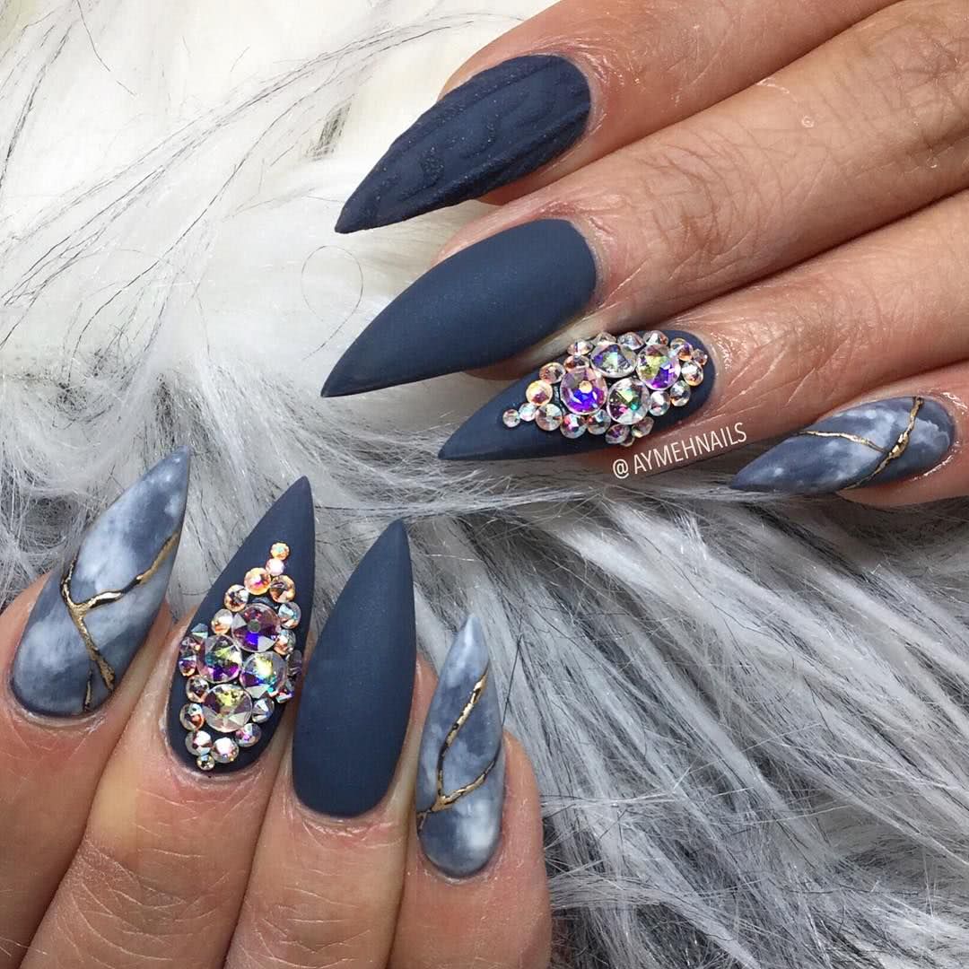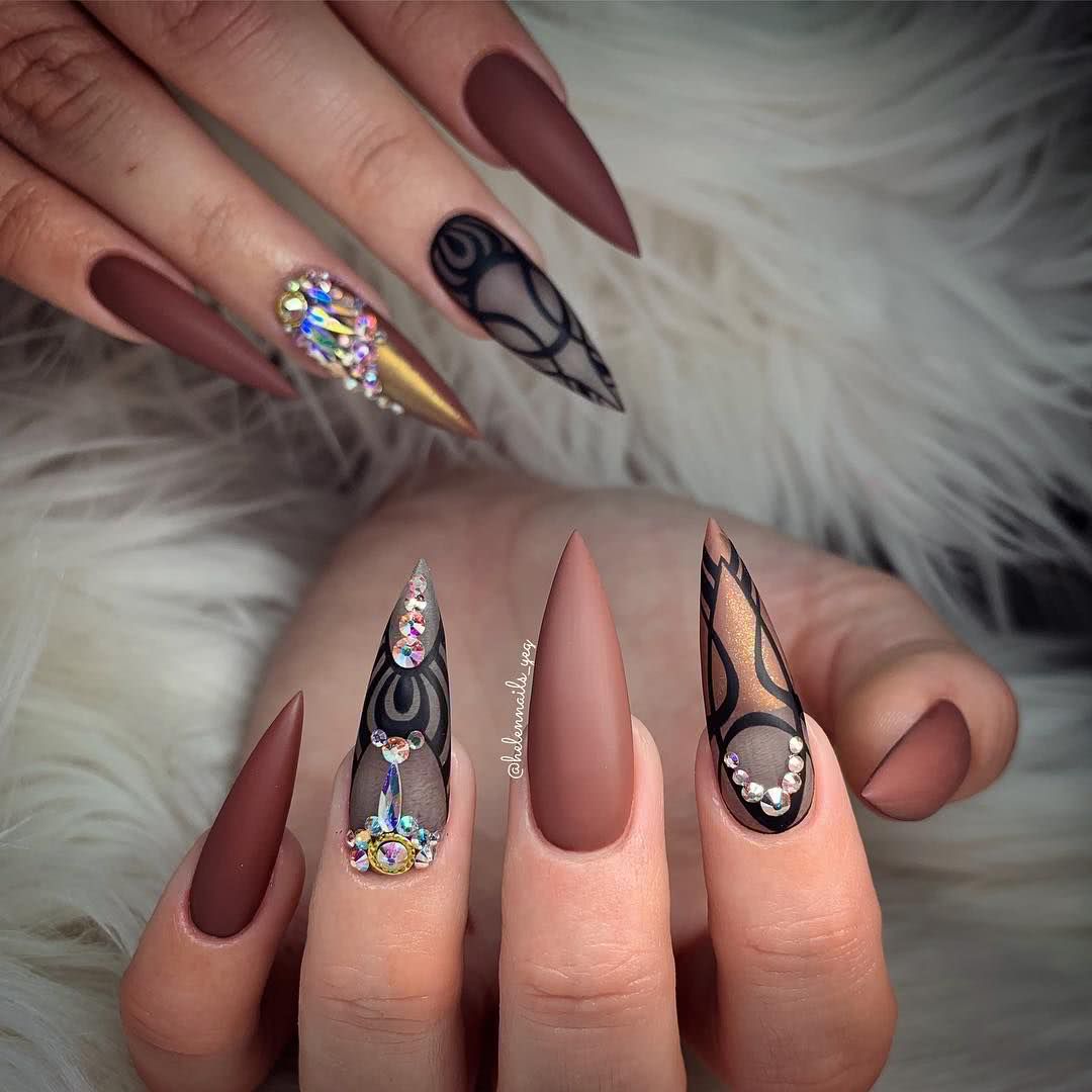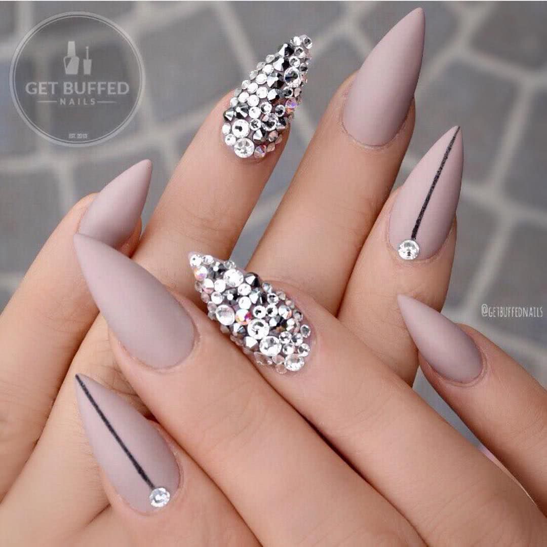 Обладательницы длинных ногтей хорошо знают как облагородить и смягчить свои нейл-арты. Для этого они используют матовую текстуру, меланж, “сахарок” и другой материал, придающий ноготкам бархатистую нежность. Матовый маникюр на острых ногтях может быть выполнен в темных насыщенных оттенках. Чаще всего для дизайна используют бордовый и черный цвета. Стразы располагают классическим способом: в прикорневой зоне, посередине ногтя полоской, поперек ногтя, в виде волны.