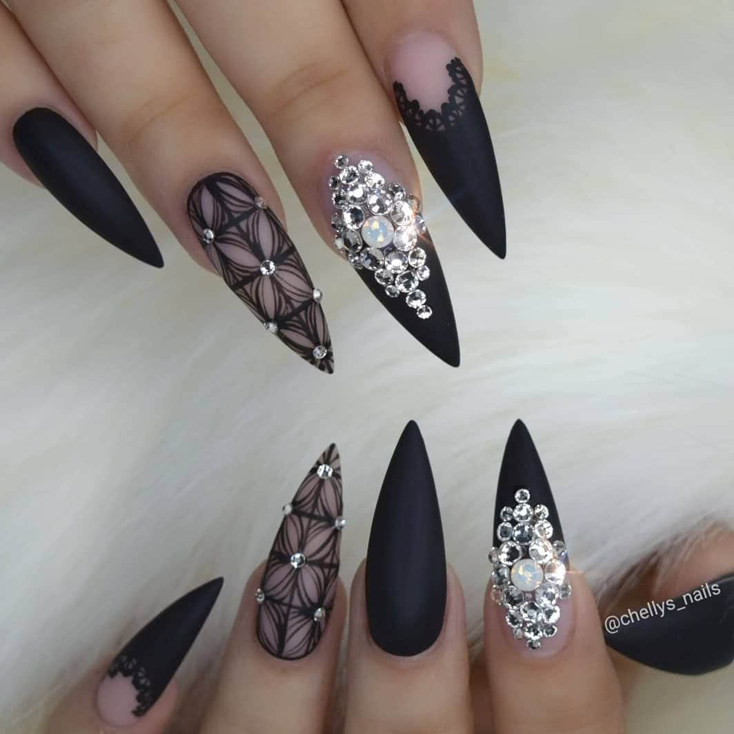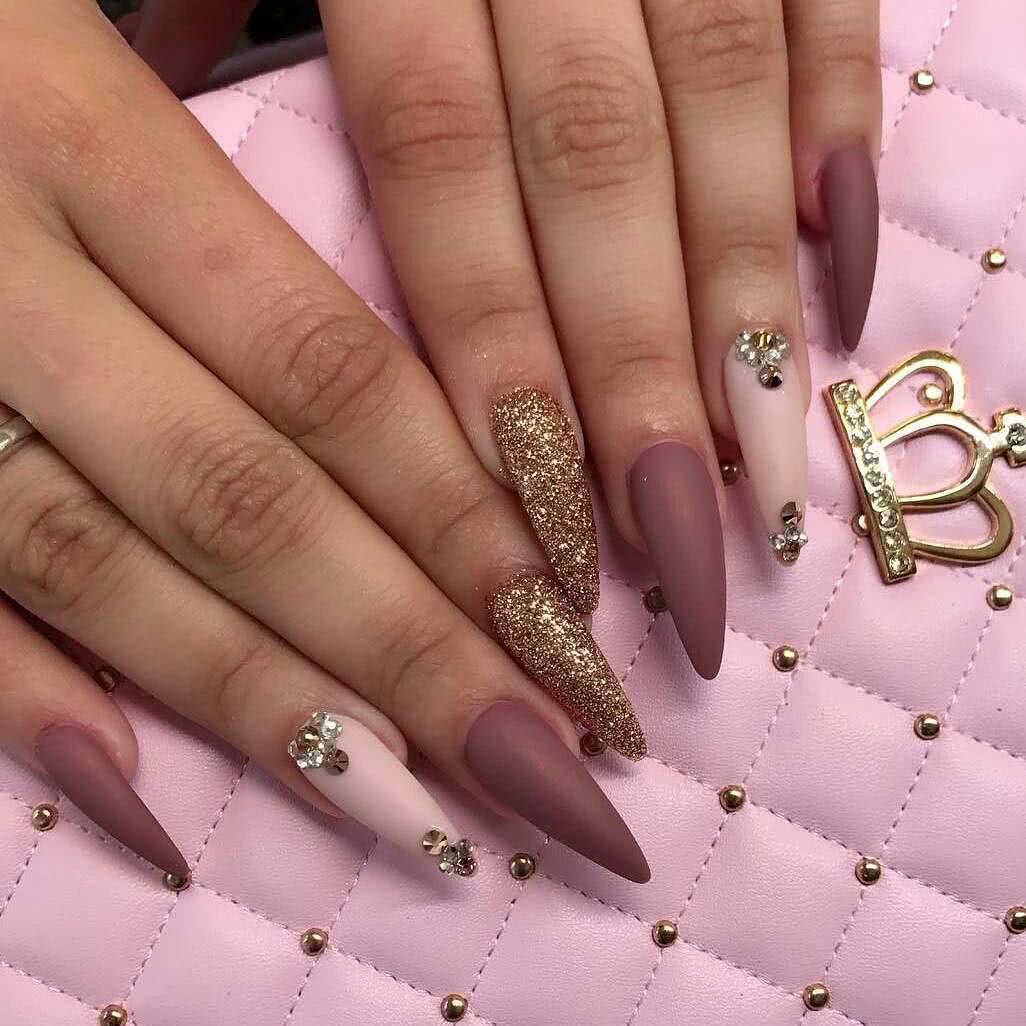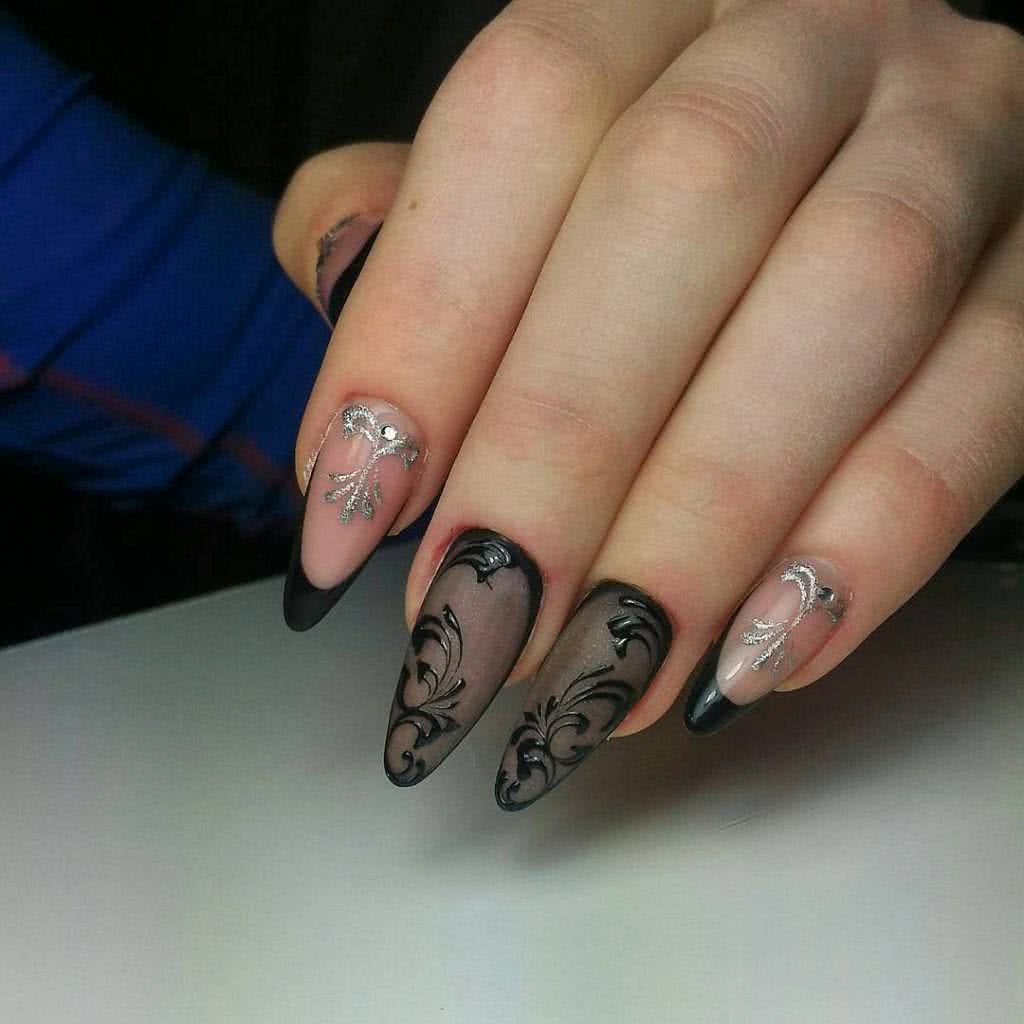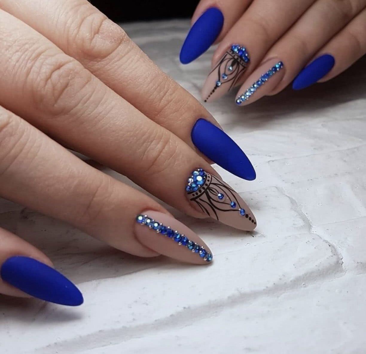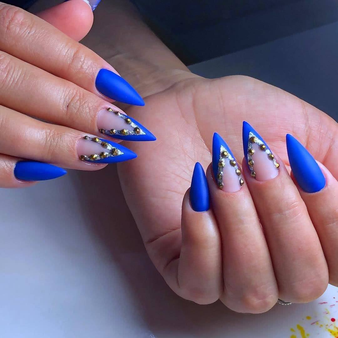 Обладательницы длинных ногтей хорошо знают как облагородить и смягчить свои нейл-арты. Для этого они используют матовую текстуру, меланж, “сахарок” и другой материал, придающий ноготкам бархатистую нежность. Матовый маникюр на острых ногтях может быть выполнен в темных насыщенных оттенках. Чаще всего для дизайна используют бордовый и черный цвета. Стразы располагают классическим способом: в прикорневой зоне, посередине ногтя полоской, поперек ногтя, в виде волны.