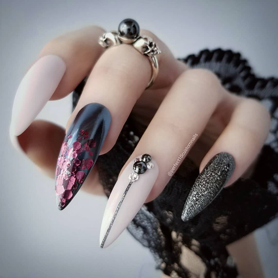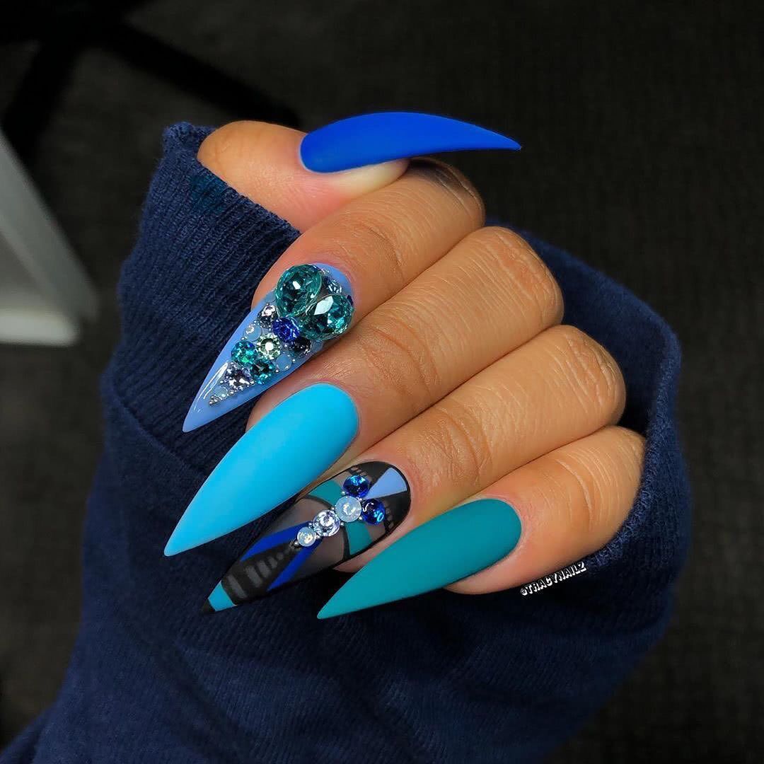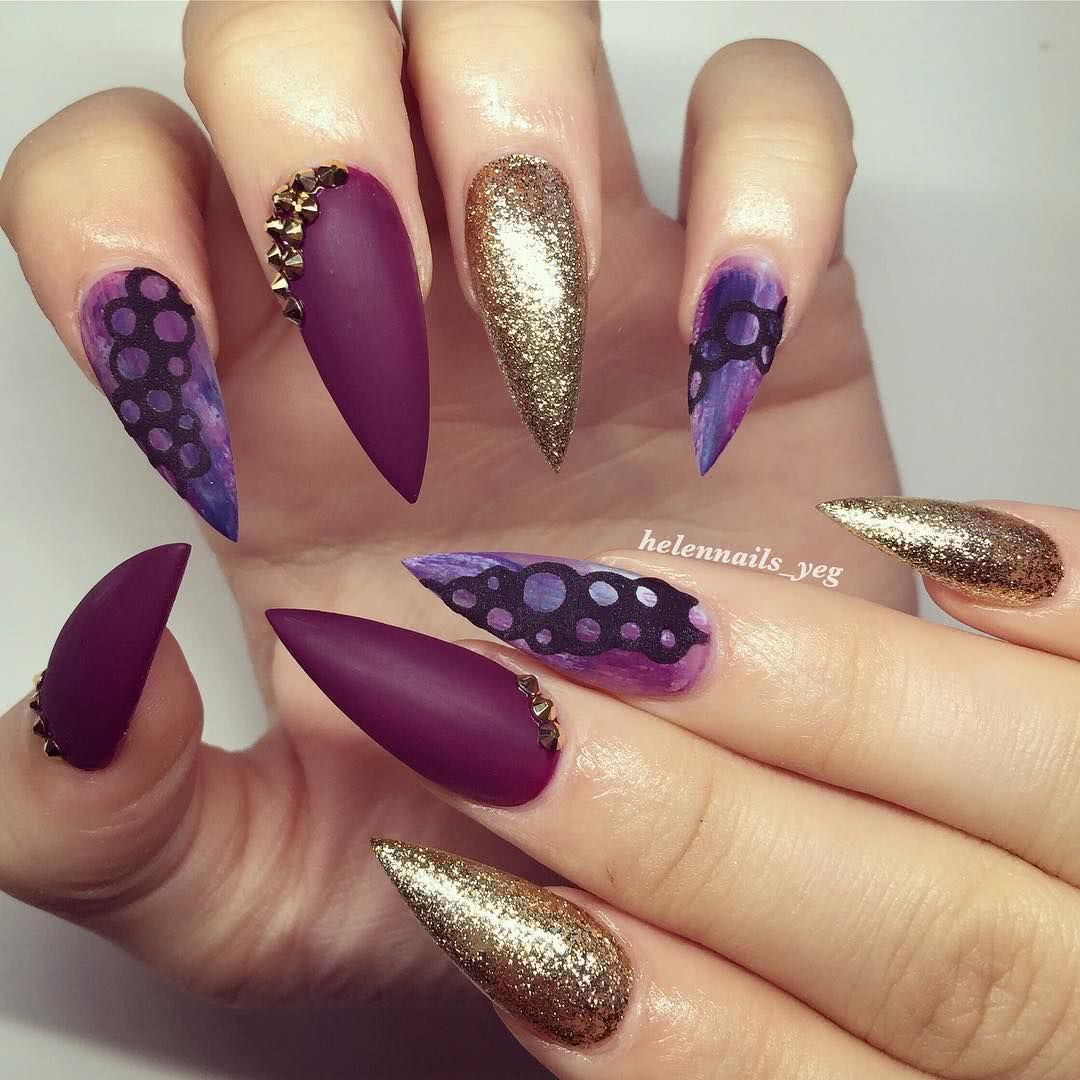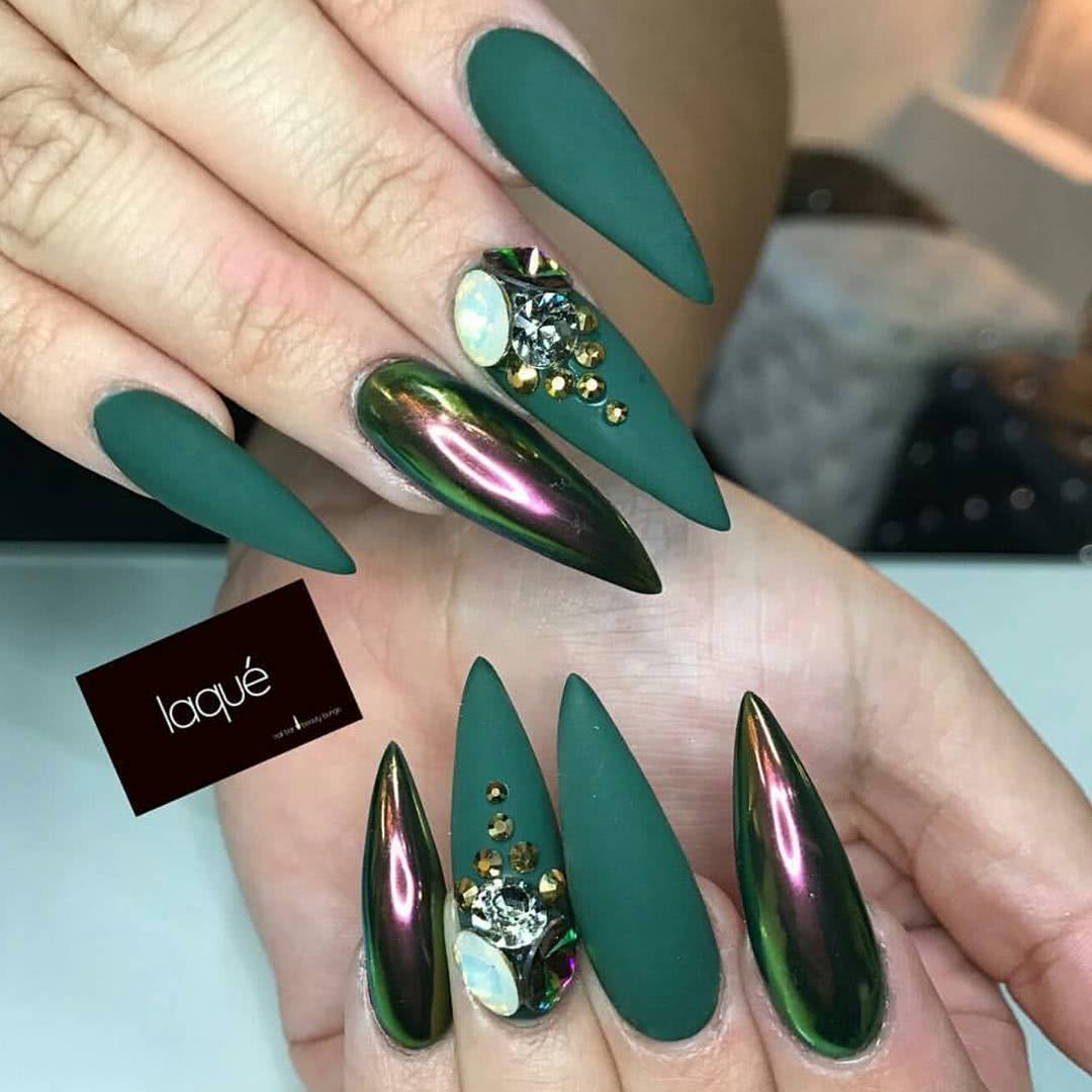 Обладательницы длинных ногтей хорошо знают как облагородить и смягчить свои нейл-арты. Для этого они используют матовую текстуру, меланж, “сахарок” и другой материал, придающий ноготкам бархатистую нежность. Матовый маникюр на острых ногтях может быть выполнен в темных насыщенных оттенках. Чаще всего для дизайна используют бордовый и черный цвета. Стразы располагают классическим способом: в прикорневой зоне, посередине ногтя полоской, поперек ногтя, в виде волны.