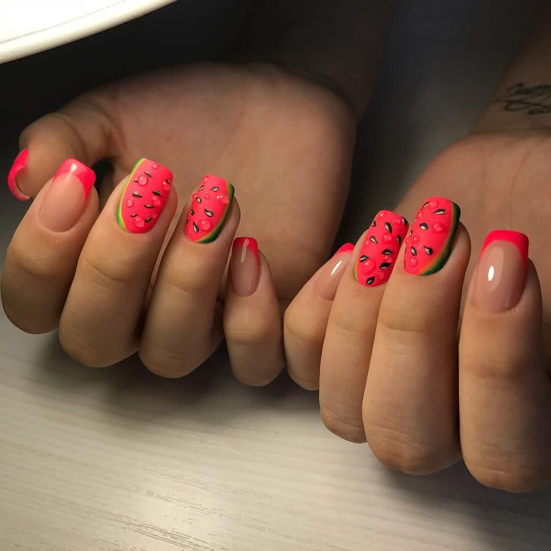 Очень красиво и оригинально смотрятся рисунки фруктов и ягод в сочетании с красным дизайном. Но, такой вариант дизайна более подойдет для летнего маникюра.