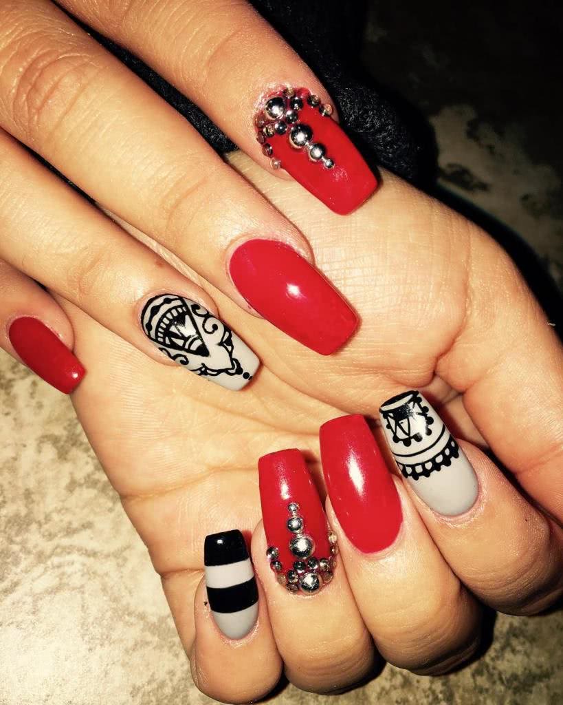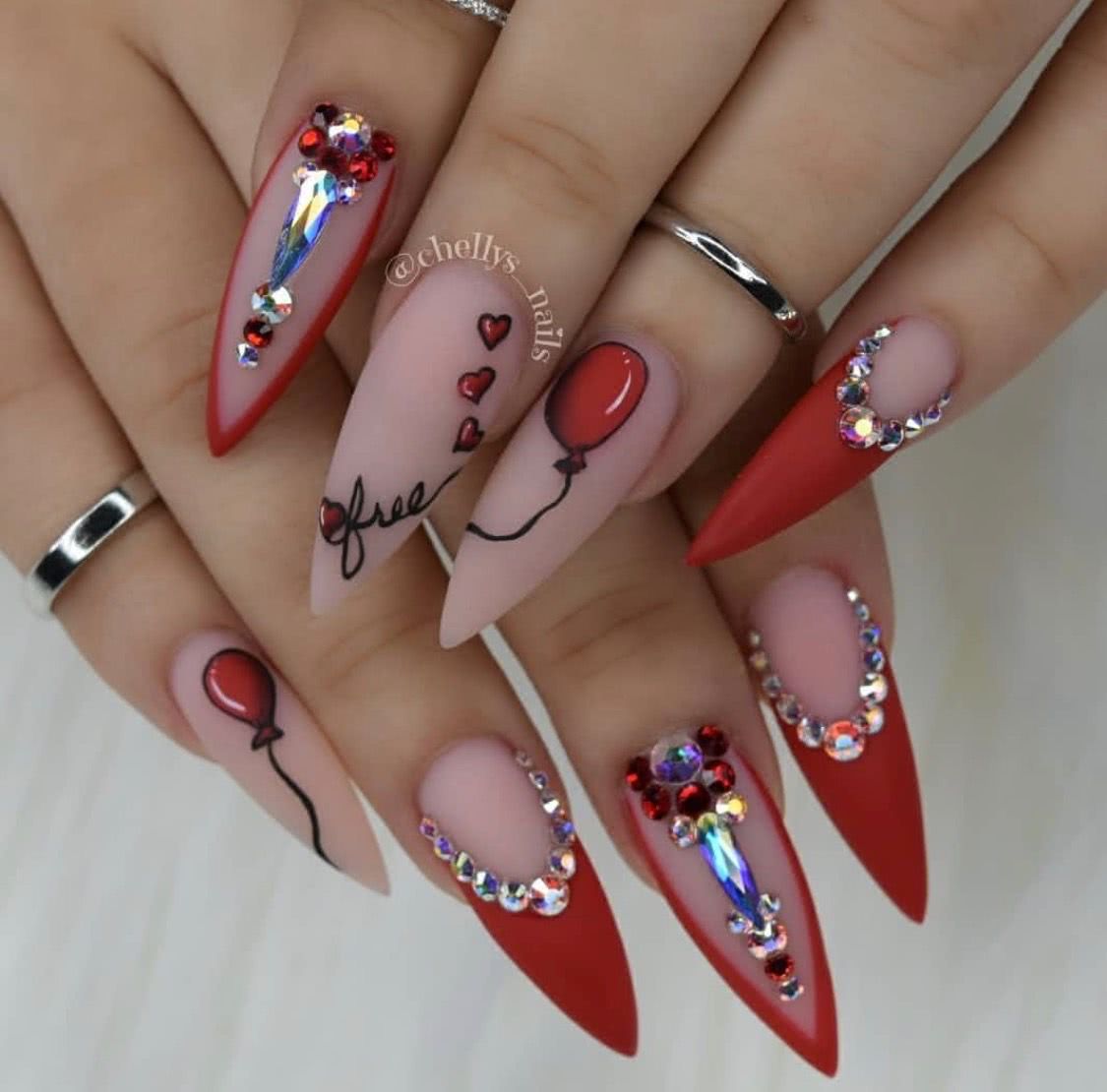 Модные идеи сезона 2019 для любительниц красных ногтей с рисунками и стразами: