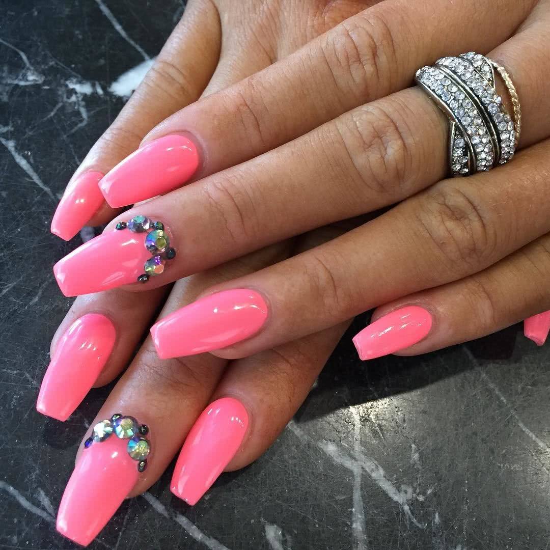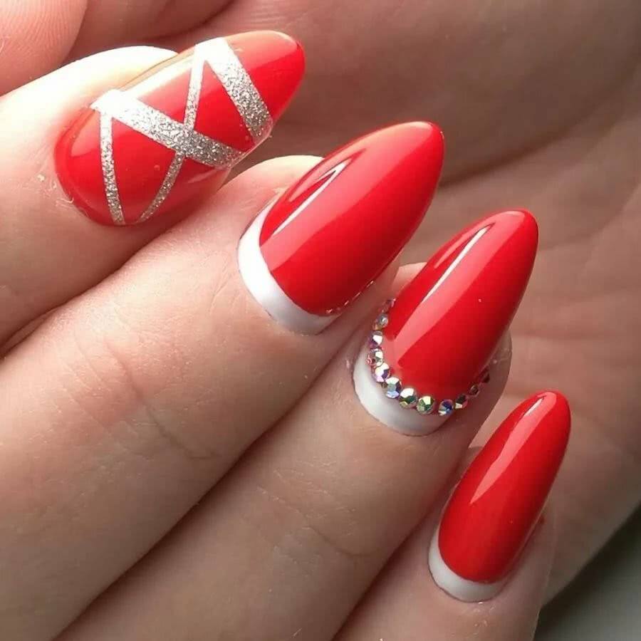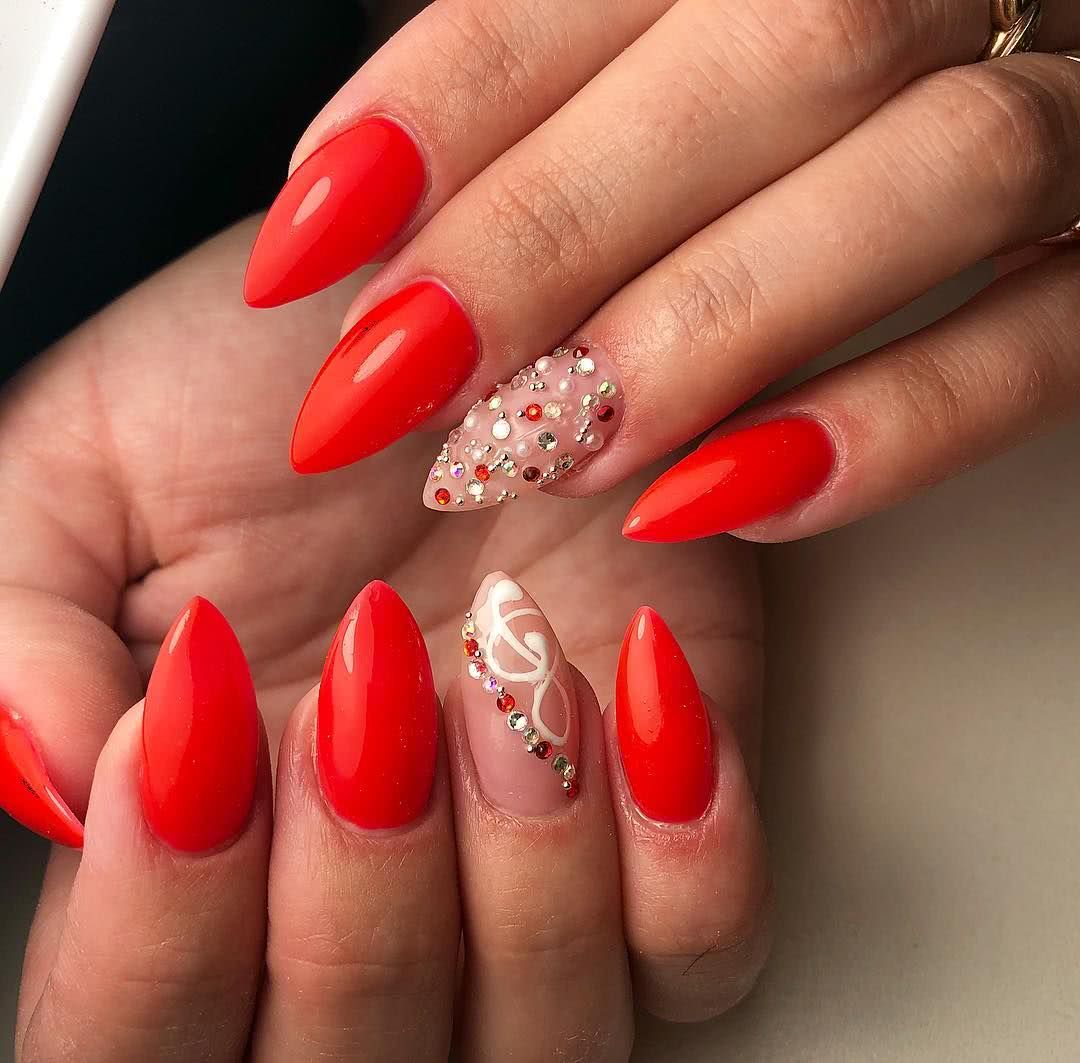 Красный маникюр со стразами будет идеально смотреться на наращенных ногтях. Мастера маникюра используют акрил и моделирующие гели, чтоб создать клиентке идеальную форму и длину. Здесь можно разгуляться в плане дизайна, потому что на искусственно созданной длине и прочной ногтевой пластине можно фиксировать разные декоративные конструкции, и вы получите идеальный красный маникюр со стразами.