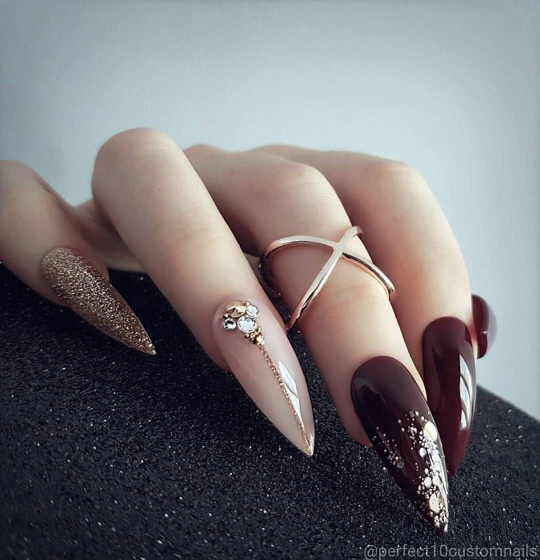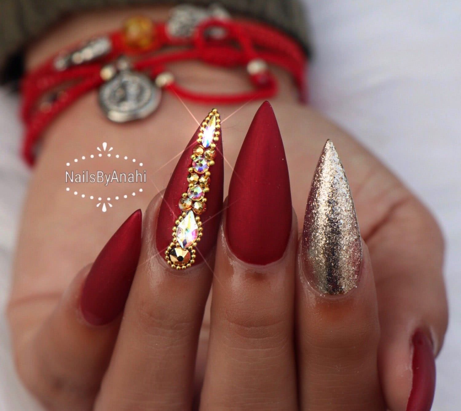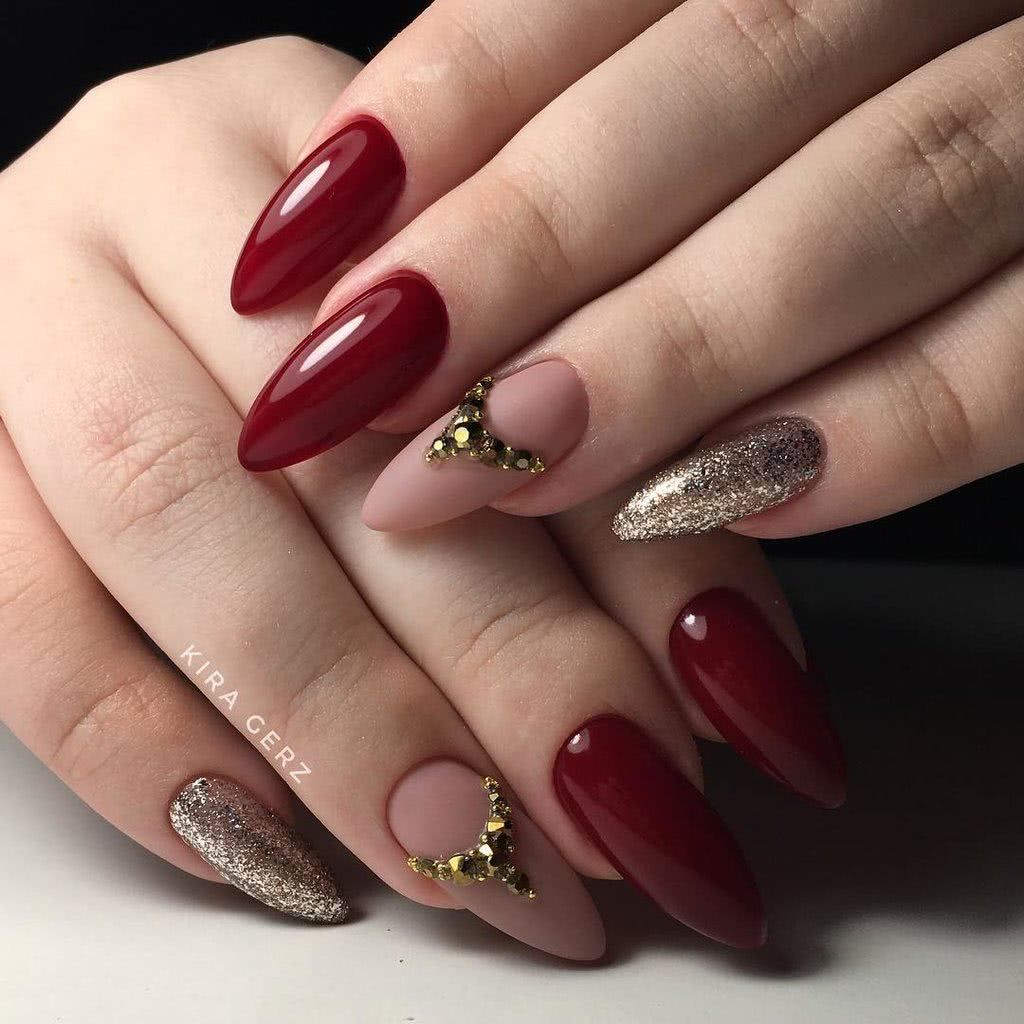 Сегодня красный острый маникюр смотрится гораздо сдержаннее. Девушки предпочитают украшать острые ногти темными оттенками красного, например, бордовым, винным, гранатовым, сливовым. Что касается стразов, то их количество значительно уменьшилось. Стразы, бульонки, камни располагают в прикорневой зоне 1-2 ноготков, используются для создания полосок или простой геометрии.
