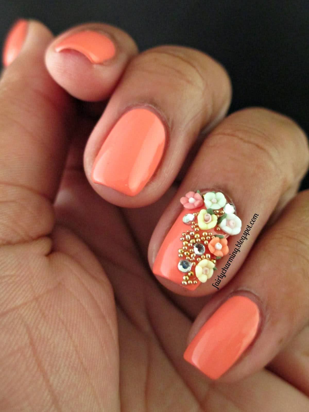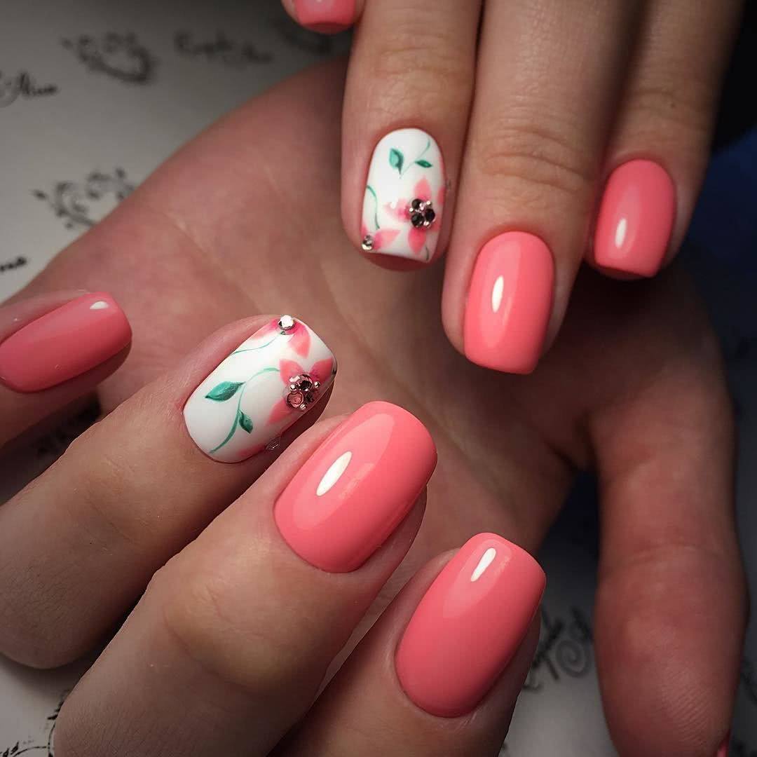 Помимо классического расположения в прикорневой зоне можно выполнить растяжку стразами на белом фоне, заполнить стразами и бульонками все пространство безымянного пальца. Белый и коралловый отлично смотрятся с флористикой. Используйте стразы для акцентирования сердцевинки цветов, для декора лепестков, имитации росы.