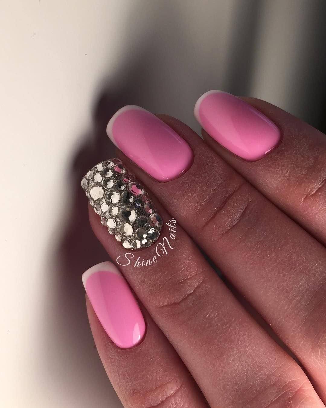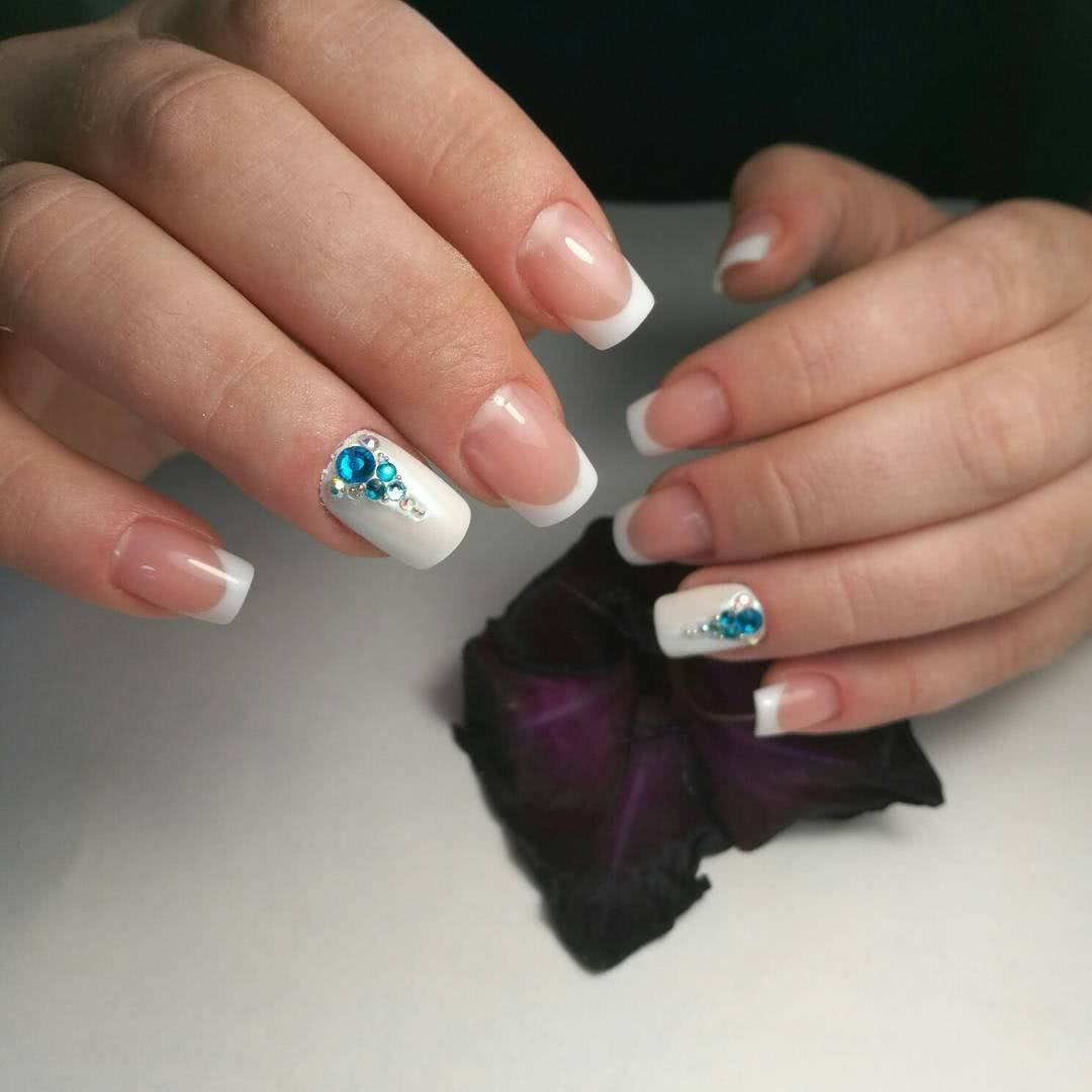 Линия улыбки конечно в таких вариантах должна оставаться белой, но может изменять свою форму и быть скошенной, треугольной, двойной или ажурной. Сверкающие элементы декора актуально располагать по кончику ноготка или у его основания. Очень симпатично смотрится идея с декорированием стразами акцентного ноготка, когда вместо френча можно украсить пальчик рисунком либо однотонным дизайном в тон улыбки или фигурирующего цветного лака.