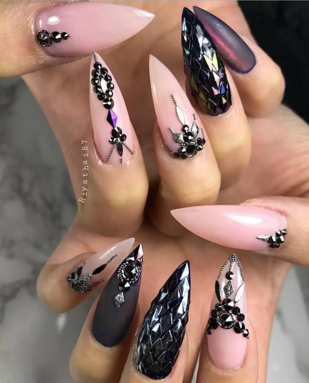 Важно! Во втором варианте украшают основу ногтевой пластины камнями, чтобы подчеркнуть необычность образа