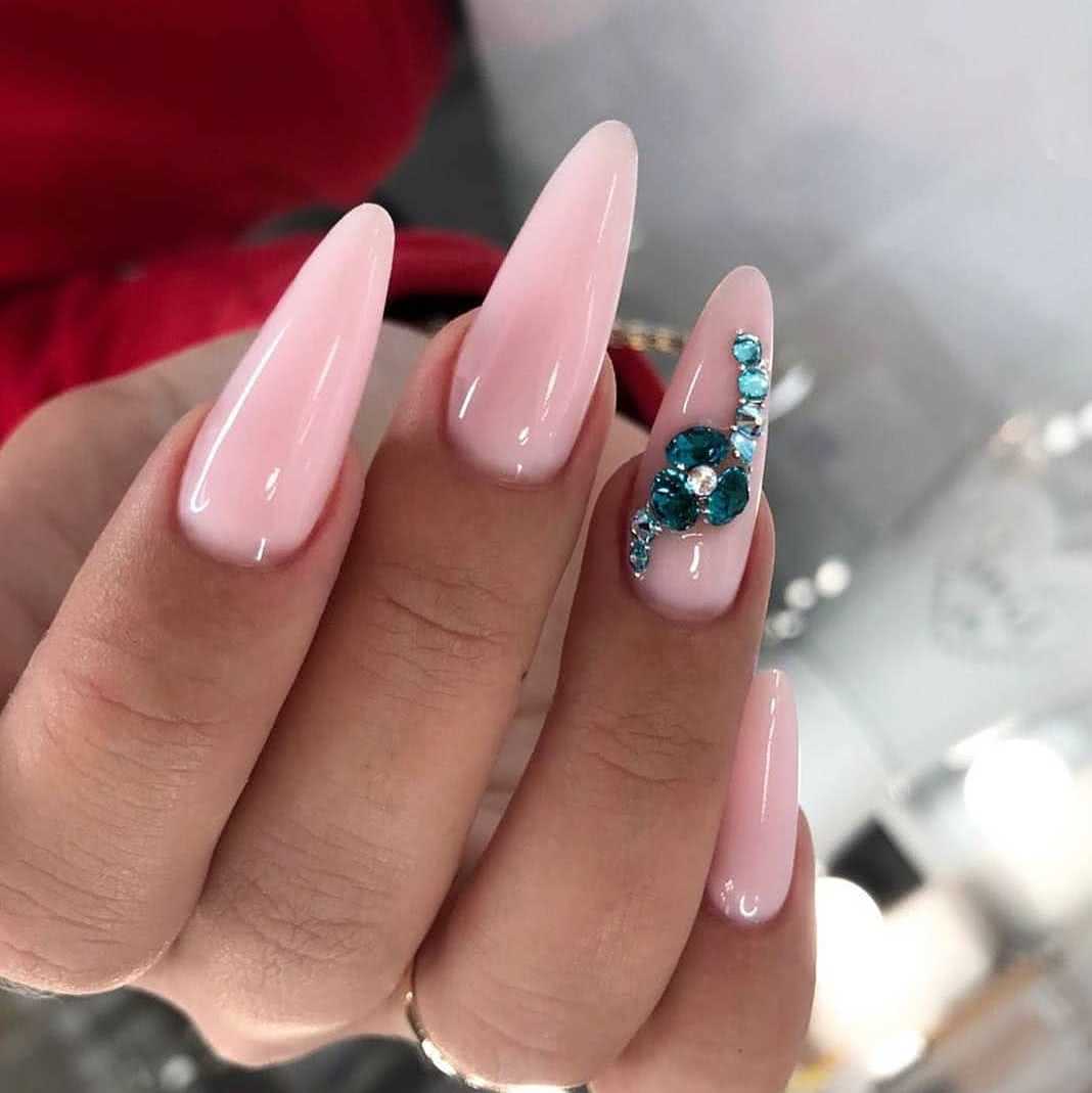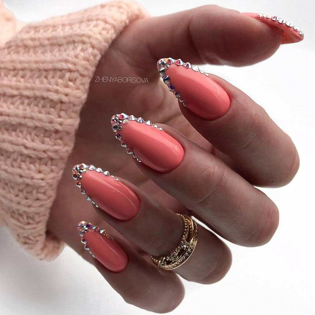 На острых ногтях эффектно смотрится лунный маникюр, в котором лунку оставляют прозрачной, а пространство вокруг нее покрывают стразами разного размера.