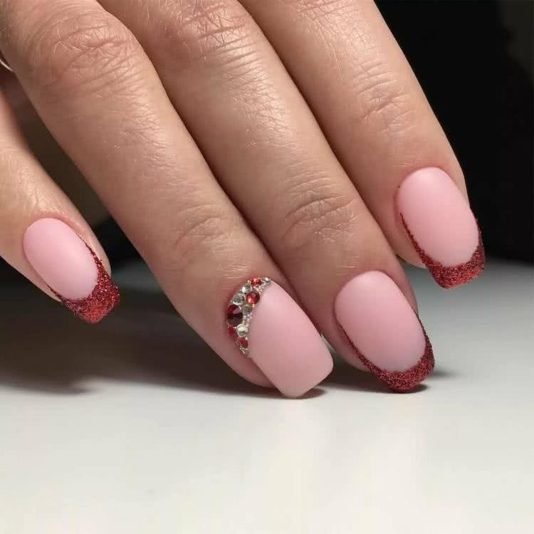 Здесь самое главное – не переборщить с обилием декоративных элементов. Если хочется привнести разнообразие, лучше разбавить маникюр ещё одним цветом (используя классические сочетания – красный с чёрным, белым золотым, светлыми пастельными оттенками). Можно дополнительно использовать различные техники оформления – лунный маникюр, френч, омбре и другие.