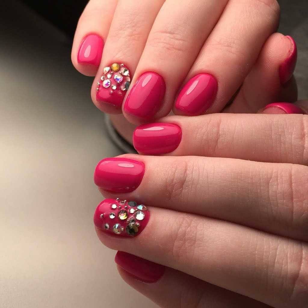Очень необычно смотрится маникюр на фото ниже. Все ногти покрыты глянцевым алым лаком, а безымянный декорирован прозрачными камешками.