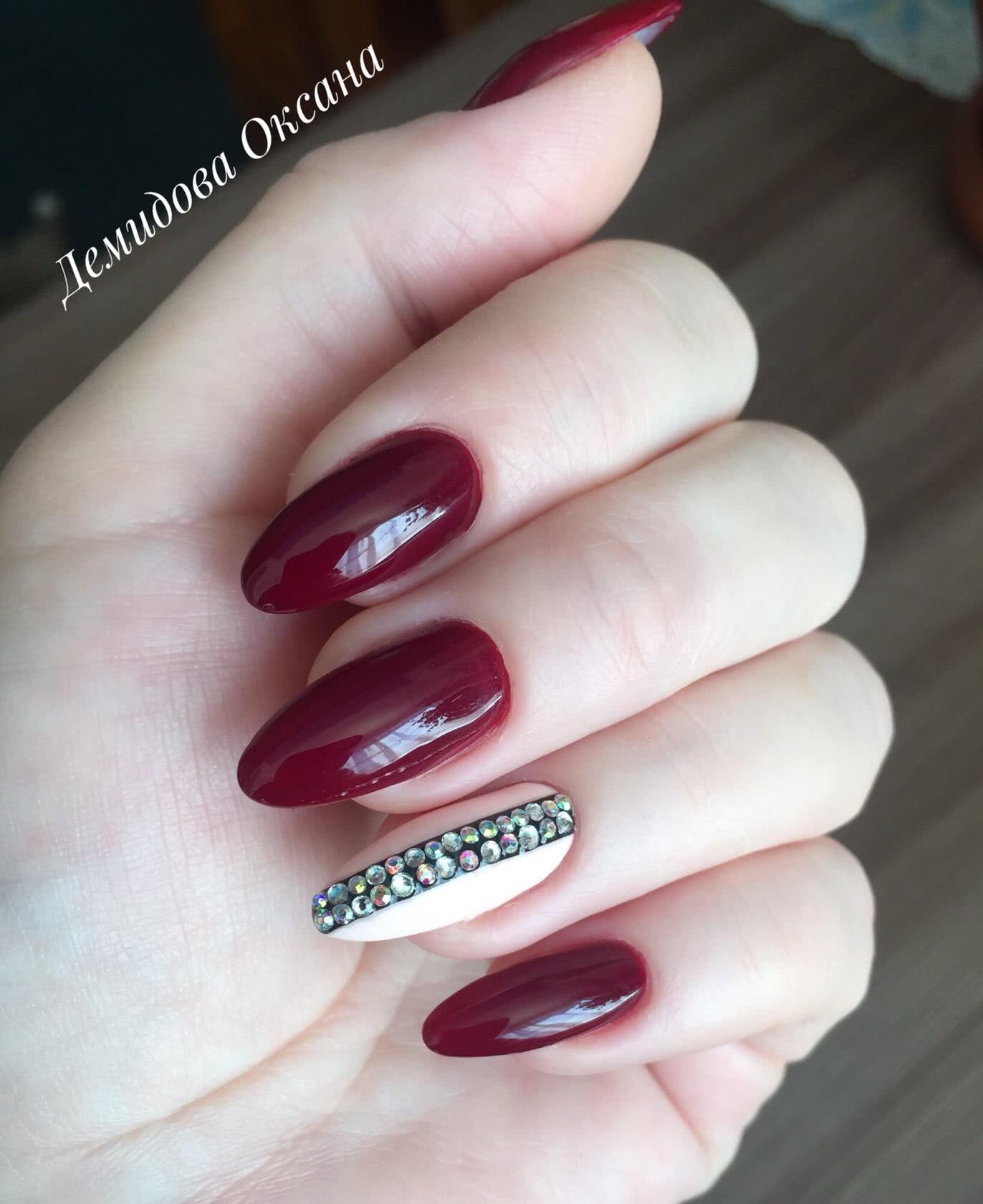 Стильные вариации бордового маникюра со стразами на длинные ногти
