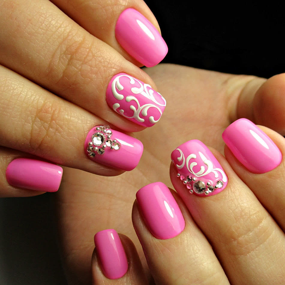 Рисунок – это самый надежный способ создать неповторимый дизайн. Если нет талантов живописца, то сделать его можно с помощью трафарета или наклейки. Также под силу новичку схематически выполнить несложные линии, напоминающие цветочные узоры. Принято размещать картинку на безымянном пальце. Камушками полностью выделяют другой ноготь, например, средний. Такой маникюр будет выглядеть необычным и вполне уместным на мероприятии или в повседневной жизни.