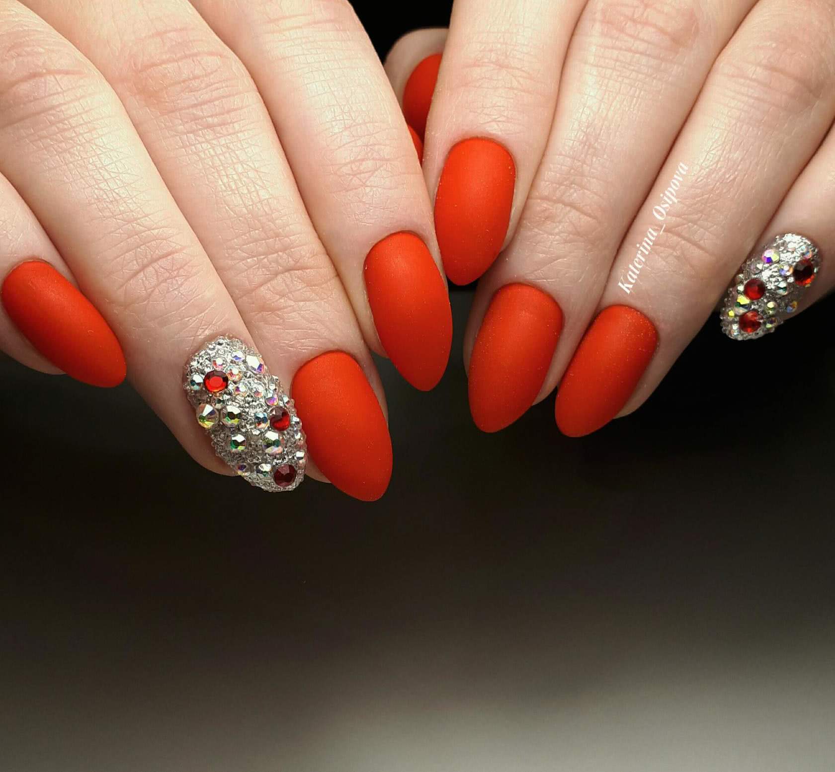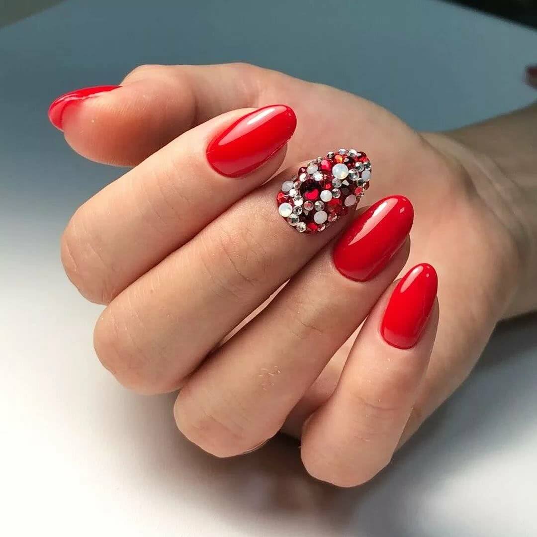 Прекрасная идея для вечернего маникюра – покрыть все ногти красным лаком и сделать акцент на одном из них, полностью уложив его камушками. Можно использовать стразы разных цветов.