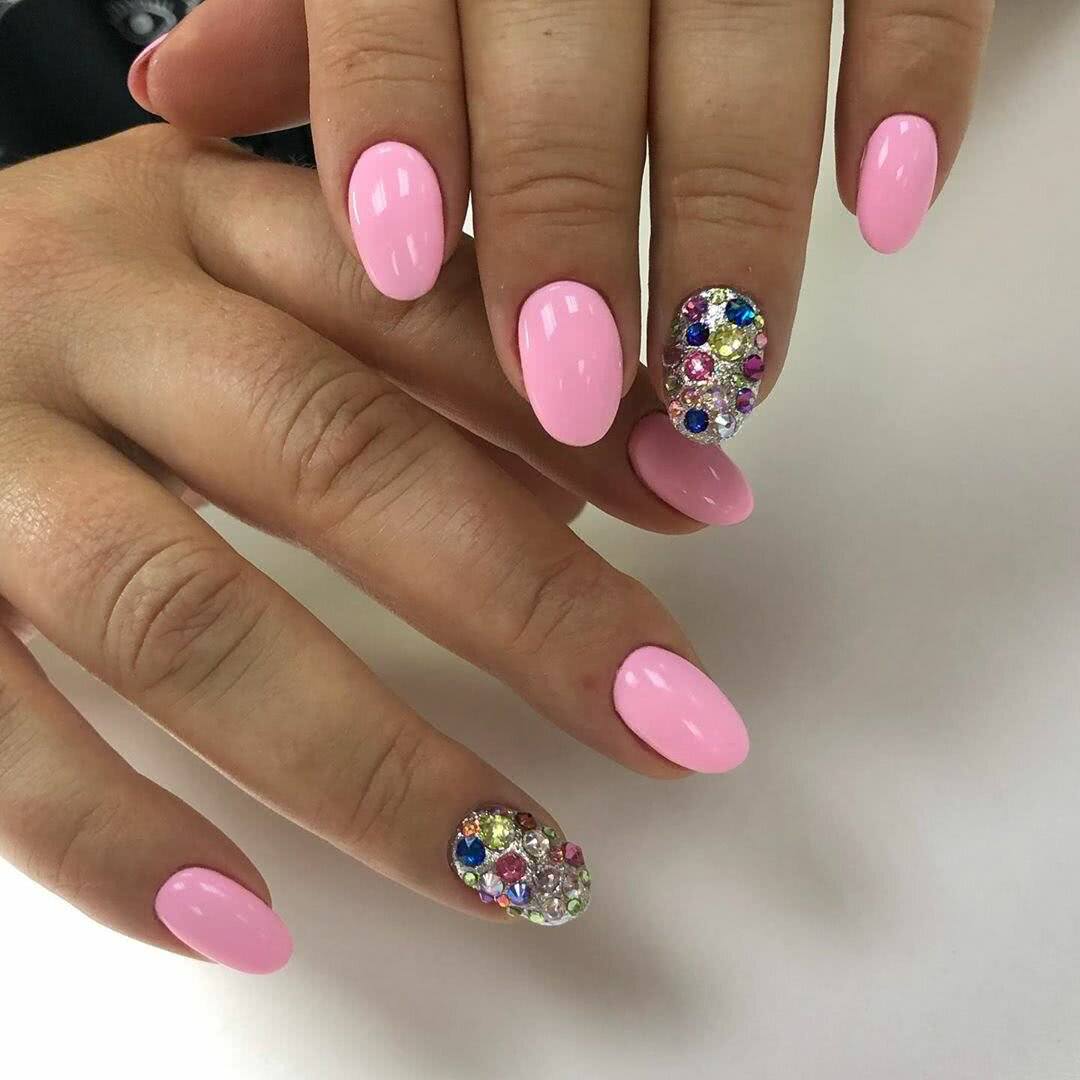 Бульонки и стразы разных цветов на одном из ногтей похожи на россыпь драгоценных камней. Такое оформление смотрится просто роскошно.
