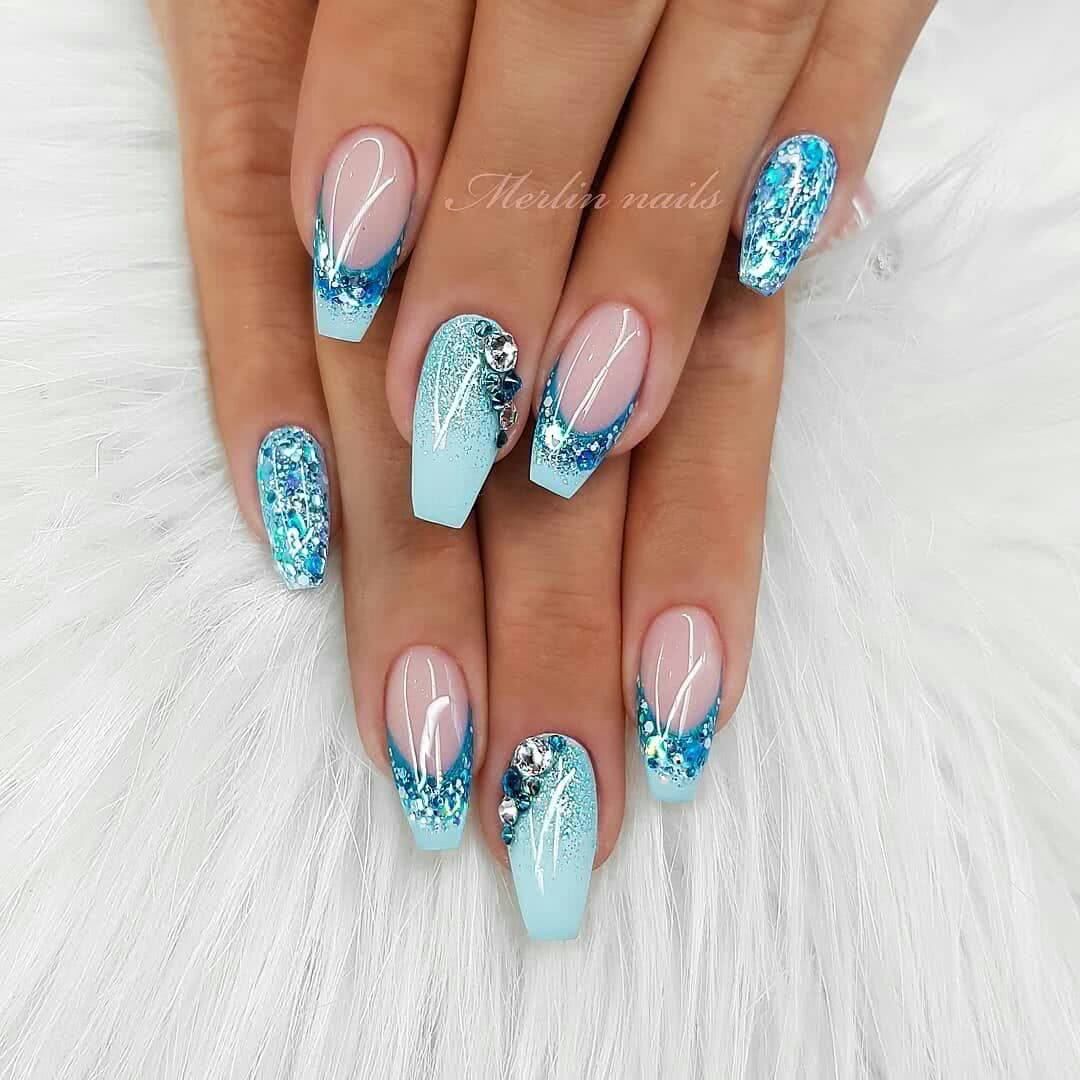 В процессе работы нужно соблюсти все пропорции украшений. Опытные мастера советуют сочетать столь яркие элементы чередованием: один палец выделить полностью блестками, другой усыпать небольшим количеством камней, а остальные покрыть только базовым лаком.