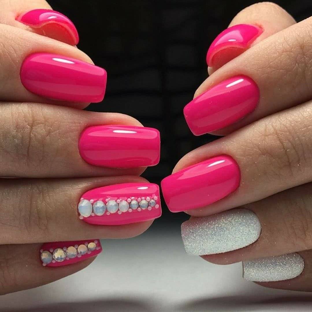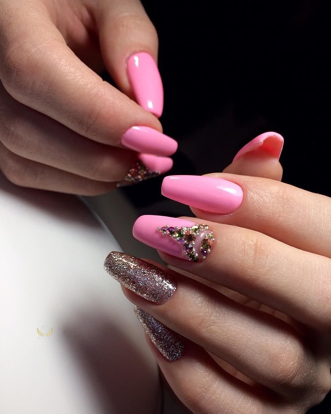 Кто сказал, что сочетание блёсток глиттера и сияние страз в одном маникюре это слишком? Следует просто гармонично расположить декор на ноготках, и вы будете приятно удивлены такому соседству, даже если в качестве основания используется малиновый, алый или, например, яркий зелёный цвет. Если появилось желание расположить оба вида декора на одной ногтевой пластине в виде оригинального узора, тогда актуальнее это сделать на одном двух ноготках. Не менее шикарно смотрится поочерёдное расположение блестящих деталей. К примеру, на одном из ноготков делаем глиттерную растяжку, а на другом украшаем прикорневую зону стразами. Не разве это не шикарно?