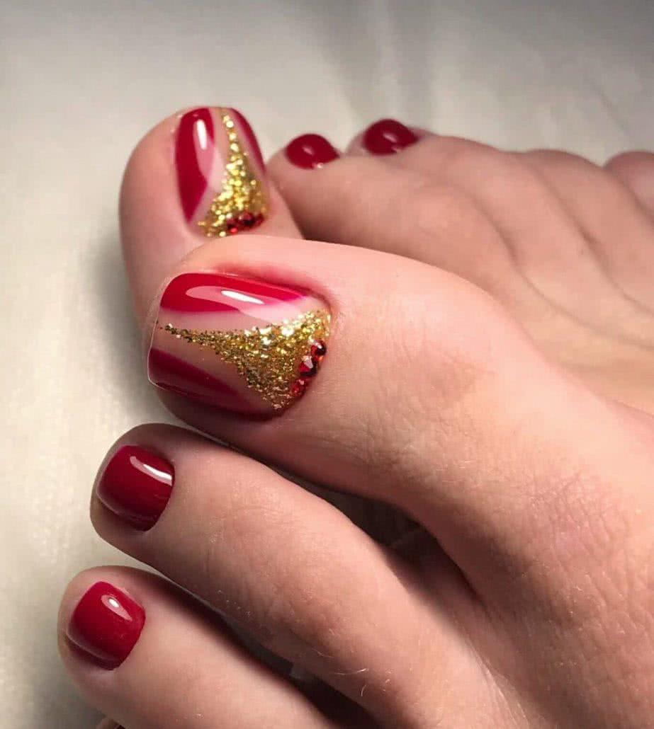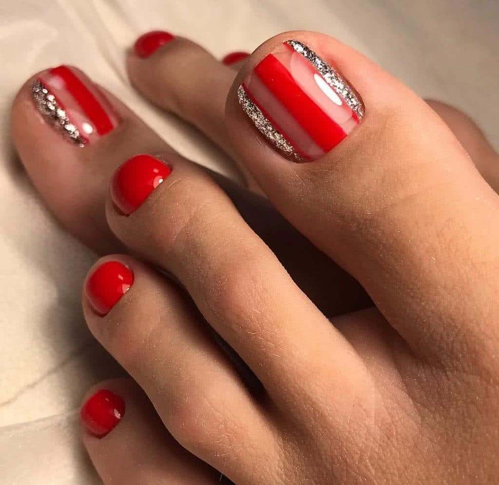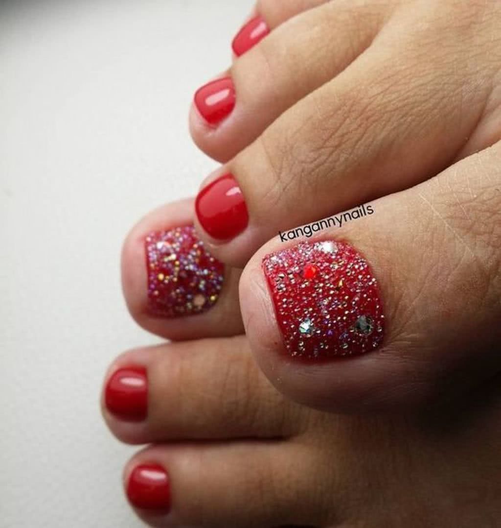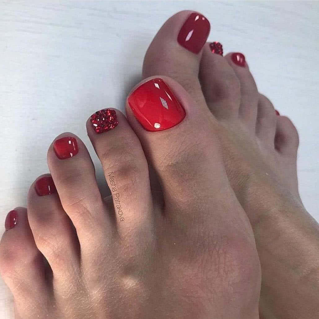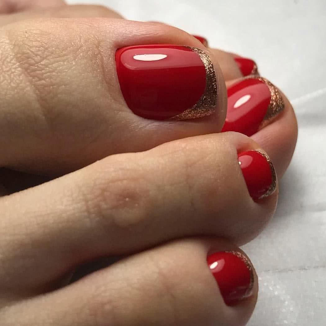 Самым простой и легкий способ разнообразить красный педикюр – это добавить в него блестящий декор. С появлением гель-лаков с глиттером сделать красивый дизайн с блестками стало намного проще. Если правильно расположить сухие блестки было проблематично, то с помощью кисточки с глиттером можно выполнить абсолютно любой узор. Есть несколько вариантов декорирования ногтей блестками: