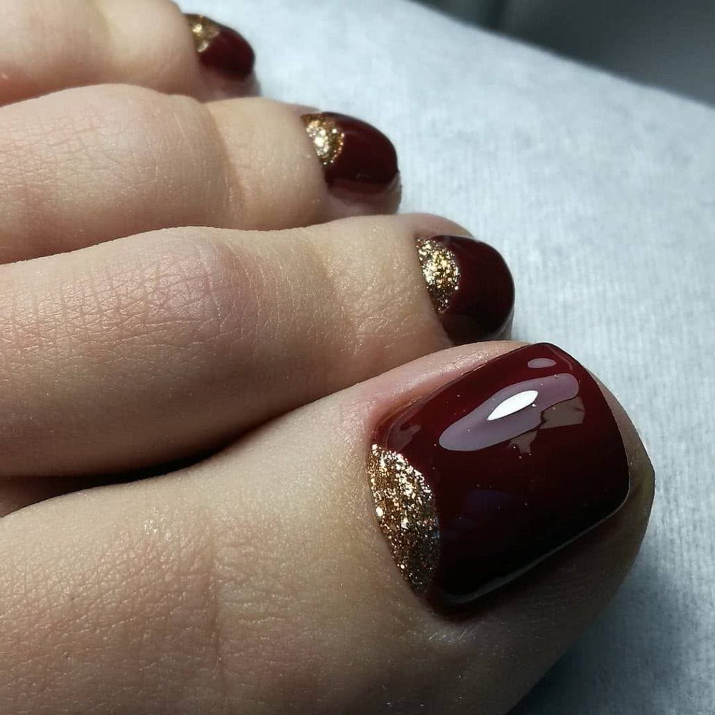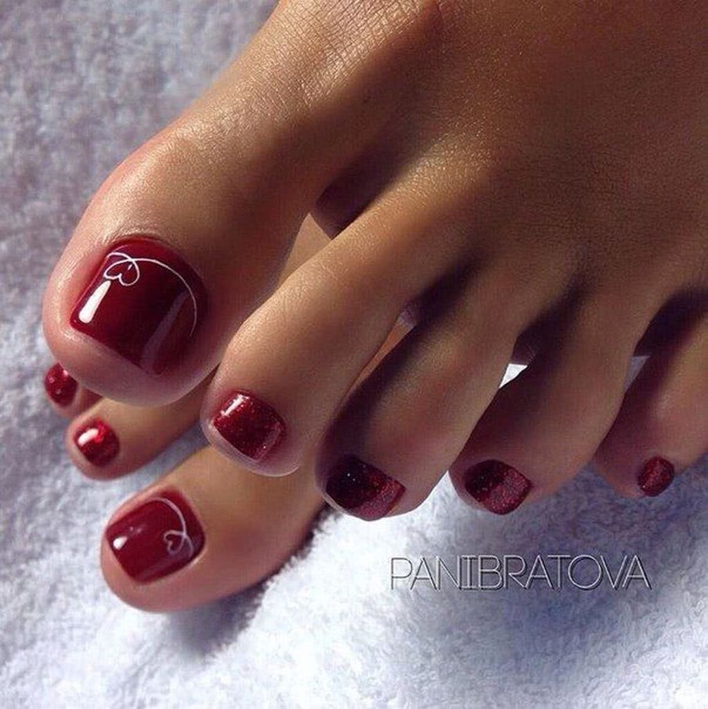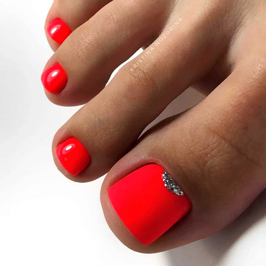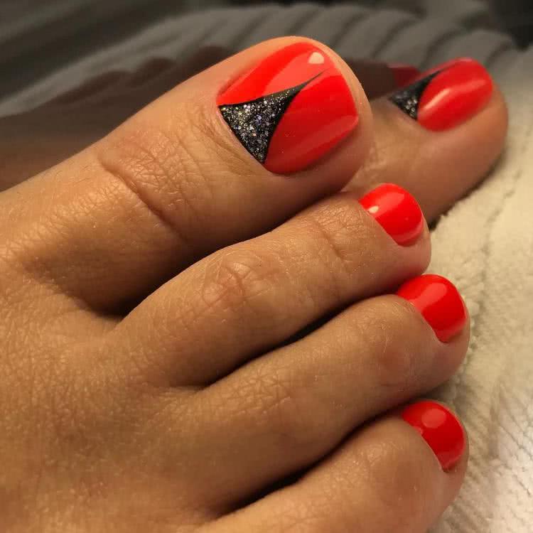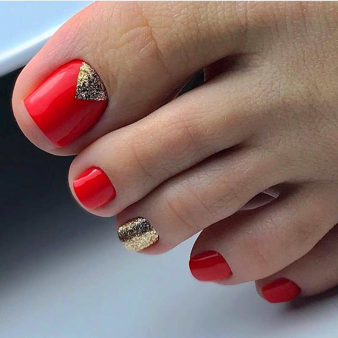 Самым простой и легкий способ разнообразить красный педикюр – это добавить в него блестящий декор. С появлением гель-лаков с глиттером сделать красивый дизайн с блестками стало намного проще. Если правильно расположить сухие блестки было проблематично, то с помощью кисточки с глиттером можно выполнить абсолютно любой узор. Есть несколько вариантов декорирования ногтей блестками:
