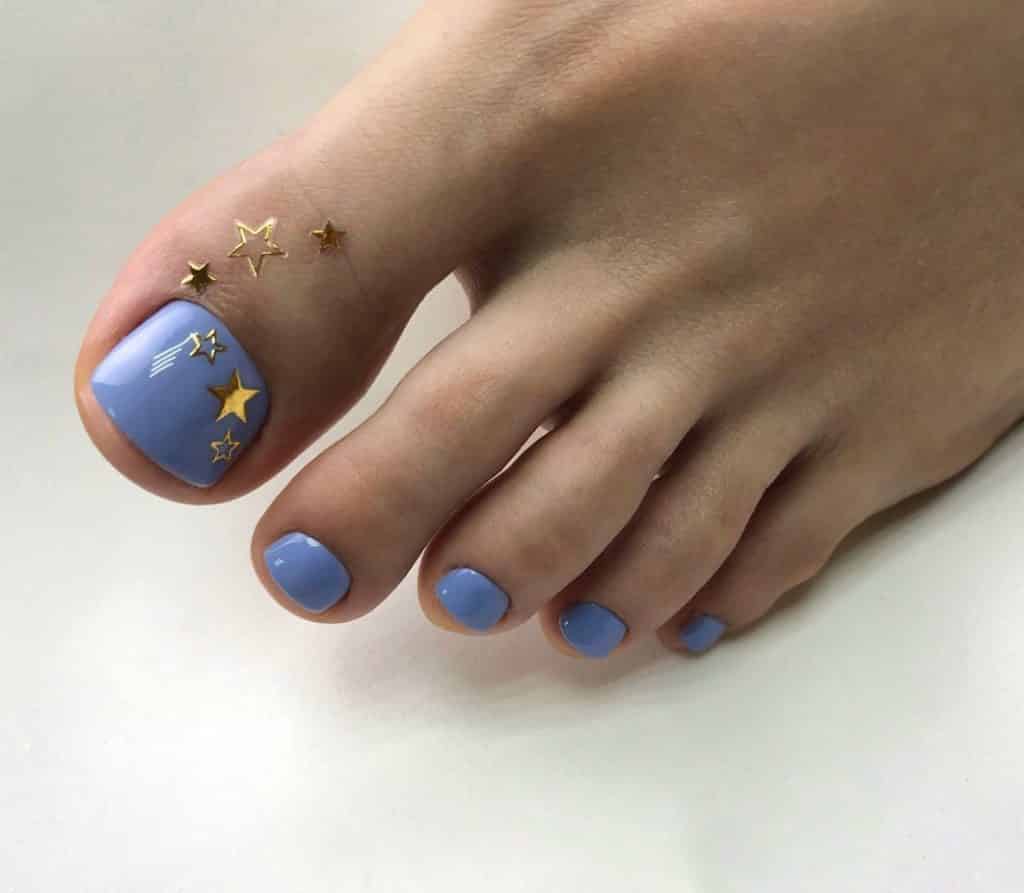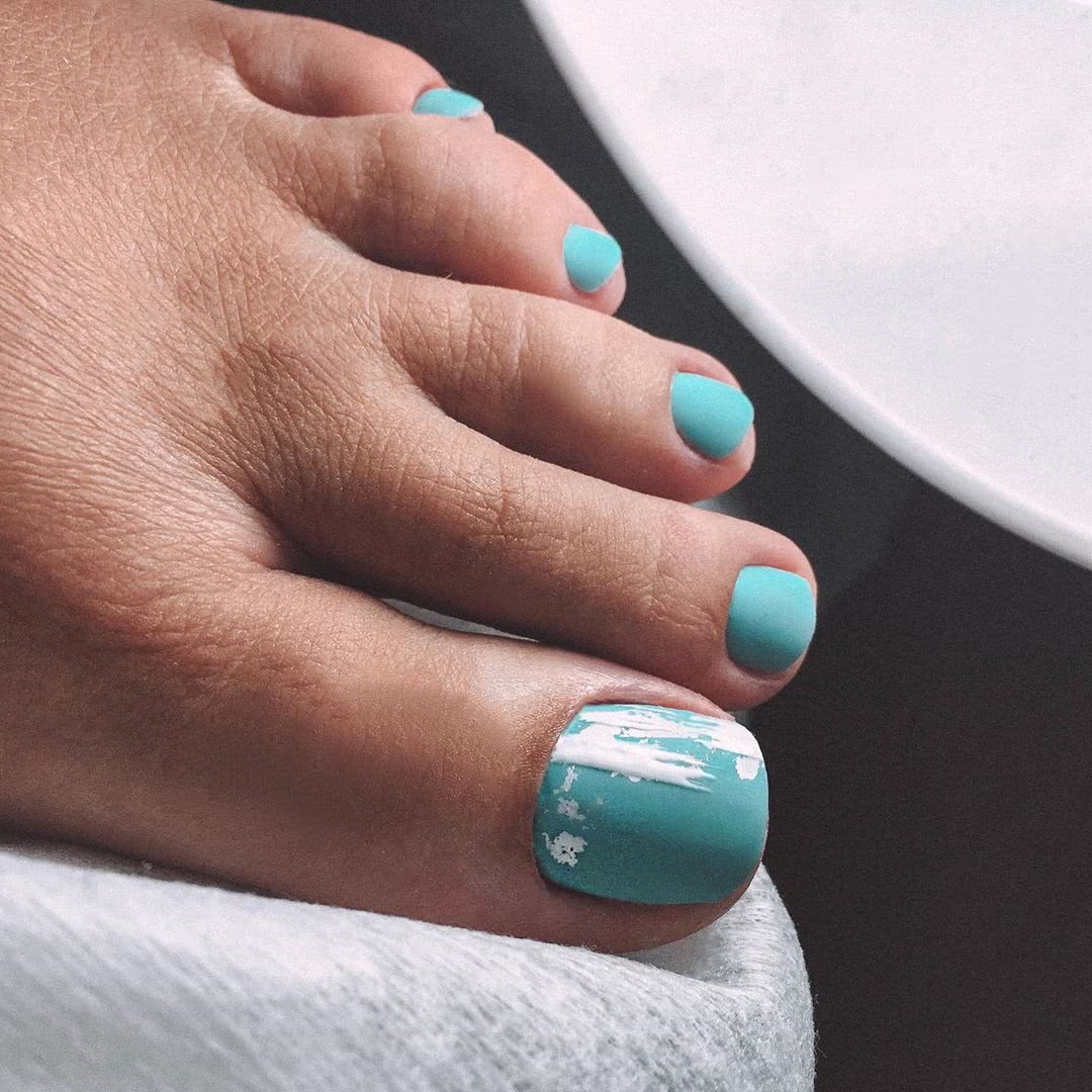 Для педикюра зимы холодный светло-голубой оттенок тоже будет уместным. Его можно дополнить серебристым декором, например, фольгой или блестящей лентой.