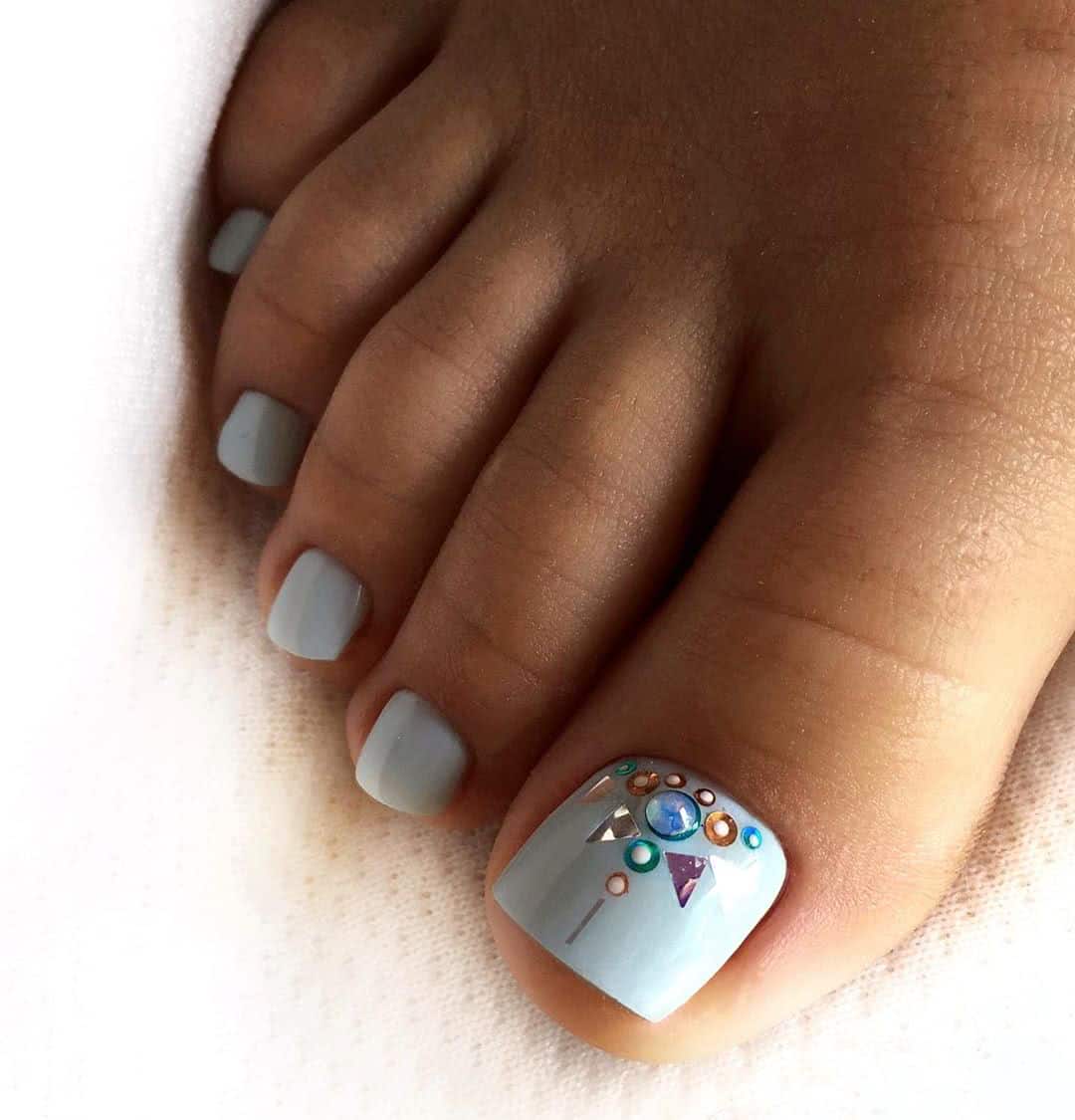 Со стразами. Это может быть педикюр с голубым матовым покрытием с рисунком из страз, выделение лунки, полоска из страз и бульонок. В общем всё, чего душа пожелает и как разыграется ваша фантазия. Главное – не переусердствовать с украшениями, чтобы дизайн нежных оттенков не был перегружен.