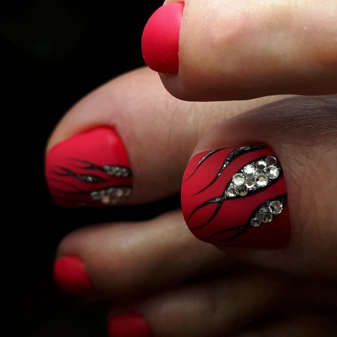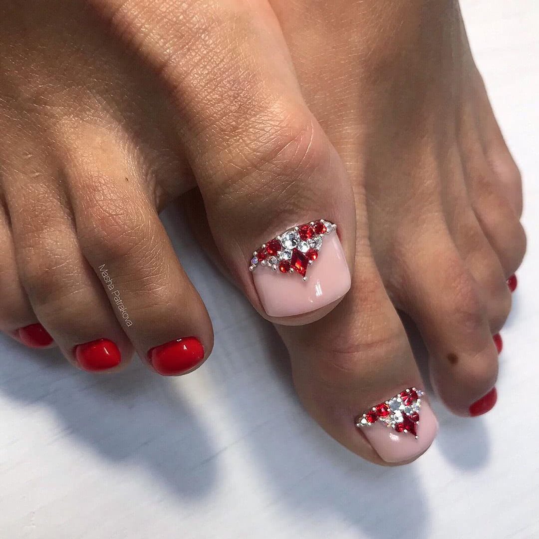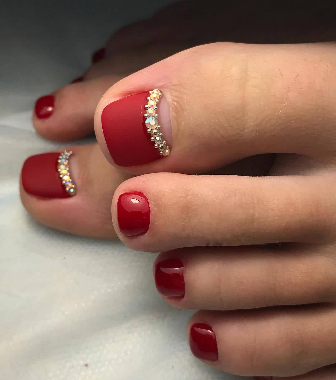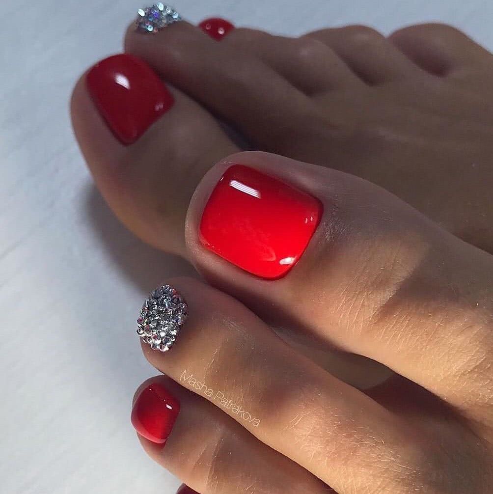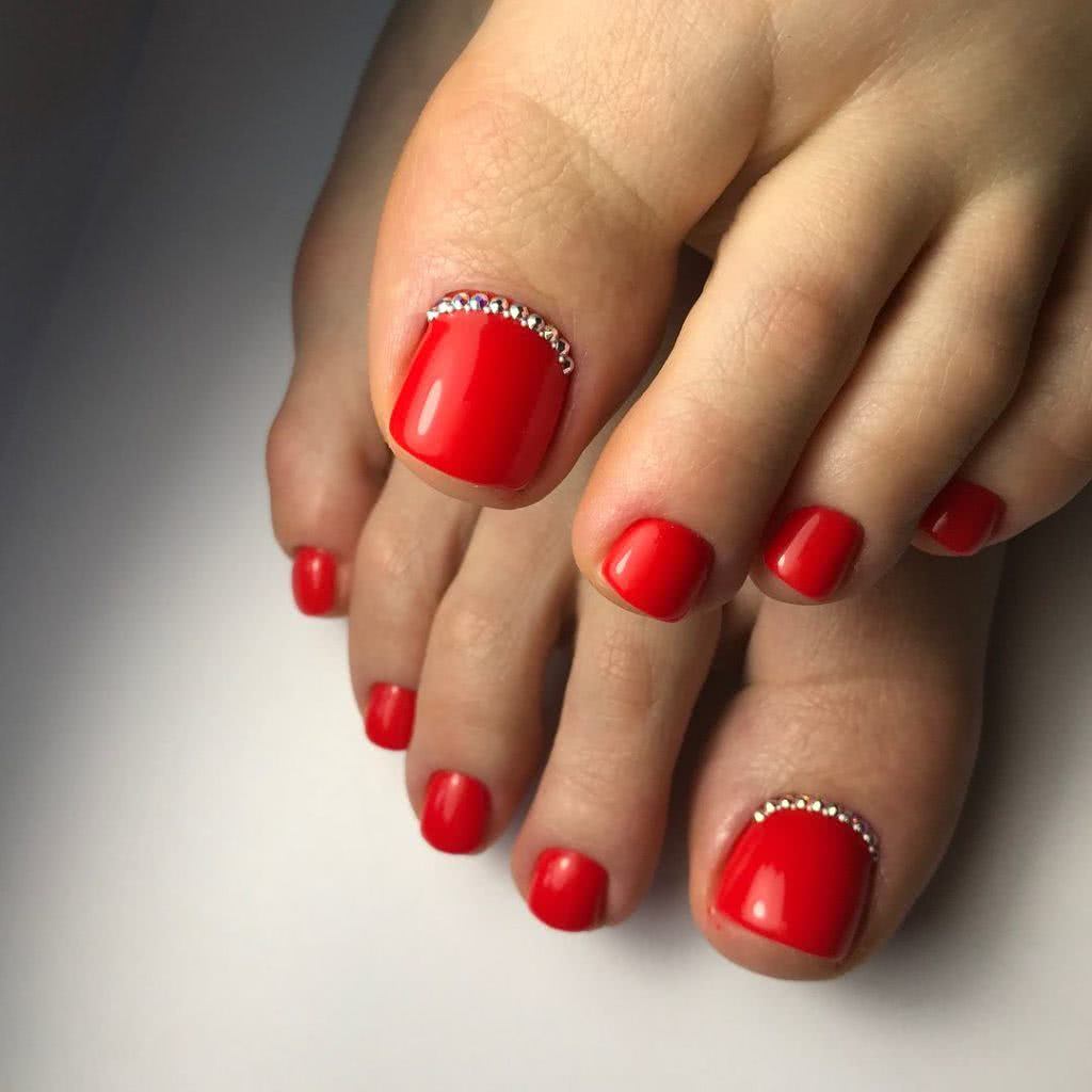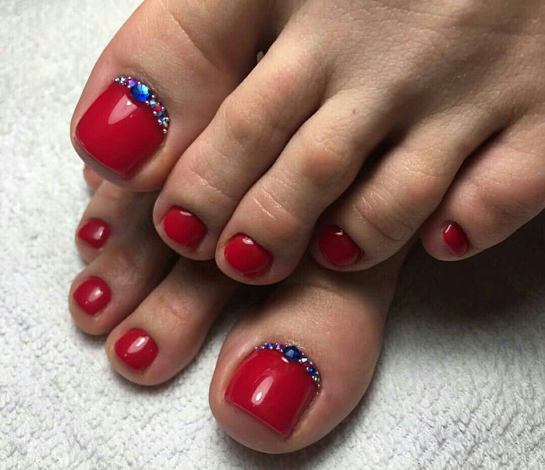 Что касается красного педикюра со стразами, то тут для модниц много новинок. Используйте для дизайна не только классические серебряные стразы, но и красные, бордовые, синие камни