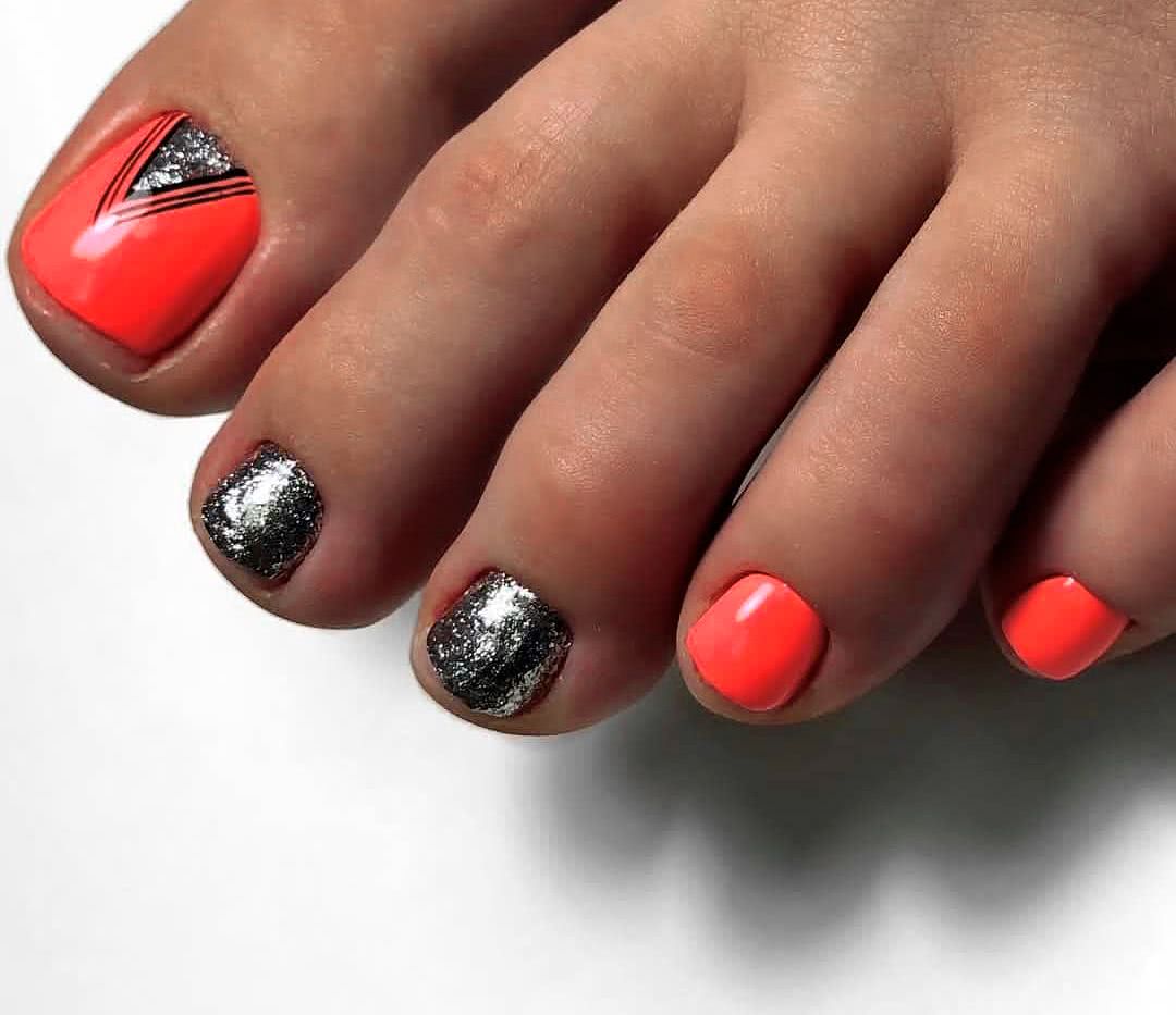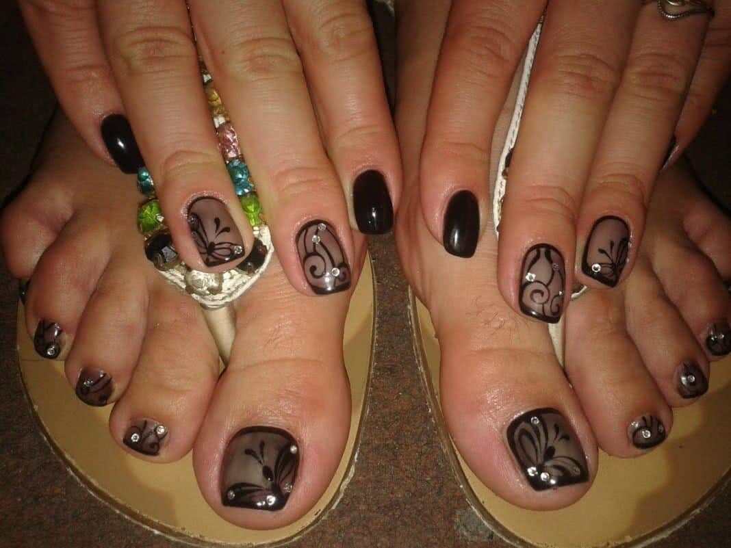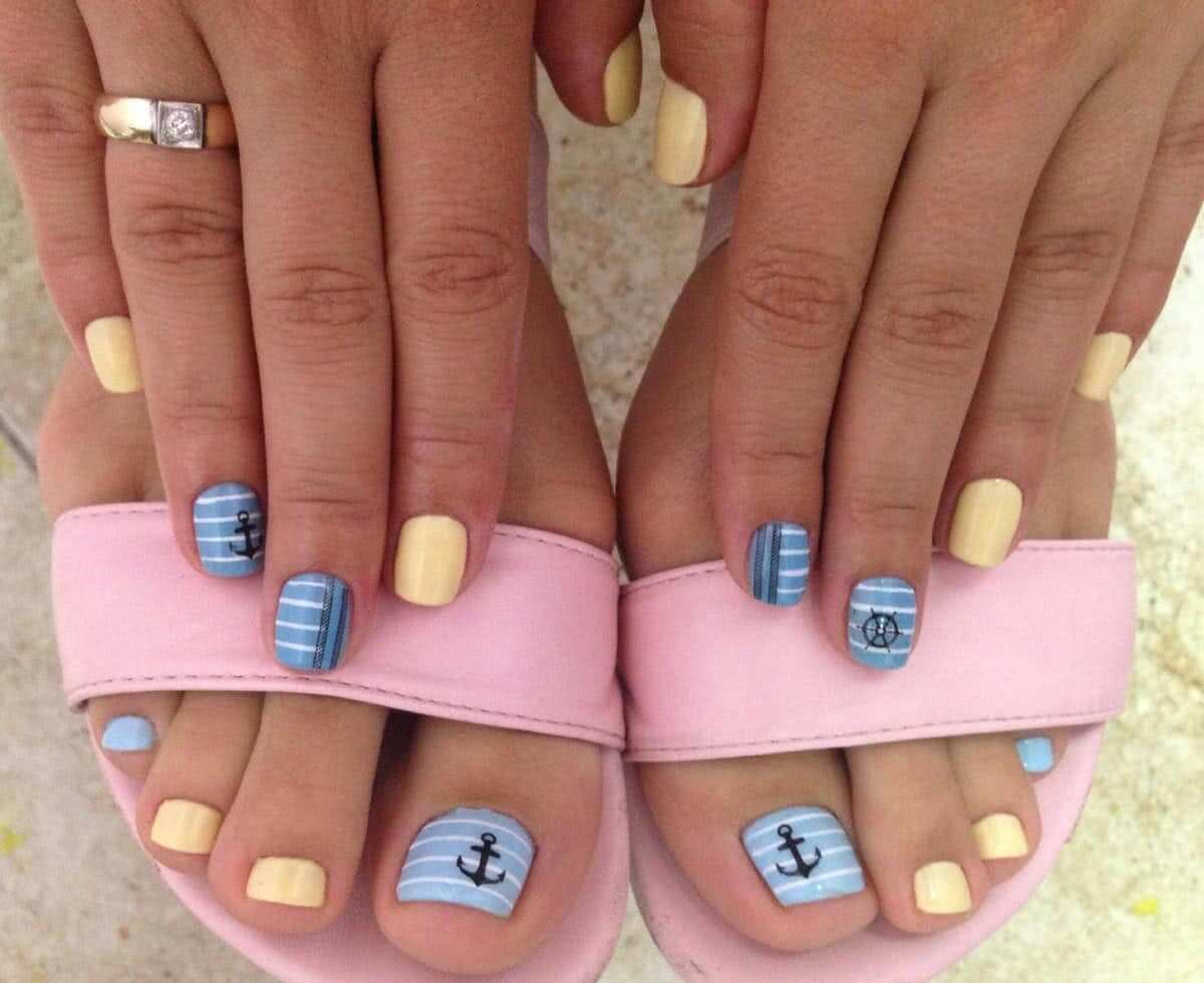 Выбор дизайна для маникюра и педикюра в одном оформлении – дело сугубо личное. По большому счету нет ограничений какие цвета, дизайны и рисунки использовать.