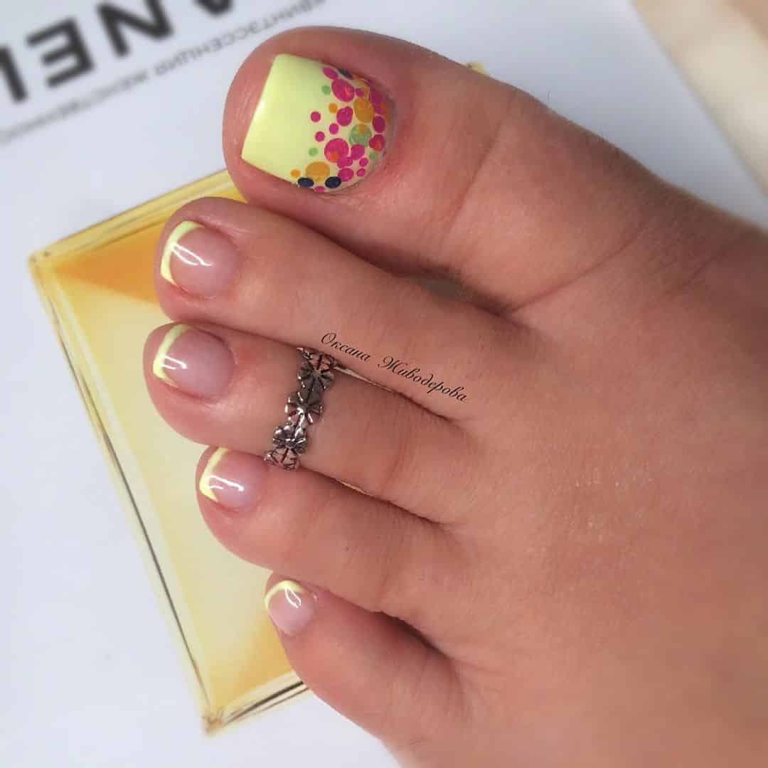 Лимоны, апельсины, арбузные дольки и клубнички – все эти фрукты выигрышно и аппетитно смотрятся на жёлтом педикюре. А яркие, холодные или тёплые тона лака дадут вам широкую возможность для экспериментов.