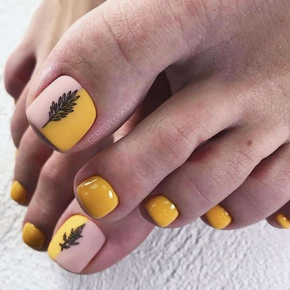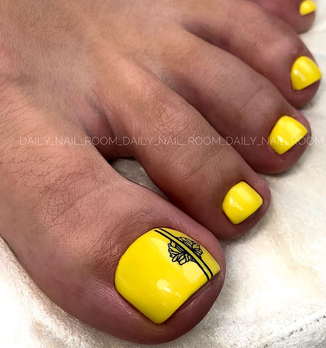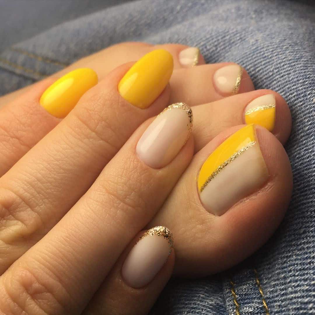 Желтый педикюр с золотой фольгой от @pogodina_nail_art / Instagram