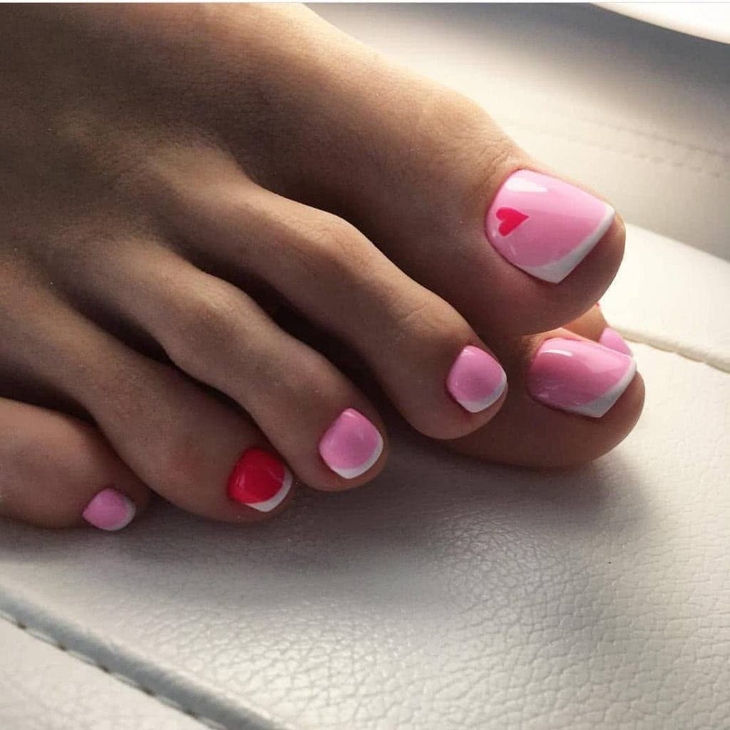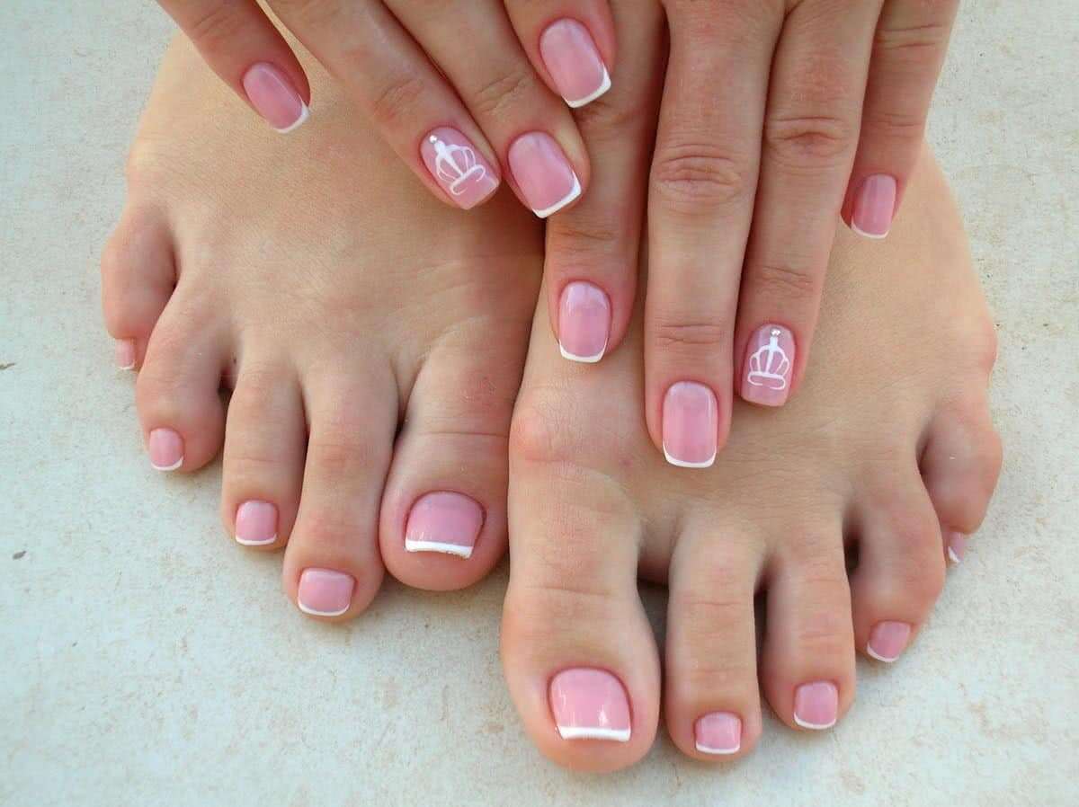 - Френч. Чаще это французский маникюр и однотонный педикюр в цвете линии улыбки;