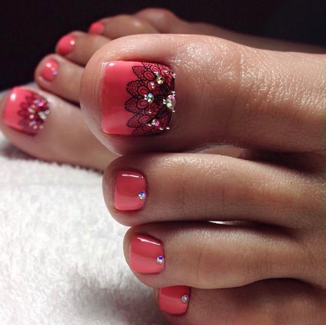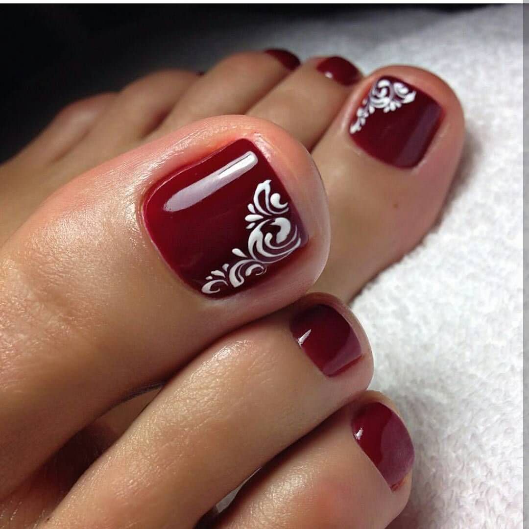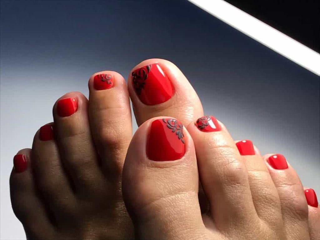 - красный педикюр с кружевным декором – используйте для декора белый или черный цвет. Узор будет выглядеть броско и ярко, за счет использования контрастных оттенков.