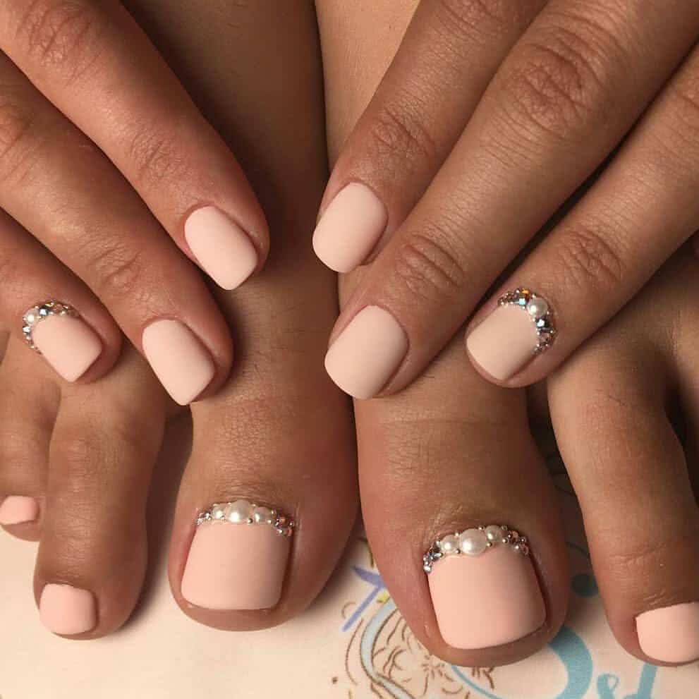 Стразы и блестки. Как и в случае с френчем, дополнительный декор чаще размещают на руках, а ножки покрывают в один тон. Но тут, конечно, дело вкуса.
