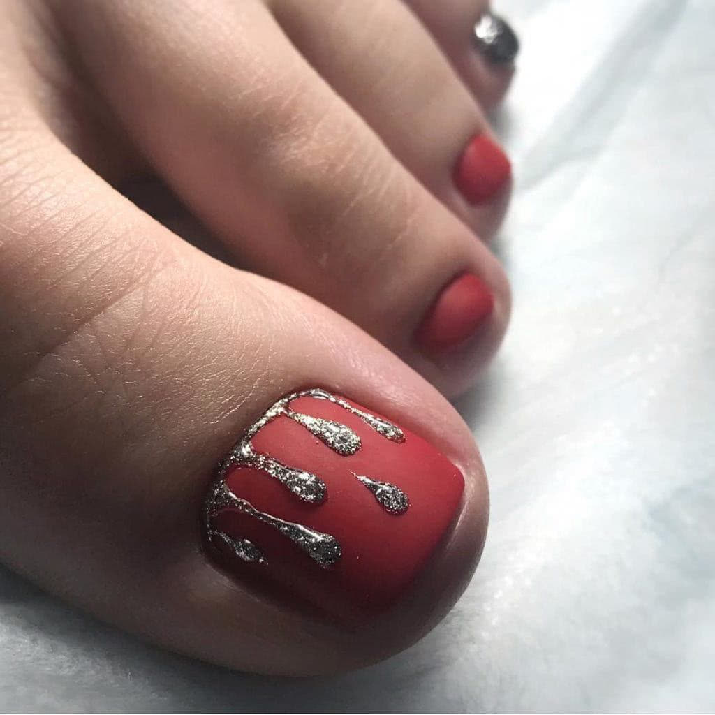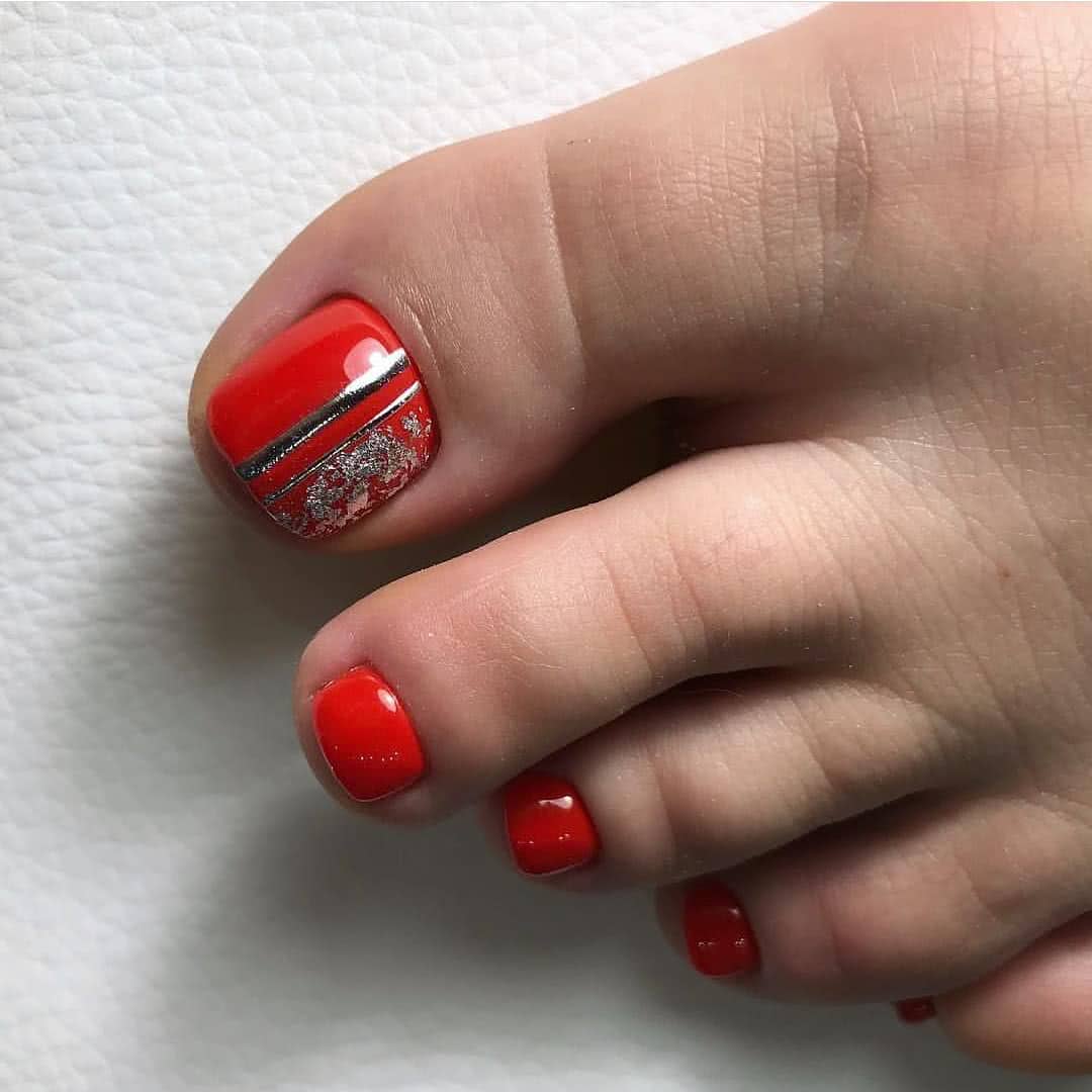 Еще одна тенденция – лента для педикюра. Красный отлично дополняется серебряной гибкой лентой и получается красивый и легкий педикюр.