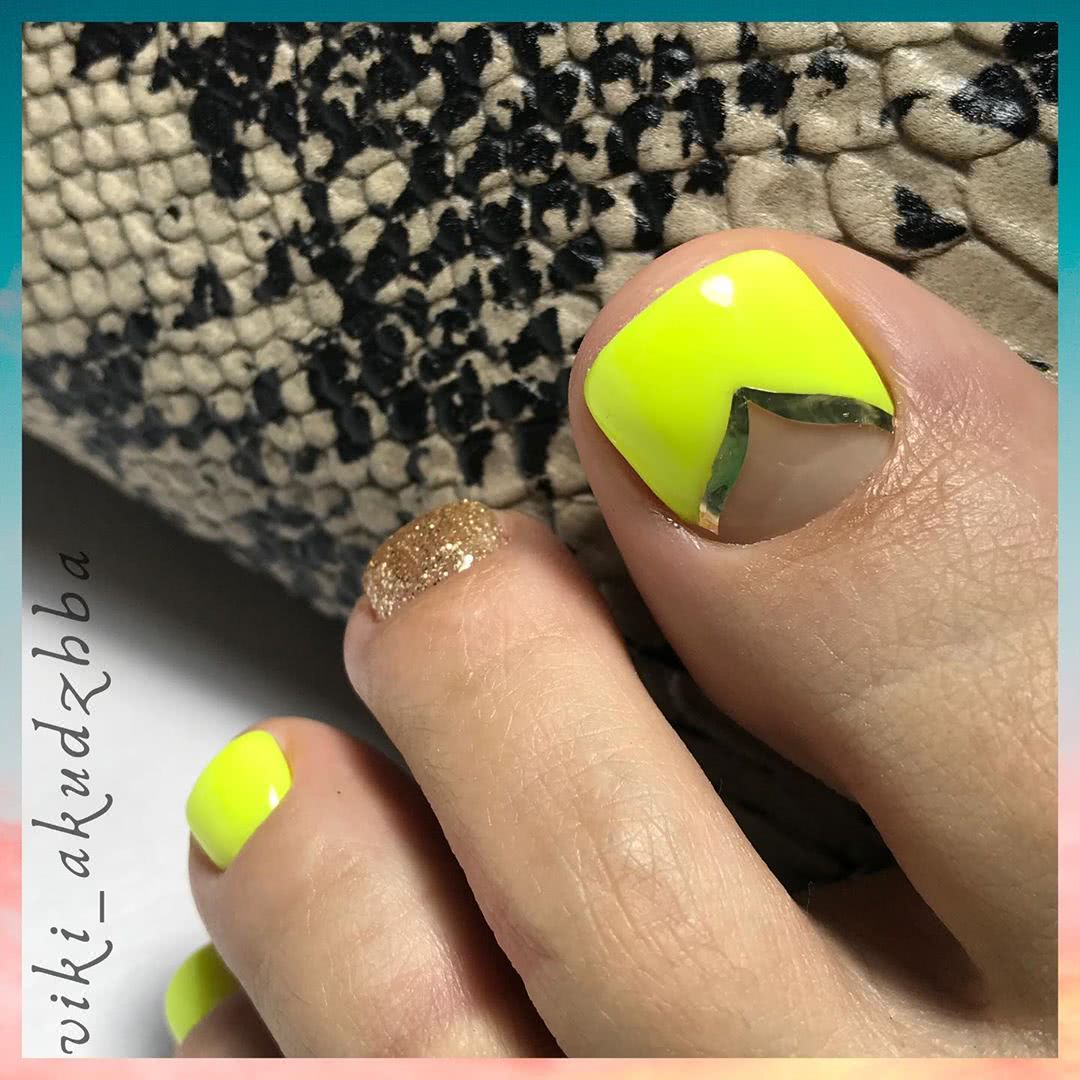 Однотонный неоновый желтый педикюр со стразами от @svetlanasomryakova