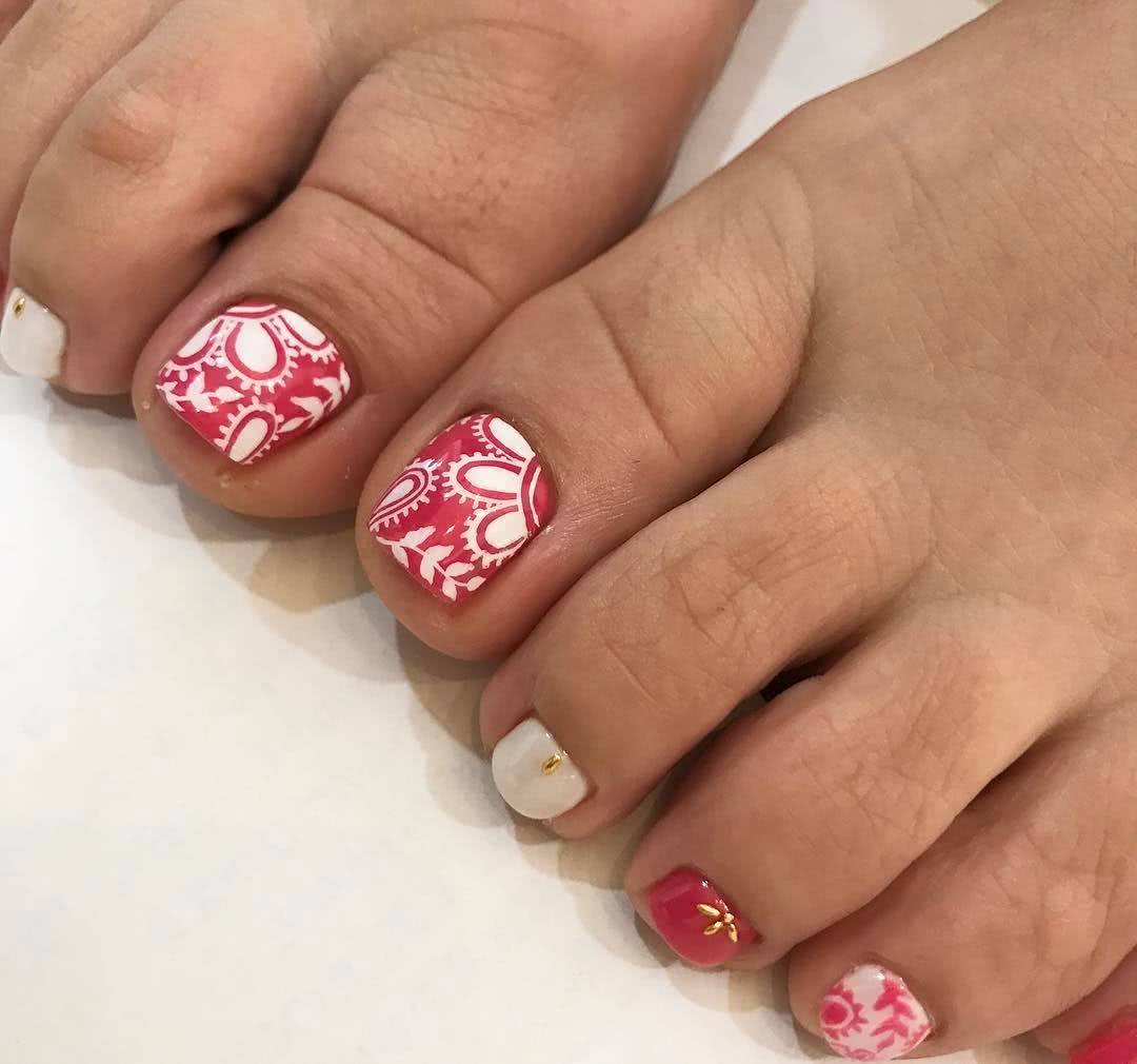 Геометрические узоры — украшают любой педикюр, но наиболее оригинально они выглядят на покрытиях, близких к натуральному бежевому цвету. Среди модных тенденций стали появляться более плавные линии и фигуры без четких границ и углов. Сам рисунок может наноситься не только лаковыми покрытиями, но и стразами, блестками, а также с помощью штампов и термопленок.