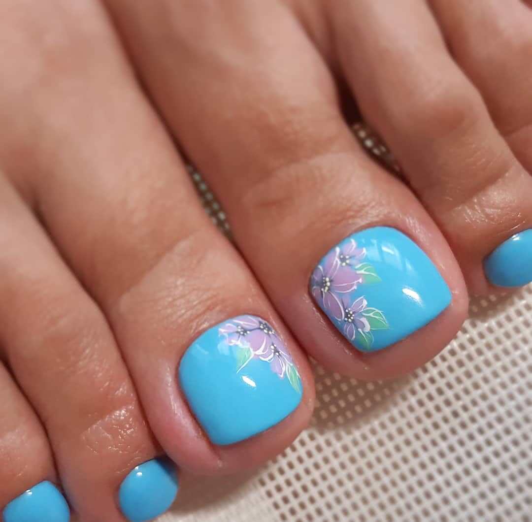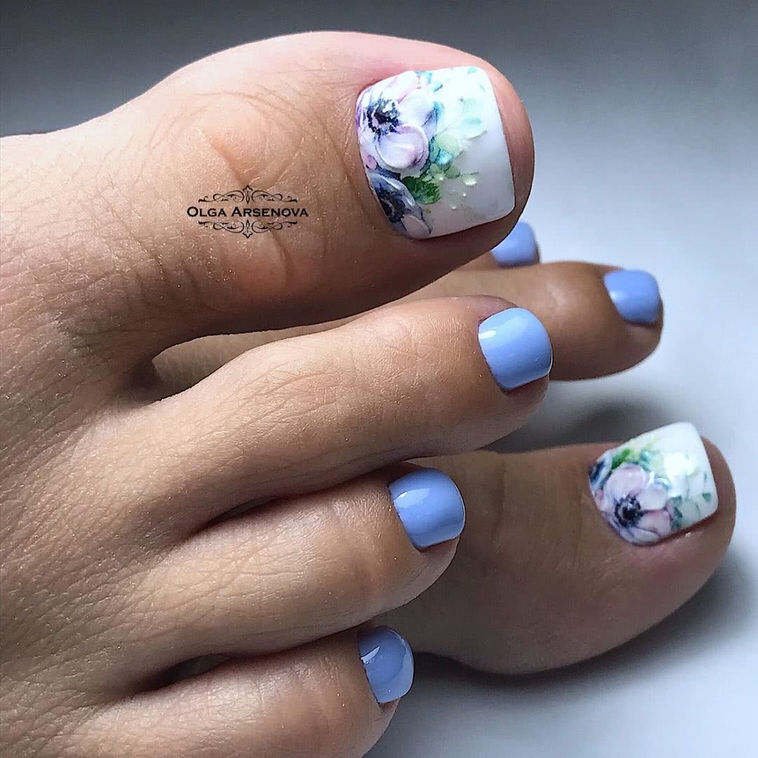С цветами. Цветочками модницы чаще всего украшают свой весенний или летний педикюр. Такой дизайн сочетается с голубым маникюром, если выполнен в одинаковой стилистике. Но что касается дизайна ногтей рук, то голубым чаще всего будет именно весенний или летний маникюр.