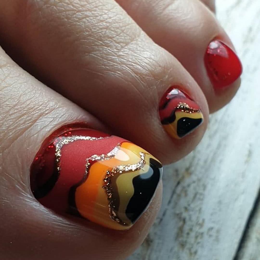 Втирка действительно привлекает внимание и выглядит очень эффектно. Такой прием может использоваться и частично и на всех пальцах ног и рук
