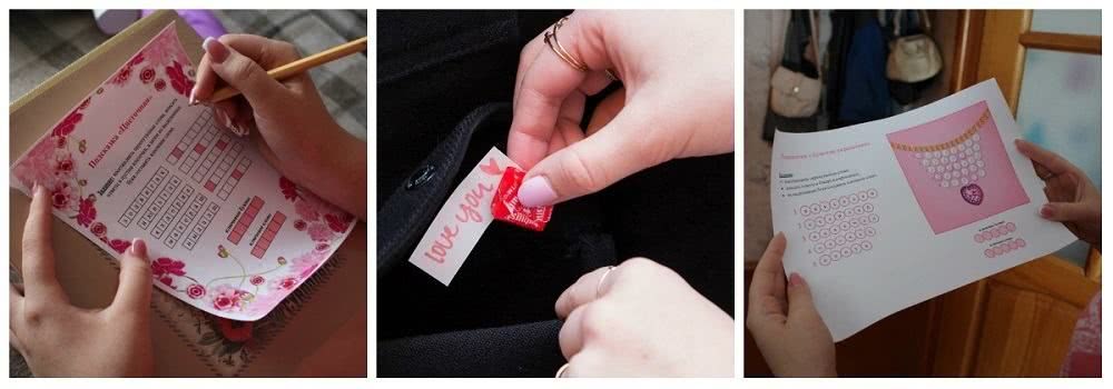 Задания не простые и не сложные, так как не стоит задача устроить интеллектуальную проверку для второй половинки. Цель — необычно преподнести подарок и поздравить. Здесь главную роль играет азарт поиска подсказок и ожидание награды в финале.