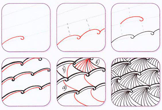 - Теперь можно попробовать нарисовать орнамент по др. технологии. Вместо точек в качестве основы орнамента следует нарисовать волны в 2 ряда. Затем от верхней части каждой волны следует нарисовать петельки.