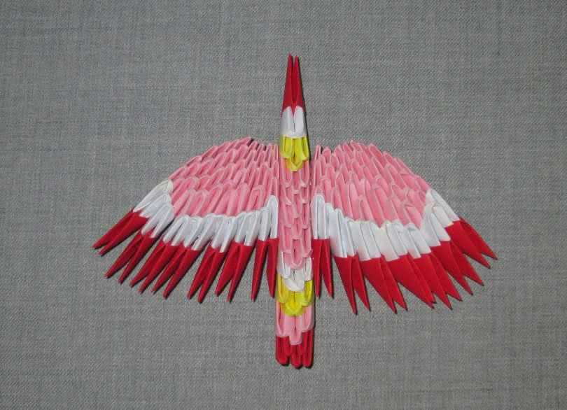 Крылья в собранном виде вставляем в прорезанное заранее отверстие, а затем раскрываем свободные края как можно шире. Хвост вклеиваем. Вот такая жар-птица из журавлика-оригами получается в итоге. Можно ещё сделать модели пышную корону, хотя она и так сказочно хороша.