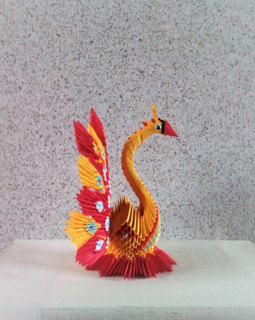Самый красивый уголок у модуля (находится у основы) по диагонали согнем его так, чтобы эта частица создала перпендикуляр к основе, и ее конец направился новым подгибом наружу в сторонку. Делаем голову и шейку лебедя, мы закончили. Хвост достаточно по параллельным диагоналям два раза подогнуть гармошечкой, и работа с этой птицей оригами закончена.