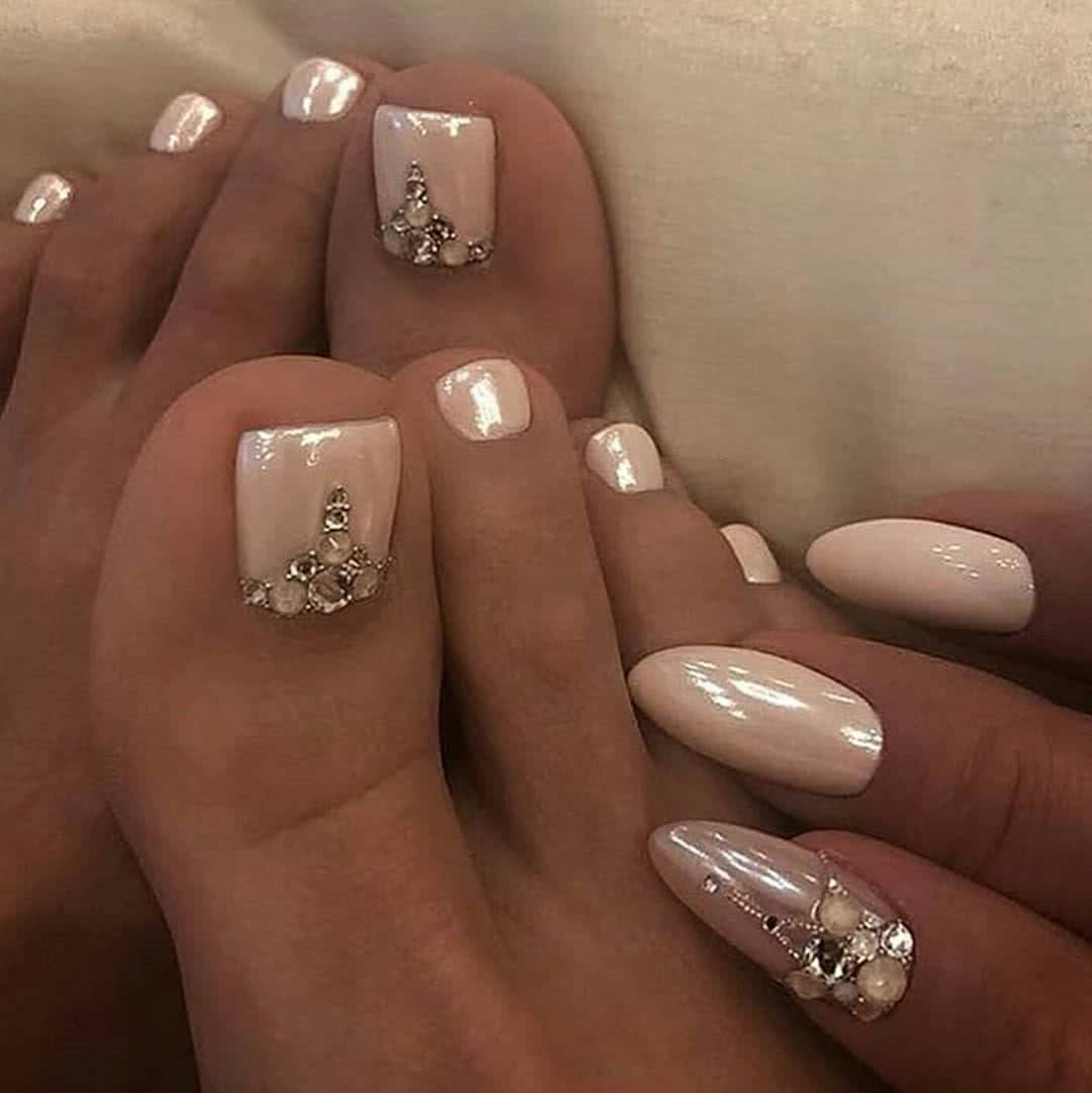 Такое решение как нельзя лучше подойдет к пляжному образу, важно лишь выбрать какой стиль станет вашим на этот сезон. В моду вновь возвращается гламур, а значит маникюр и педикюр с использованием стразов и украшений – вновь на пике популярности