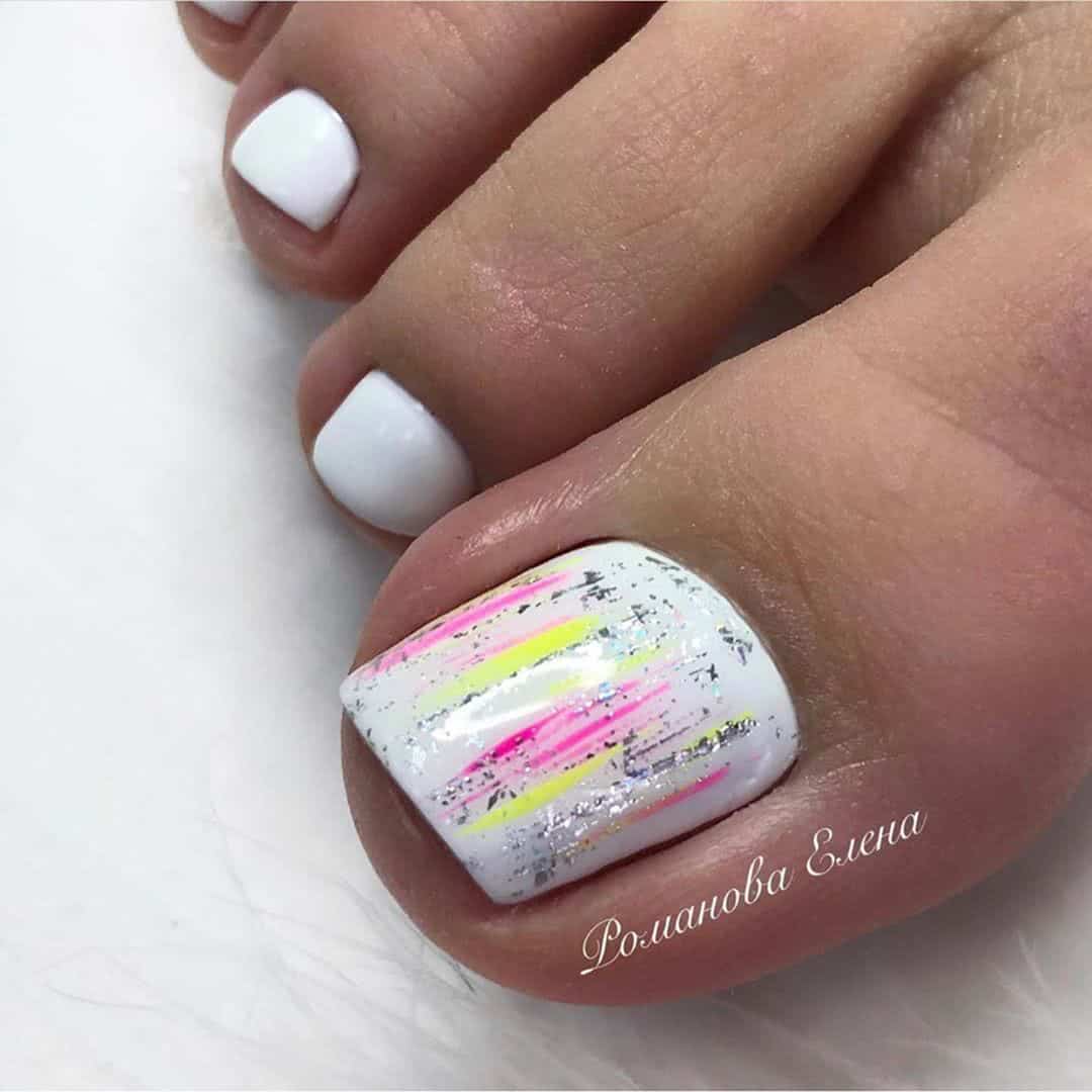 На этом примере представлен белый однотонный педикюр. Как видите, простой и, с одной стороны, немного скучный дизайн можно украсить кусочками серебристой фольги и рваными полосками ярких тонов. Таким образом получается красивый нежный педикюр в индивидуальном стиле.