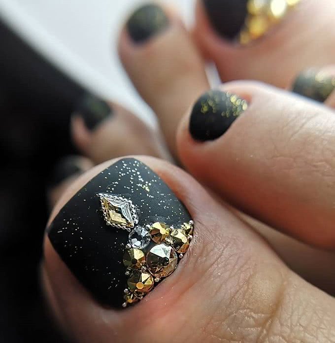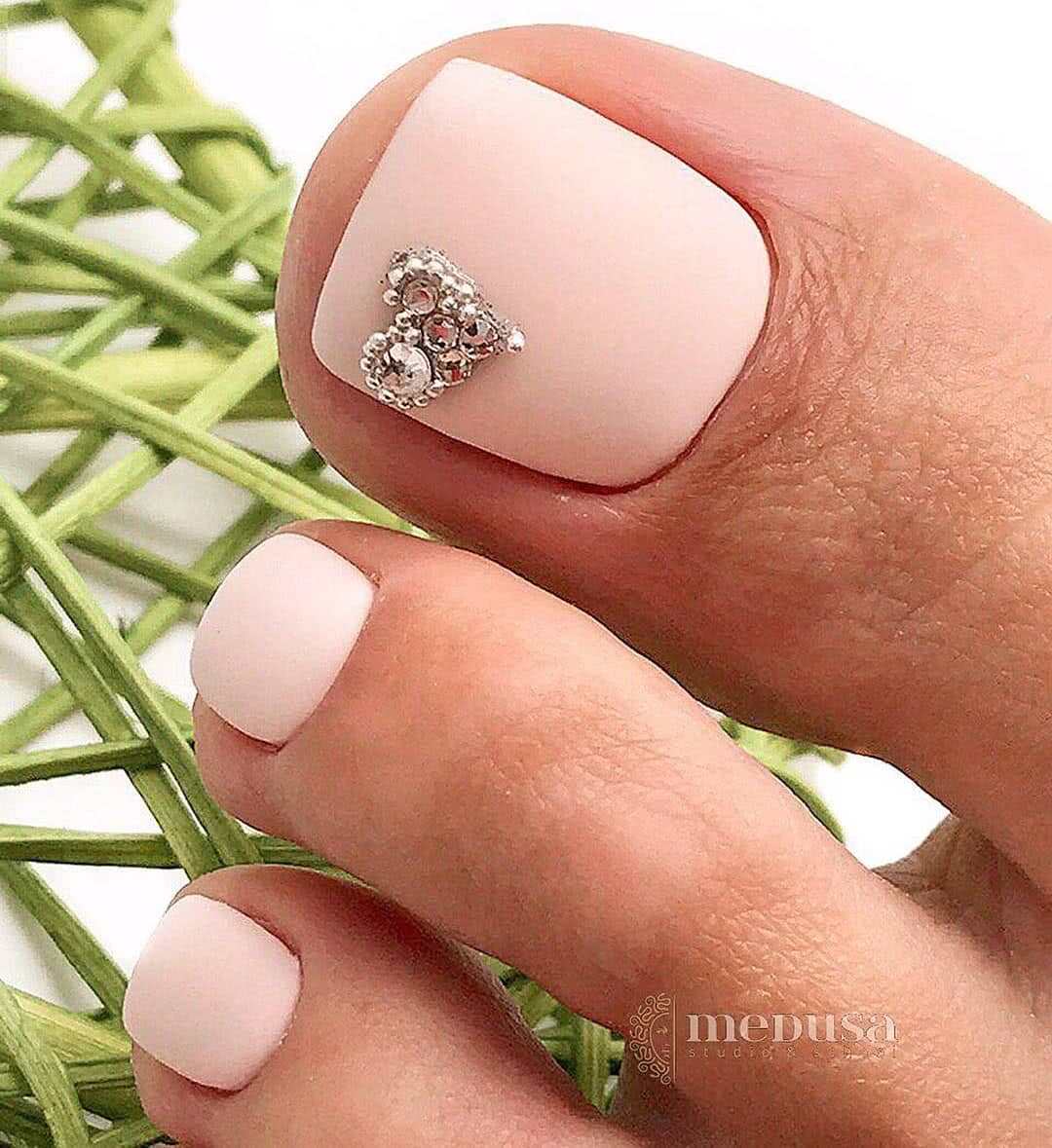 Однотонный педикюр перестанет быть скучным, если украсить его маленькими стразами, бульонками и полусферами. Украшения могут располагаться на большом ноготке, тогда как остальные остаются без дизайна. Как вариант – украсить остальные ноготочки маленькими точечками страз.